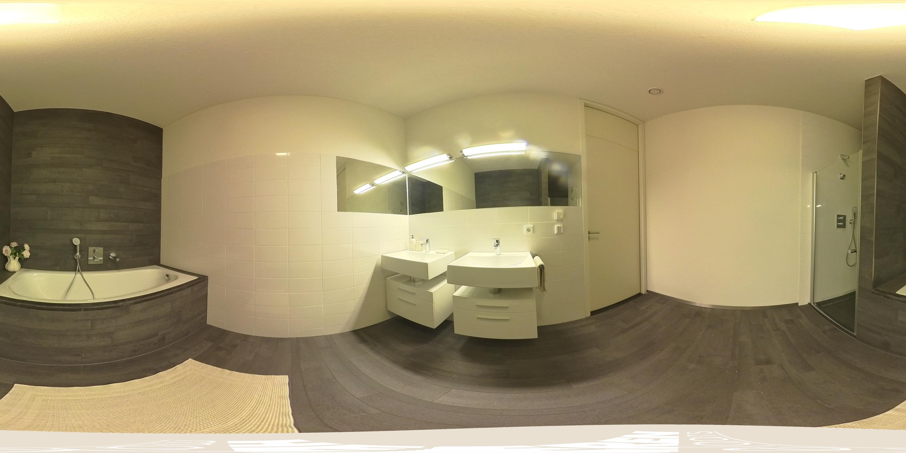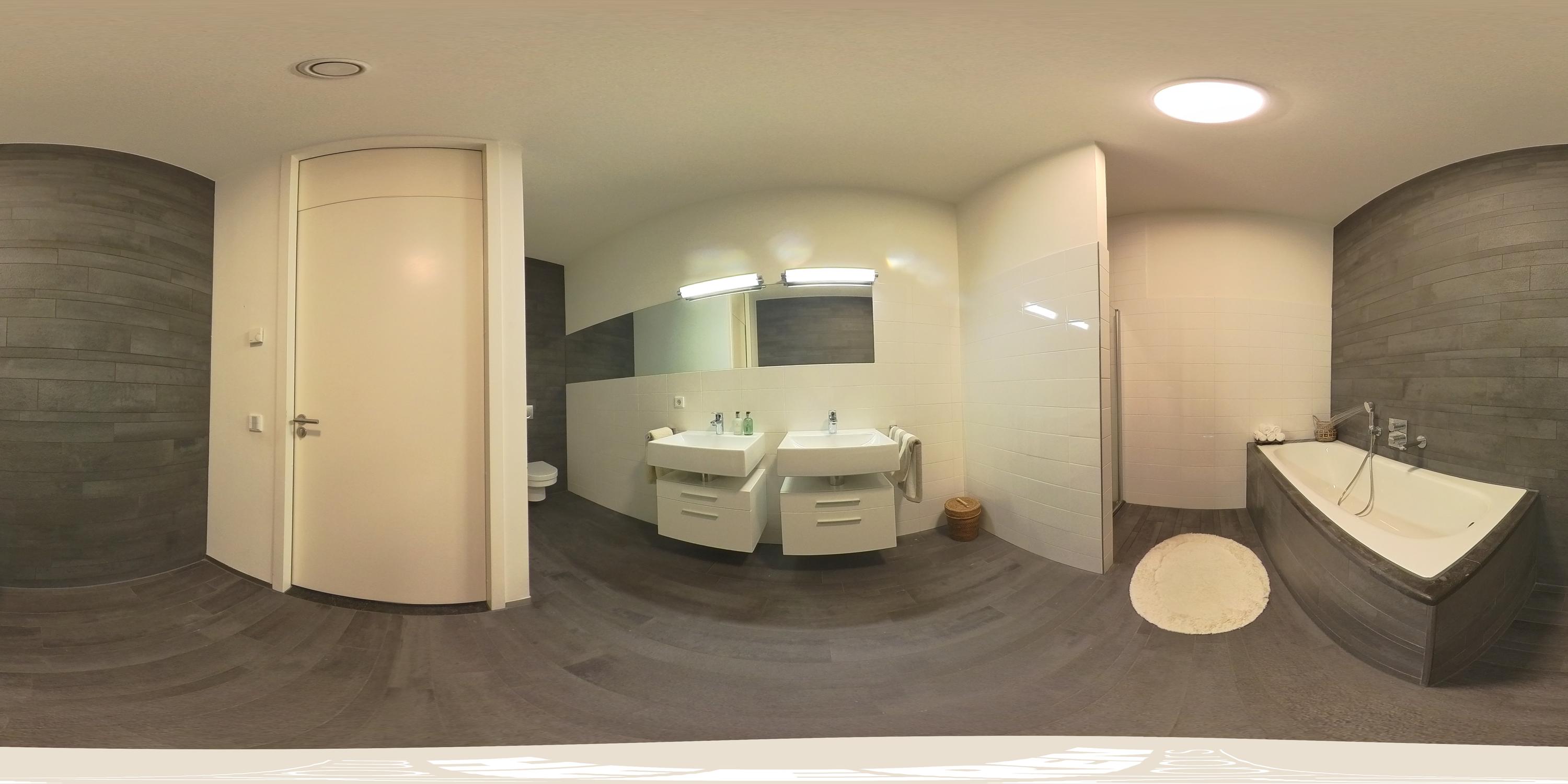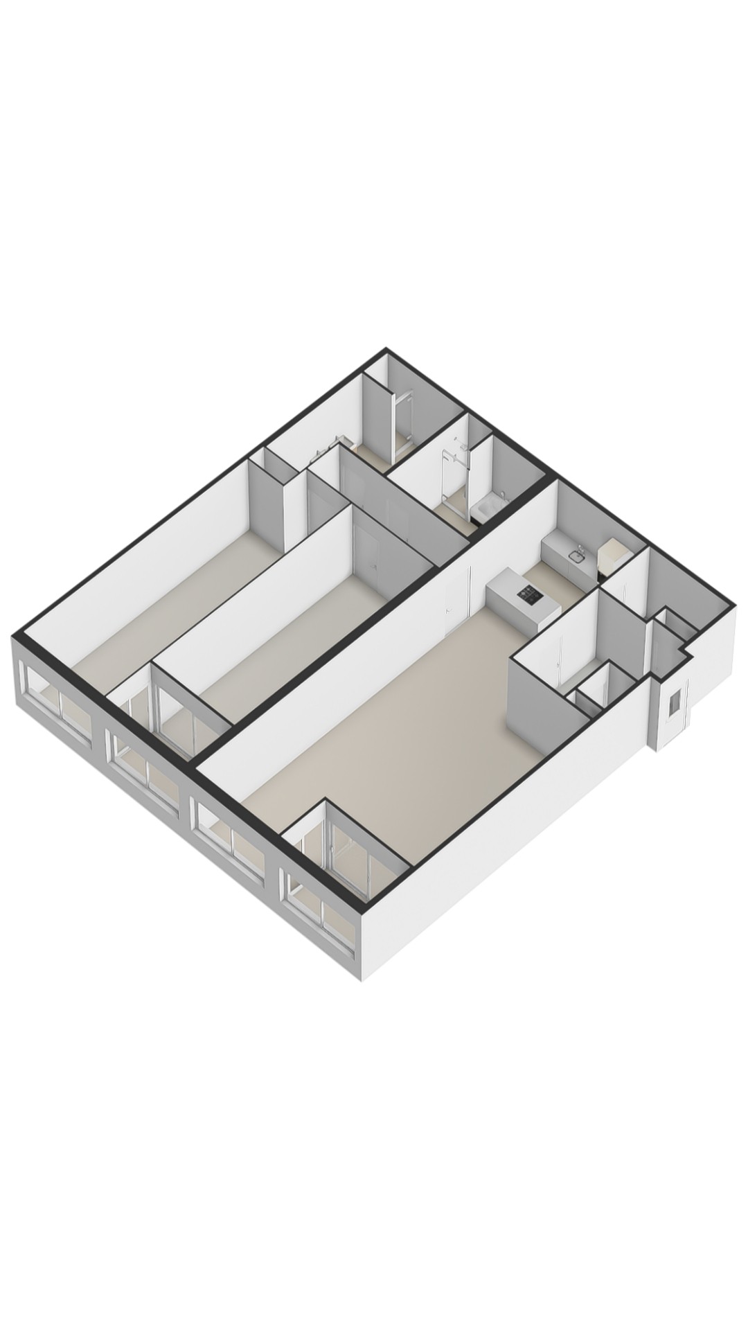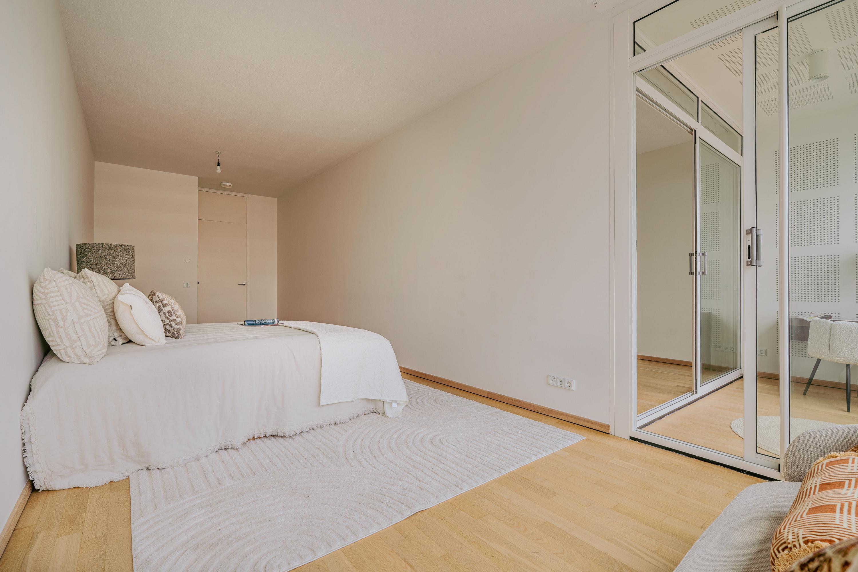 Een tweede hal verbindt de woonruimte met de slaapvertrekken aan de voorzijde en badkamers aan de achterzijde. Beide slaapkamers zijn opvallend ruim en over de lengte gestrekt, wat zorgt voor een open en rustgevende sfeer. De hoofdslaapkamer beschikt eveneens over een serre en voelt daardoor extra ruimtelijk aan. Achterin bevinden zich twee moderne badkamers, elk met dubbele wastafelmeubels, een ligbad en inloopdouche.