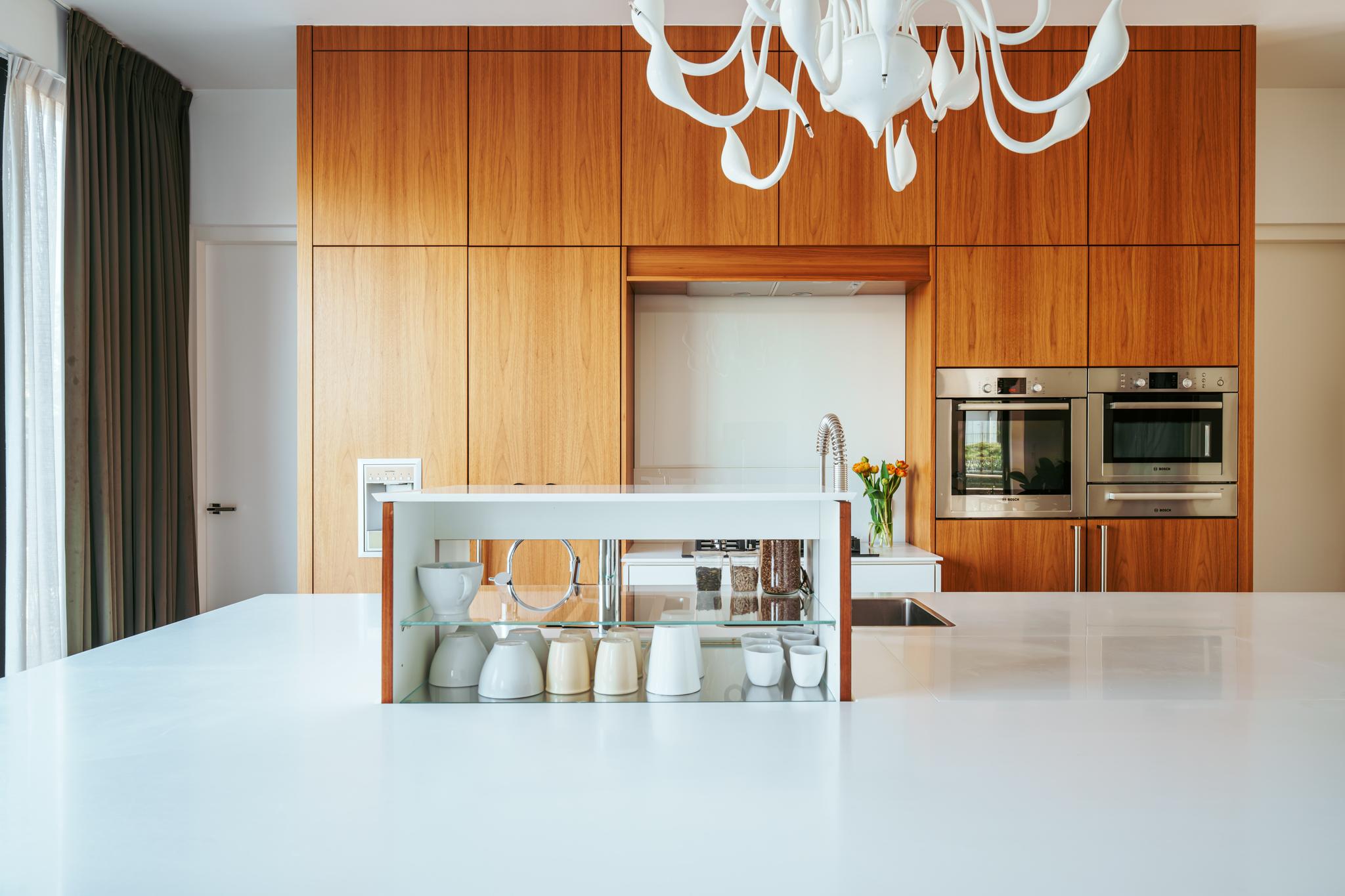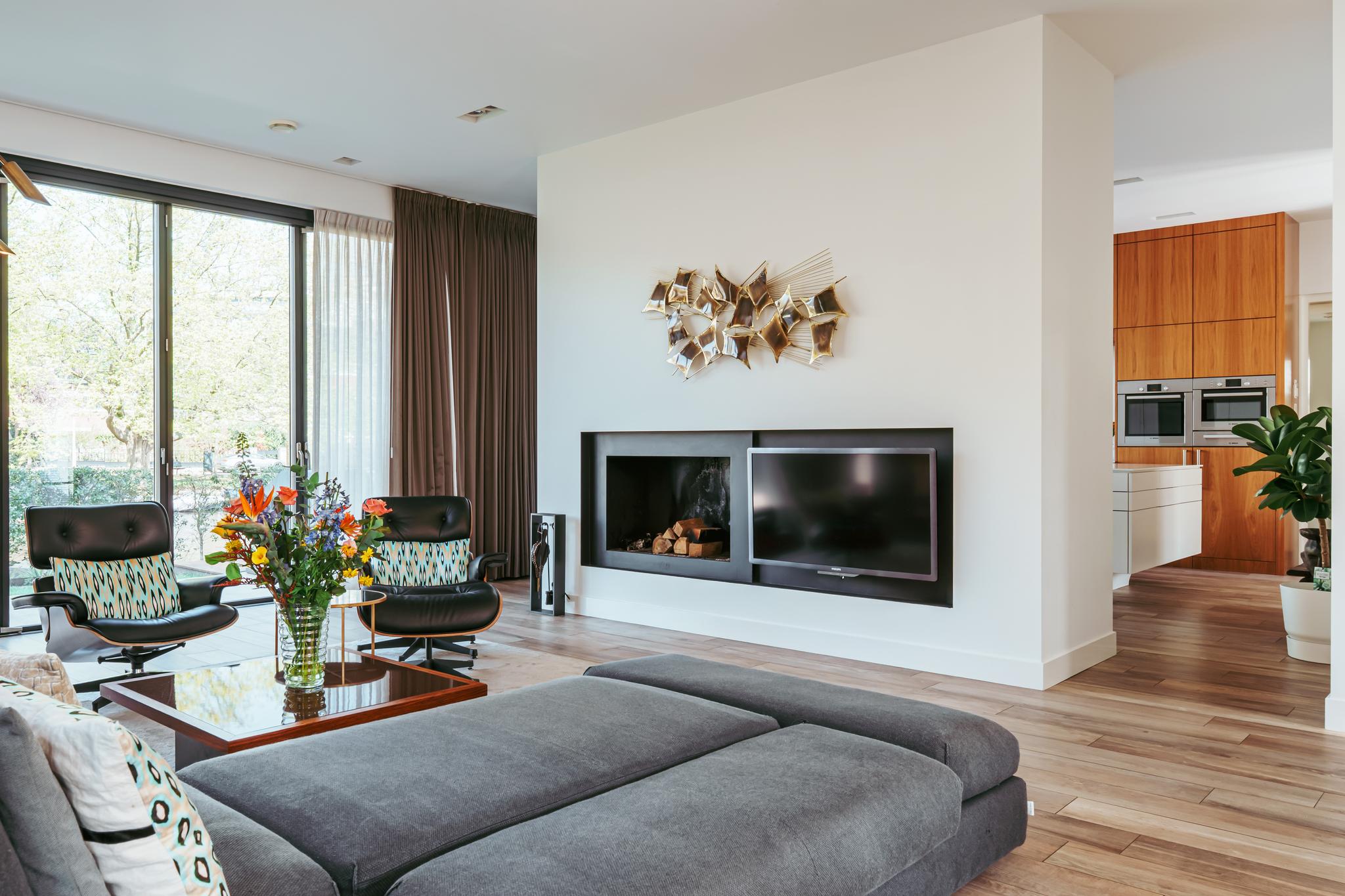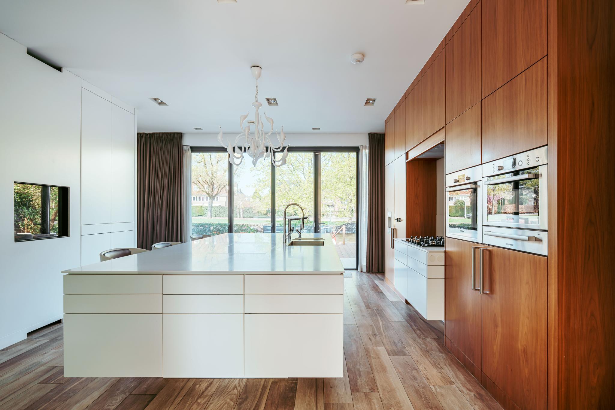 Entree; middels de hal met garderobe en separaat toilet bereikt u het leefgedeelte van de woning. Stalen deuren geven toegang tot de royale eet en woonkamer, welke is voorzien van een open haard en openslaande deuren naar zowel de voor- als achtertuin. Grote raampartijen zorgen voor een prettige lichtinval en verbinden de ruimte op natuurlijke wijze met de buitenomgeving. Grenzend aan de woonkamer bevindt zich de ruim opgezette woonkeuken. Deze is uitgerust met een centraal spoeleiland met dubbele spoelbak, dubbele vaatwasser, Quooker en een uitschuifbare pantry. Aan de overzijde bevindt zich het kookgedeelte, voorzien van een vijfpits gasfornuis, een verborgen kruidenkabinet, een royale Amerikaanse koelkast met geïntegreerde water- en ijsdispenser, en veel opbergruimte. Ook zijn er twee ovens en een warmhoudlade van Bosch ingebouwd. De keuken beschikt daarnaast over een eigen gashaard, welke samen met de open haard in de woonkamer is geïntegreerd in één dubbele wand. Openslaande deuren in de keuken bieden toegang tot de achtertuin met aanlegsteiger, geschikt voor het aanmeren van een boot.