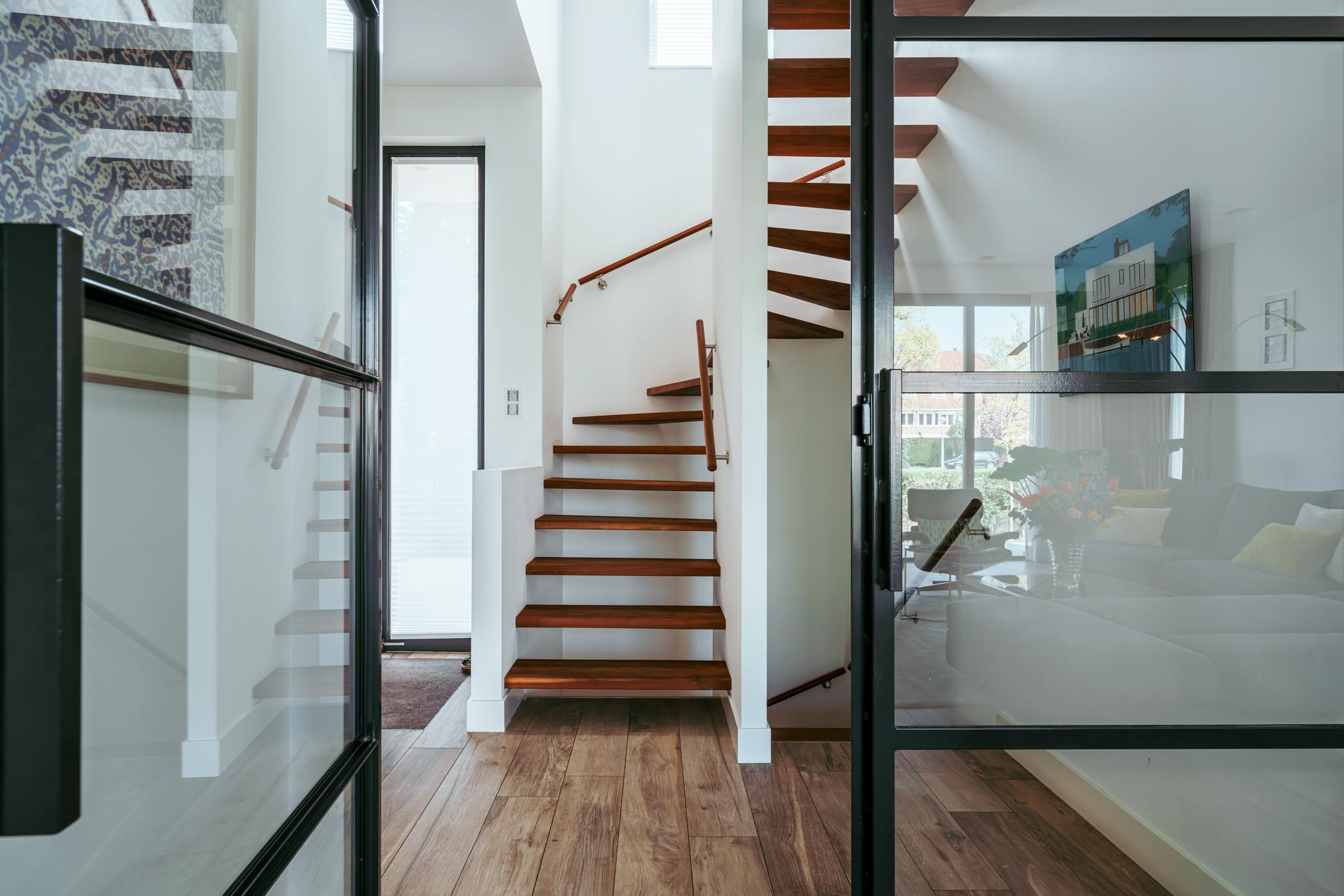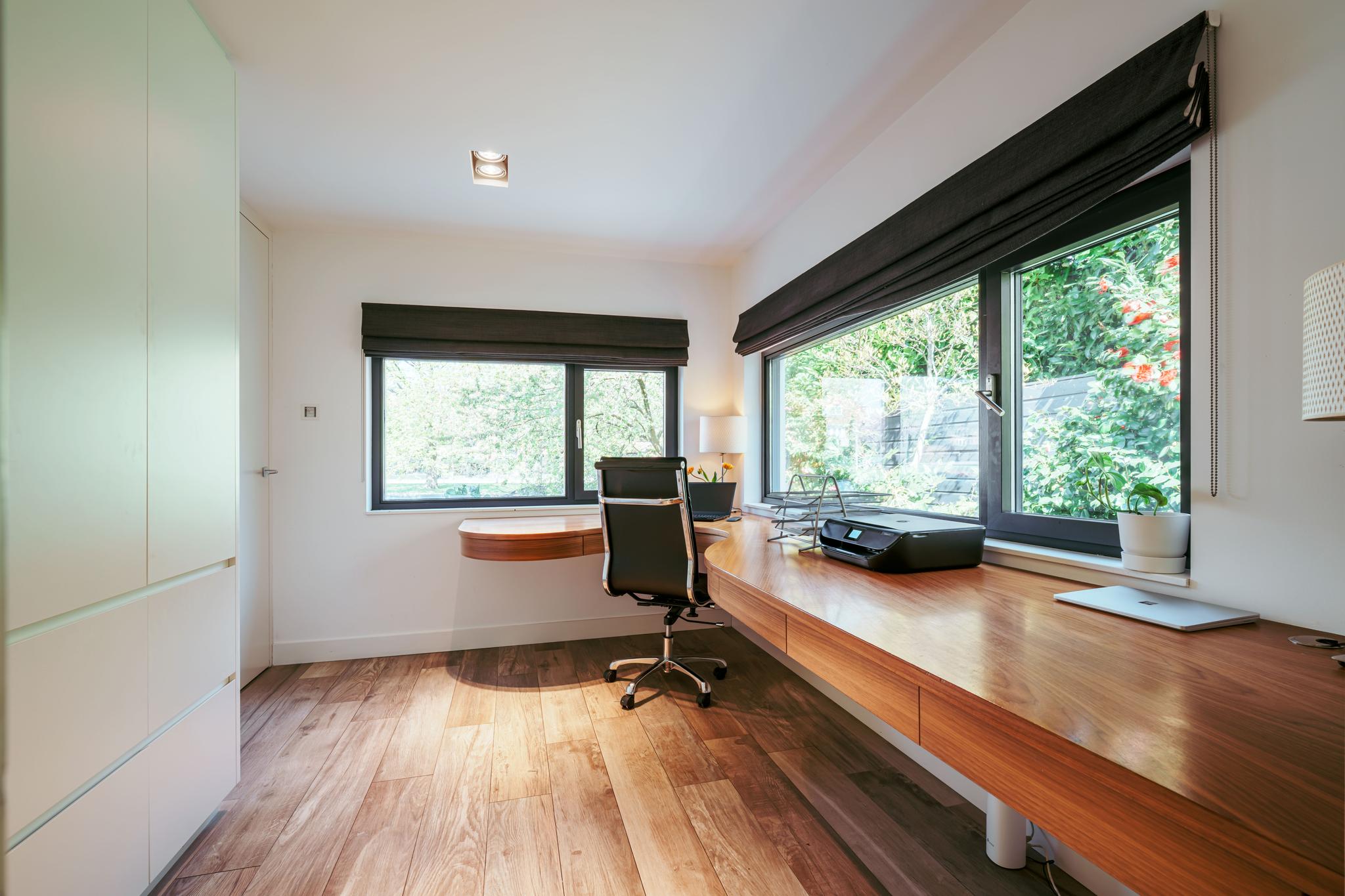 Aangrenzend aan de keuken ligt de bijkeuken met extra opslagruimte, welke doorloopt naar een complete badkamer voorzien van een inloopdouche en wastafel. Vanuit deze ruimte heeft u binnendoor toegang tot de ruime garage, geschikt voor fietsen, berging of werkruimte. Aan de achterzijde van de woning bevindt zich een werkkamer met zicht op de tuin. Aan de rechterzijde ligt een multifunctionele kamer, momenteel ingericht als gym, welke afsluitbaar is middels stalen schuifdeuren.
