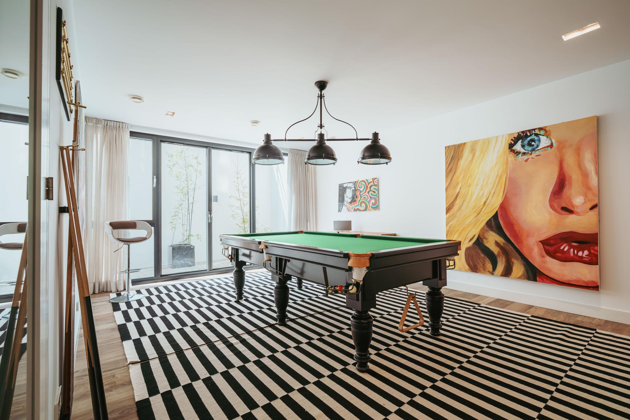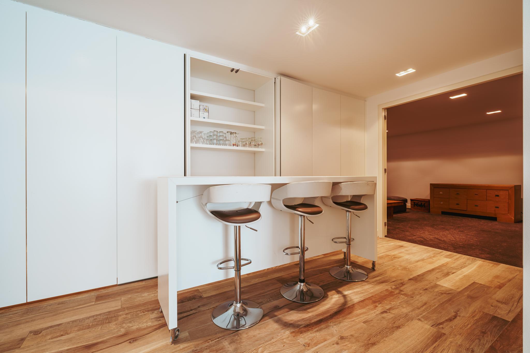 - Souterrain met hoge plafonds, royale bergruimte, thuisbioscoop en bar;