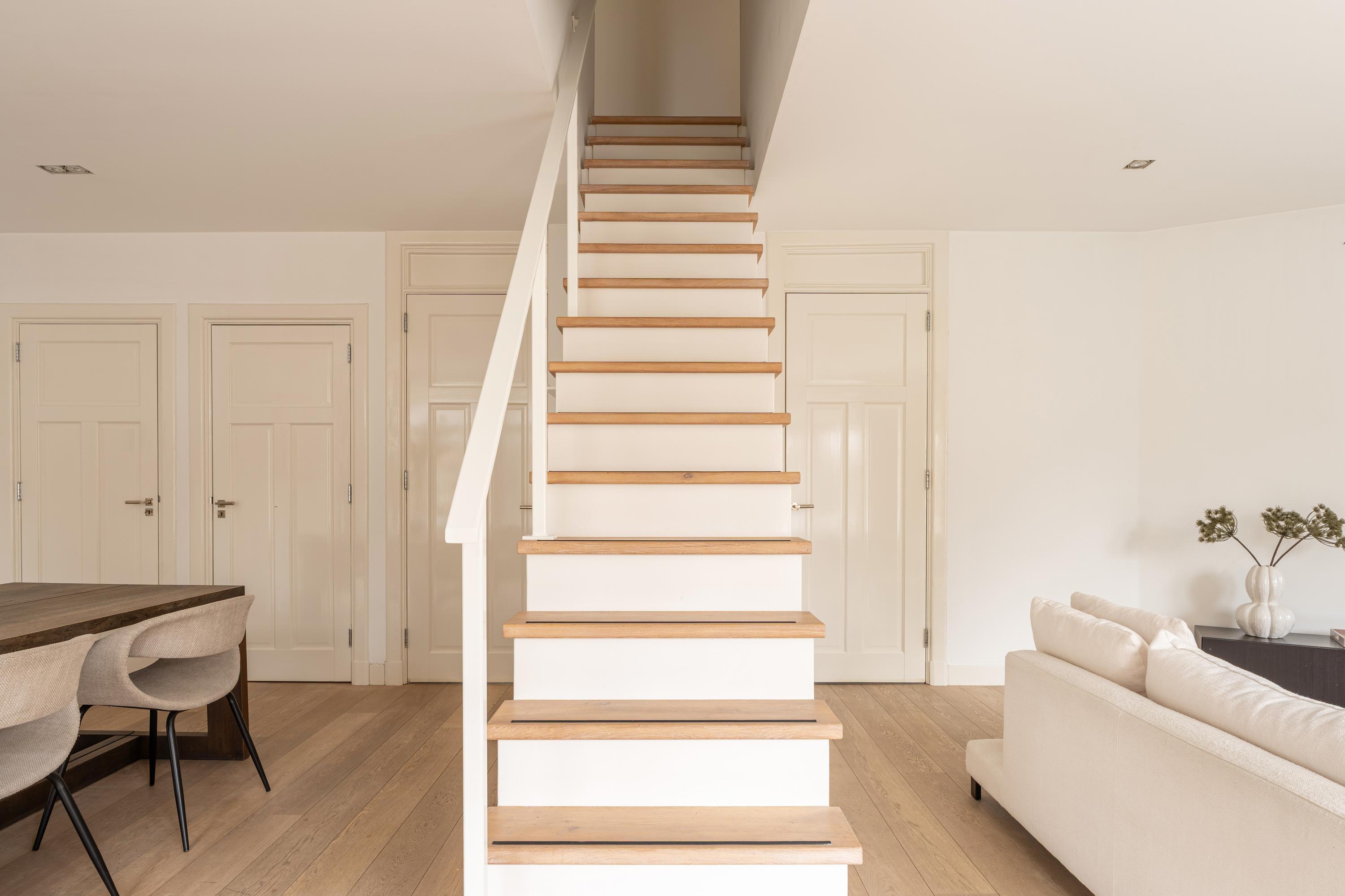 Via de ruime overloop bereikt u de bijzonder royale en lichte woonkamer, voorzien van een sfeervolle haard en een centraal geplaatste trap die de ruimte op speelse wijze indeelt in een zit- en eetgedeelte. Dankzij de vele raampartijen geniet de woonkamer van een prettige lichtinval. Daarnaast is er volop bergruimte aanwezig in de vorm van op maat gemaakte, ingebouwde kasten. De keuken is aan de achterzijde van de woning gesitueerd en uitgerust met een 4-pits gasfornuis met afzuigkap, oven, vaatwasser en een koel-vriescombinatie. Ook hier is voldoende kastruimte aanwezig. Op deze verdieping bevindt zich tevens de eerste slaapkamer, welke beschikt over een en-suite badkamer. Deze badkamer is voorzien van een inloopdouche en een wastafel met meubel. Een separaat toilet is toegankelijk vanuit de ruime hal.