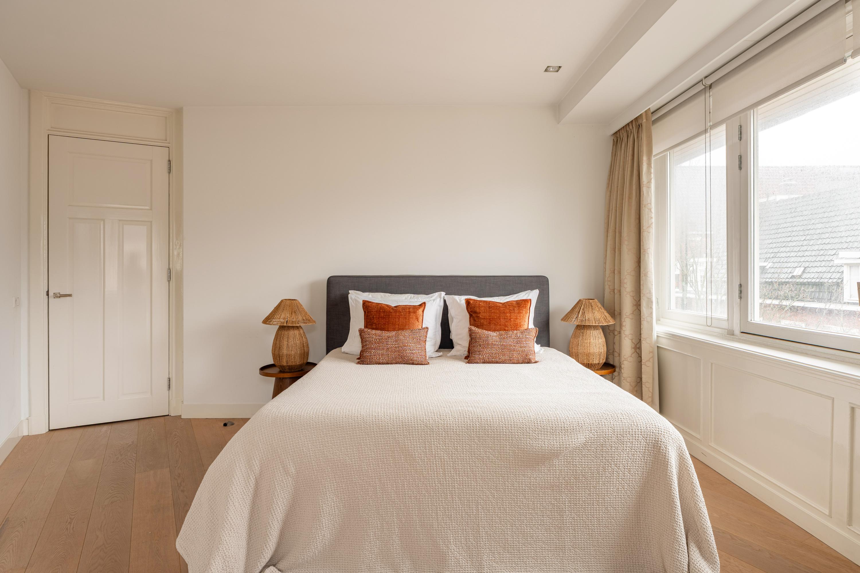 Via de trap in de woonkamer bereikt u de derde en tevens bovenste verdieping van het appartement. Hier bevinden zich twee goed bemeten slaapkamers, beide voorzien van grote raampartijen en maatwerk inbouwkasten. De master bedroom beschikt bovendien over een stijlvol geïntegreerde televisie in de kastenwand. De moderne badkamer is uitgerust met een ruim ligbad, een dubbele wastafel met meubel en een toilet. Tevens bevinden zich hier de aansluitingen voor wasmachine en droger.