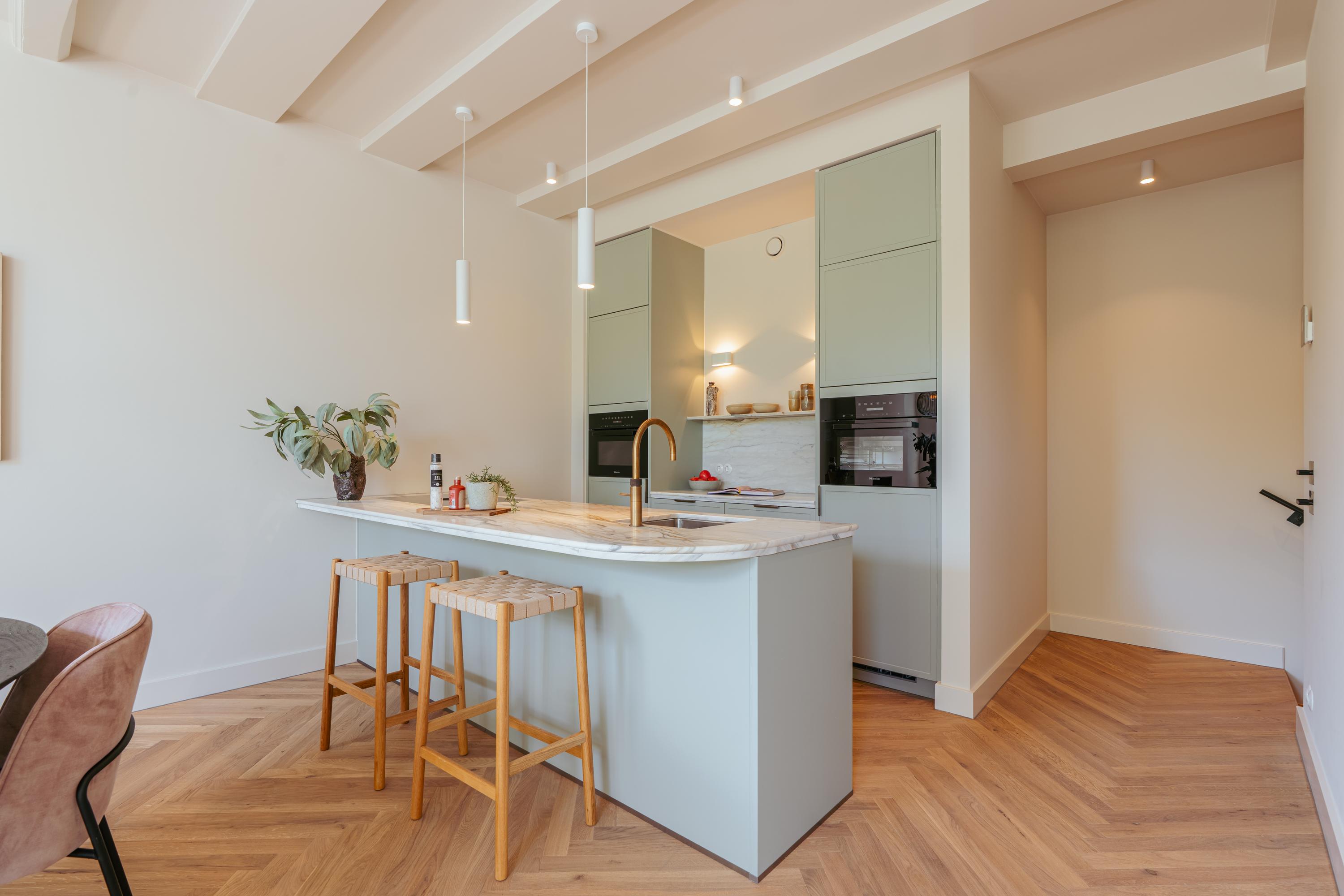De living en woonkeuken zijn gesitueerd op split level, wat zorgt voor een speels en ruimtelijk effect. De keuken is voorzien van alle denkbare inbouwapparatuur waaronder een Quooker, Siemens Studioline combioven en oven, Bora inductieplaat met geïntegreerde afzuiging, vaatwasser en meer dan genoeg opbergruimte. Een marmeren blad en messing details maken het geheel af! Het bargedeelte met marmeren blad en houten barkrukken maakt deze ruimte perfect voor zowel uitgebreid koken als ontspannen borrelen. De woonkamer aan de voorzijde heeft drie imposante hoge ramen met uitzicht op de majestueuze Keizersgracht. Hier valt het daglicht prachtig naar binnen en creëert in combinatie met de plafondbalken een warme sfeer. Een moderne gashaard vormt het knusse middelpunt van deze ruimte en geeft het extra sfeer.
