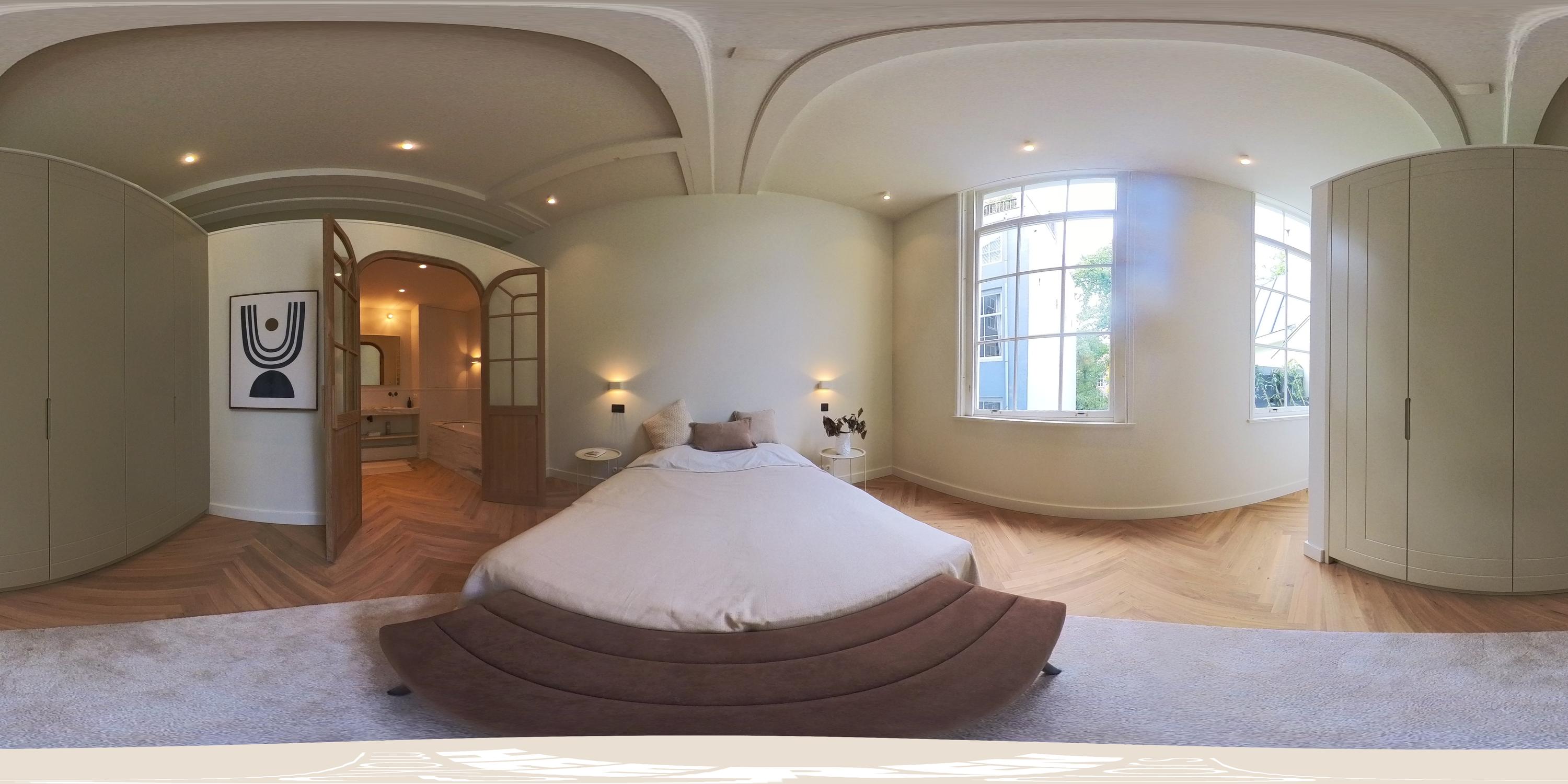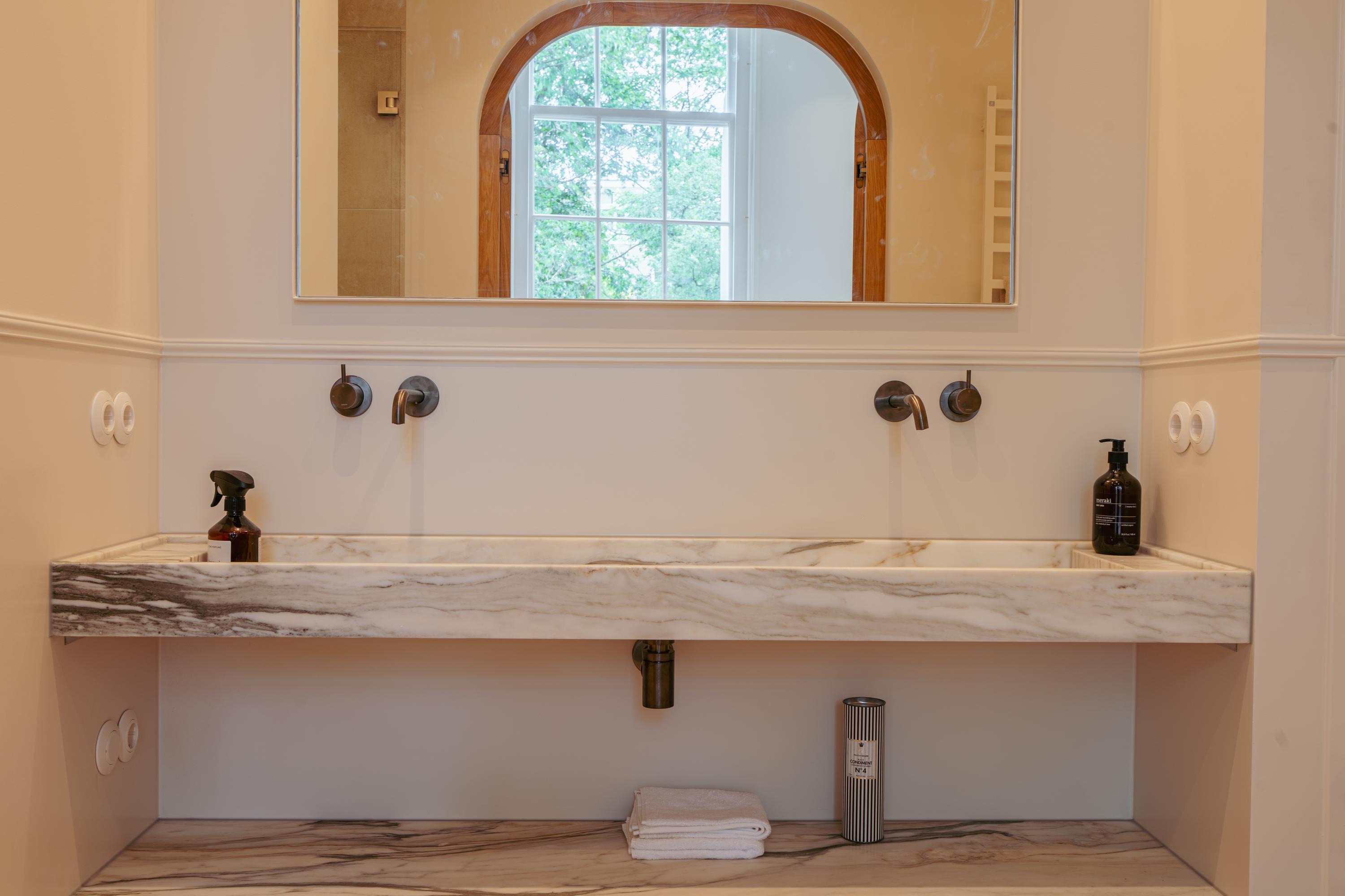 Via de hal bereikt u de hoofdslaapkamer met badkamer en-suite. Karakteristieke houten boogdeuren leiden tot de royale badkamer voorzien van een ligbad, dubbele wastafel, beide uitgevoerd in prachtig marmer. Openslaande deuren verschaffen de toegang naar de regendouche. Deze slaapkamer is voorzien van een kastenwand met op maat gemaakte inbouwkasten en boven de wastafel is extra bergruimte gecreëerd. Aan de achterzijde van het appartement bereikt u de tweede badkamer met inloopregendouche en dubbele wastafel en de tweede goed bemeten slaapkamer die uitkijkt op de groene tuinen.