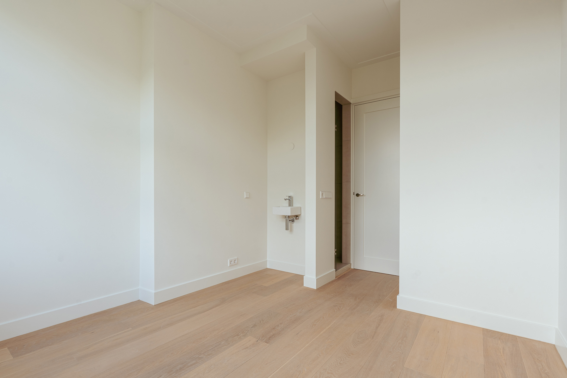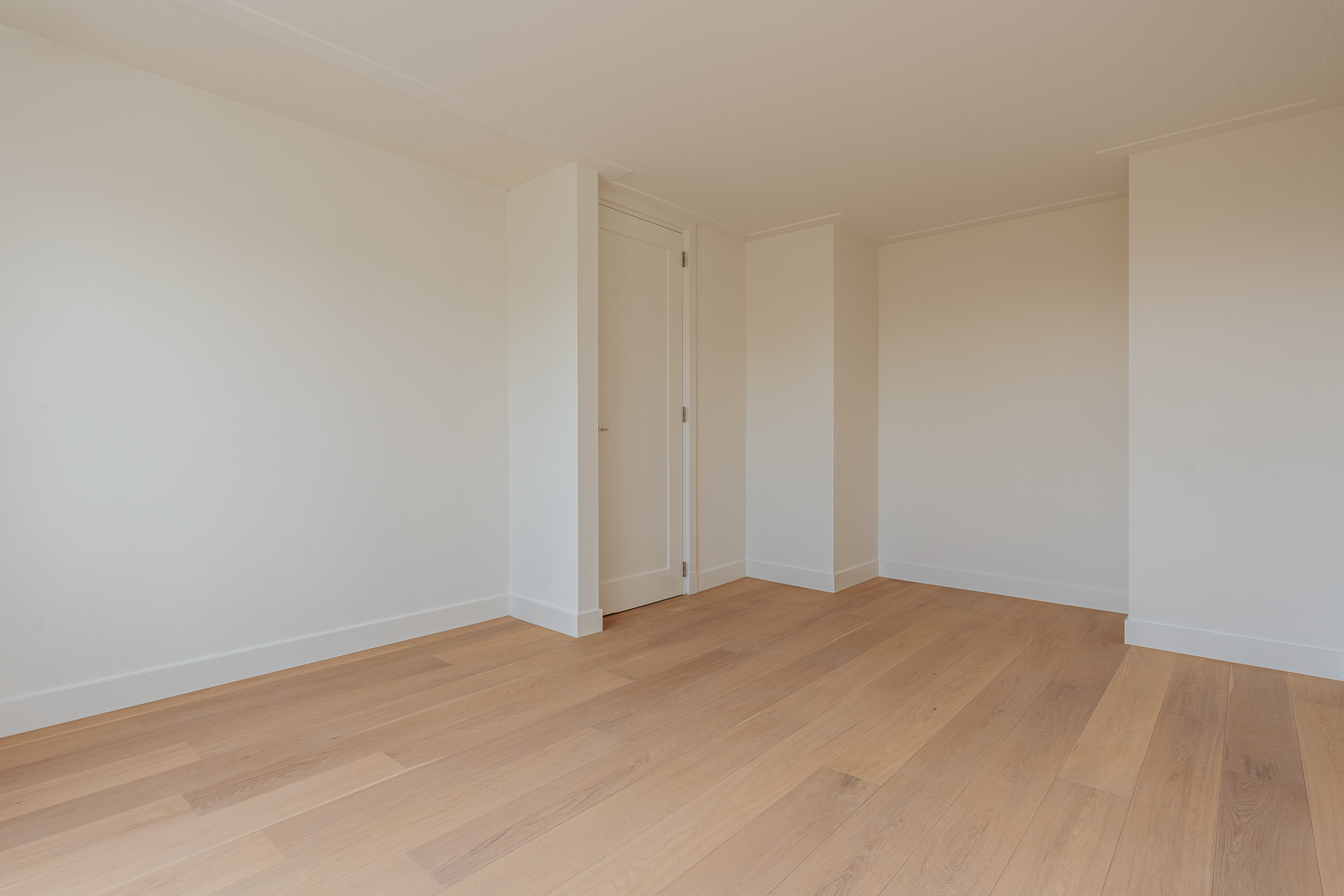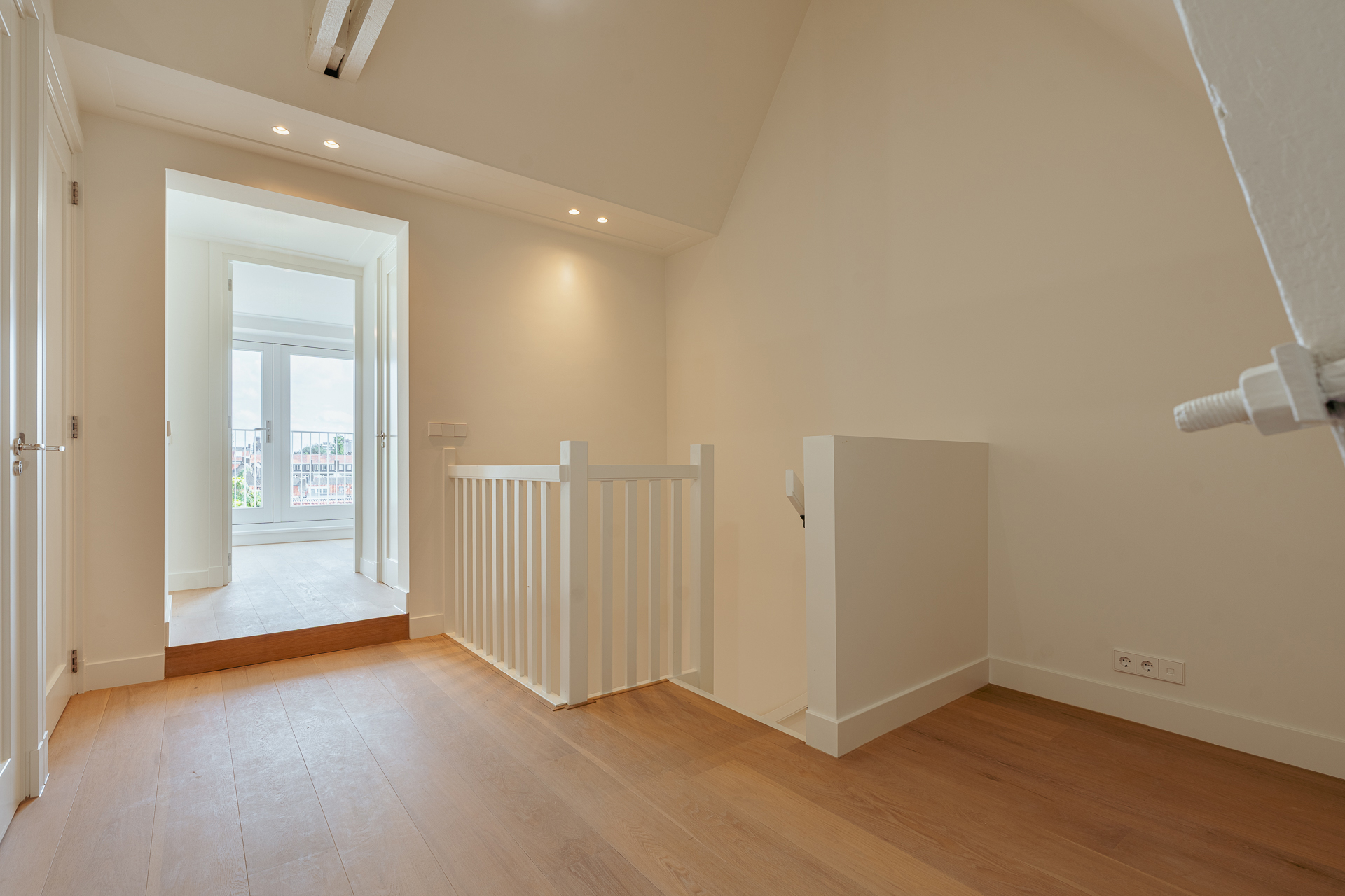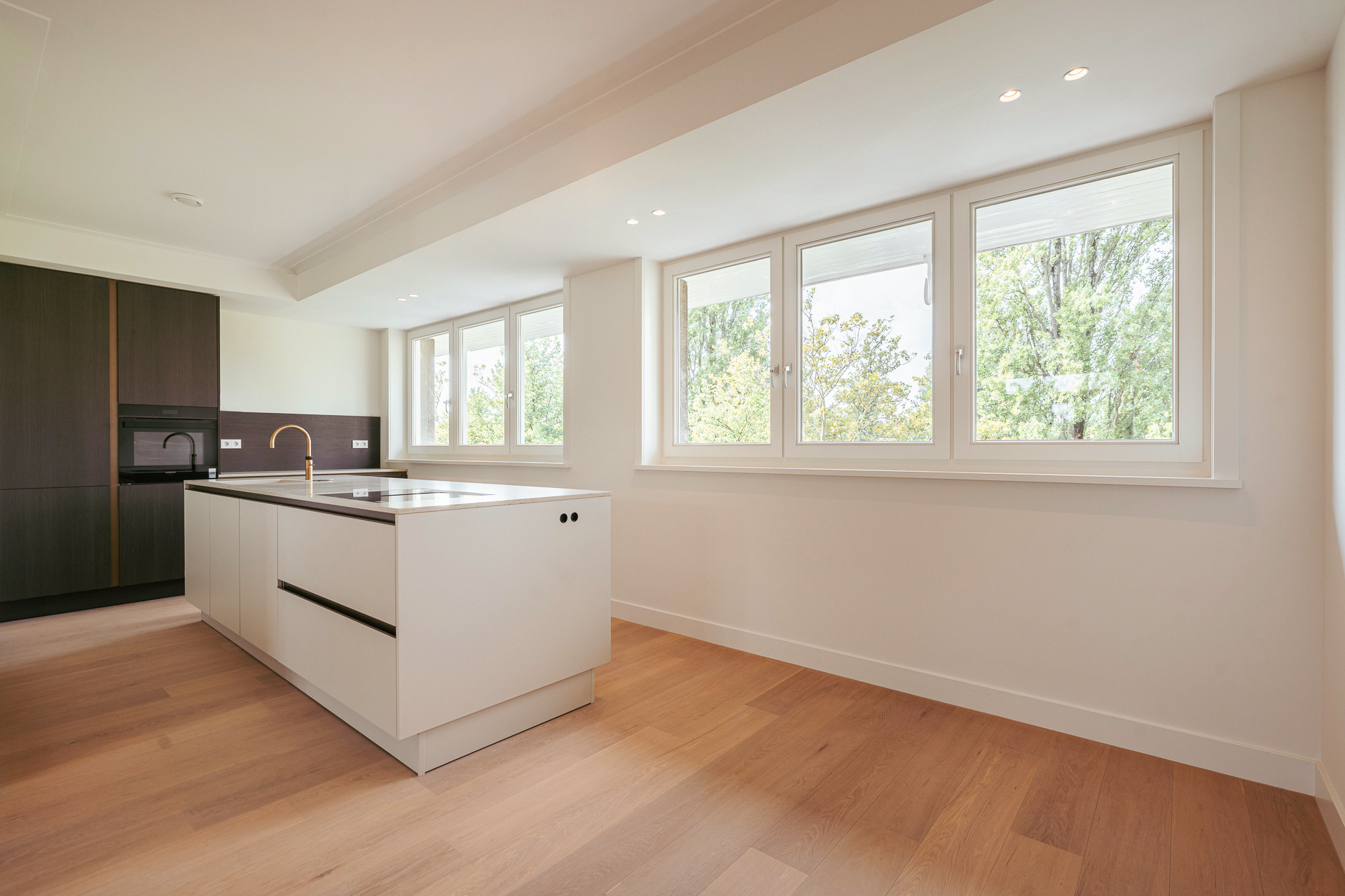 De open keuken is een echte eyecatcher en is voorzien van hoogwaardige inbouwapparatuur: een inductiekookplaat met geïntegreerde afzuiging, vaatwasser, combi-oven en Quooker kraan. De combinatie van strakke, greeploze kasten en warme houtaccenten geeft deze verdieping een moderne, maar sfeervolle uitstraling. Vanuit de woonkamer heeft u toegang tot een zonnig balkon gelegen op het zuidoosten, ideaal voor een kop koffie of een borrel in de middagzon.