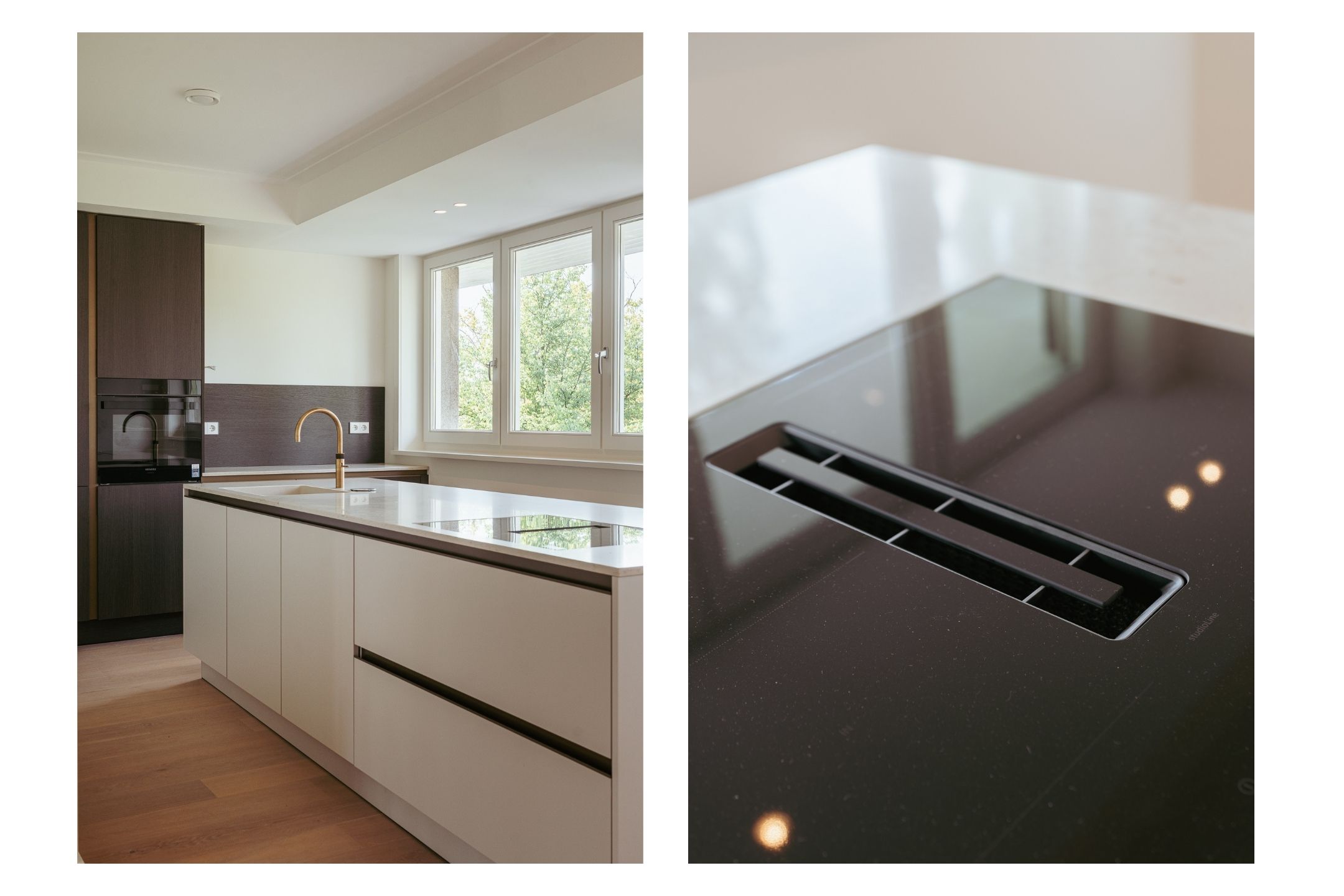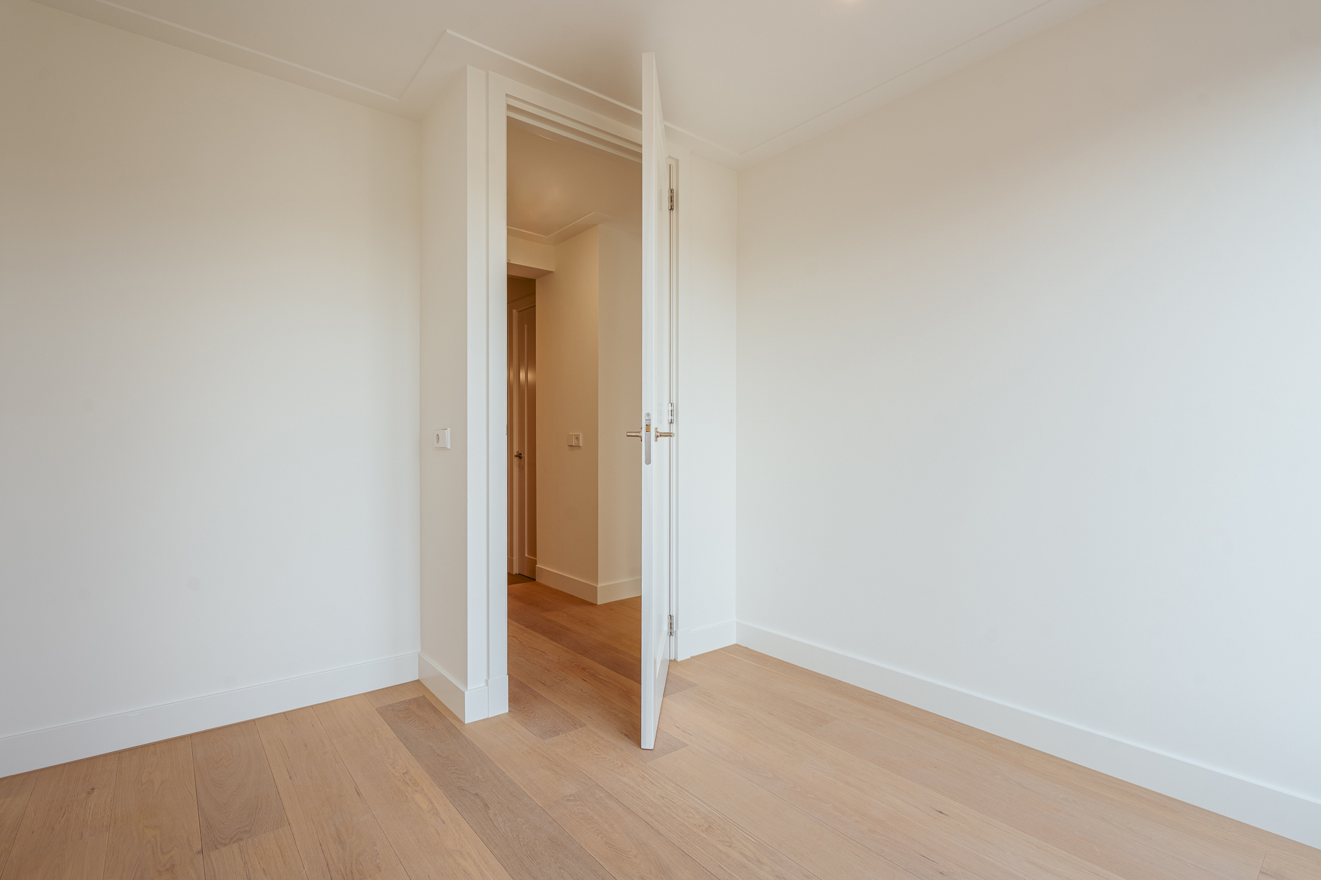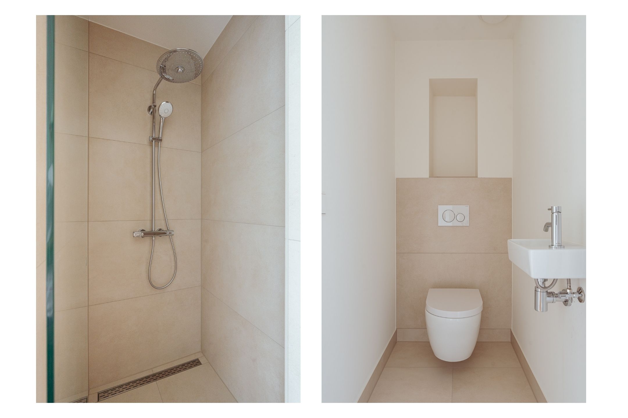 De open keuken is een echte eyecatcher en is voorzien van hoogwaardige inbouwapparatuur: een inductiekookplaat met geïntegreerde afzuiging, vaatwasser, combi-oven en Quooker kraan. De combinatie van strakke, greeploze kasten en warme houtaccenten geeft deze verdieping een moderne, maar sfeervolle uitstraling. Vanuit de woonkamer heeft u toegang tot een zonnig balkon gelegen op het zuidoosten, ideaal voor een kop koffie of een borrel in de middagzon.