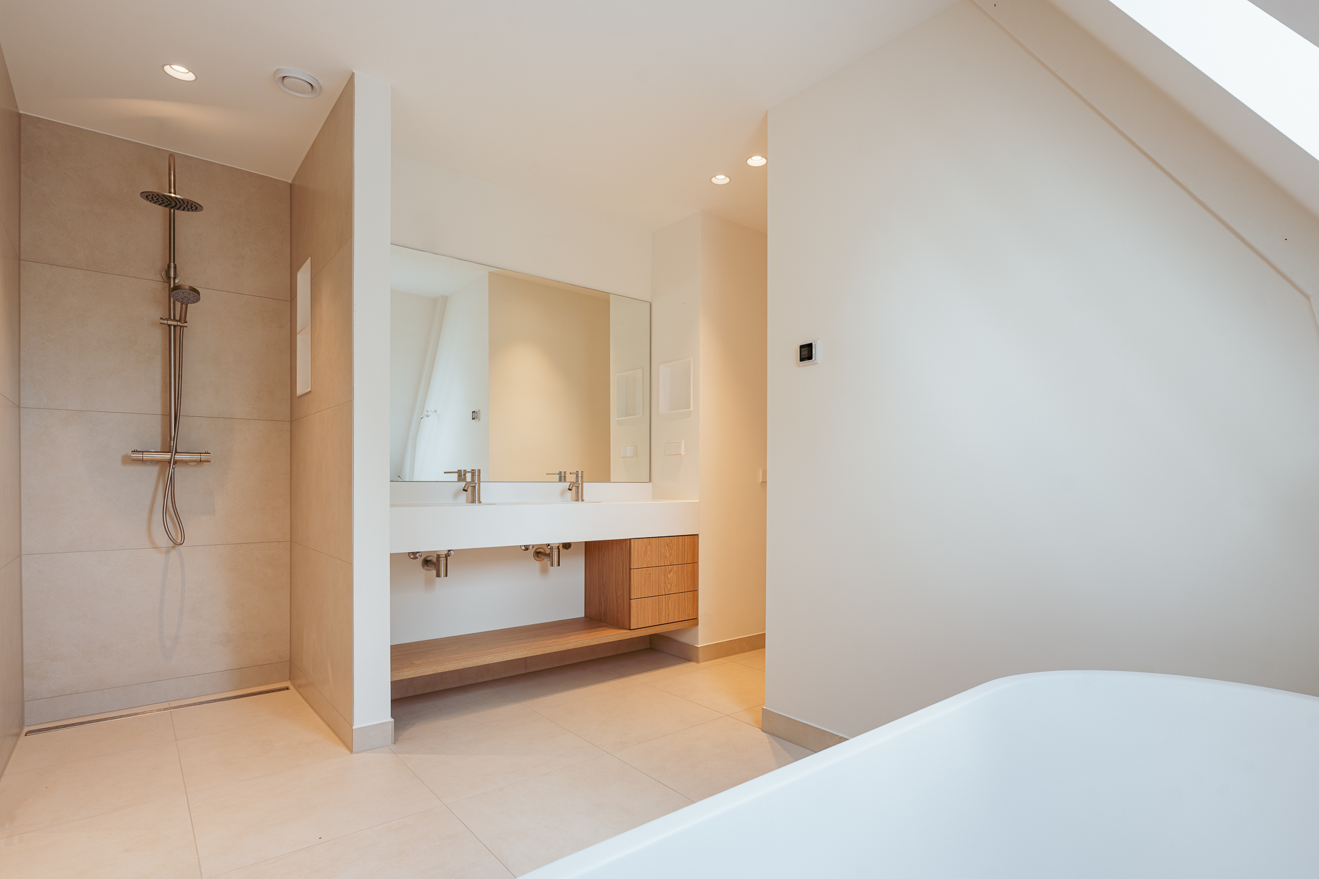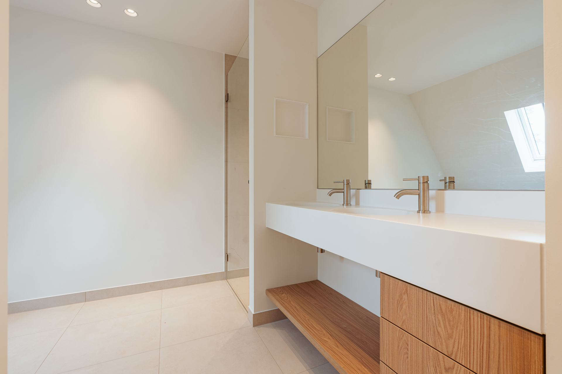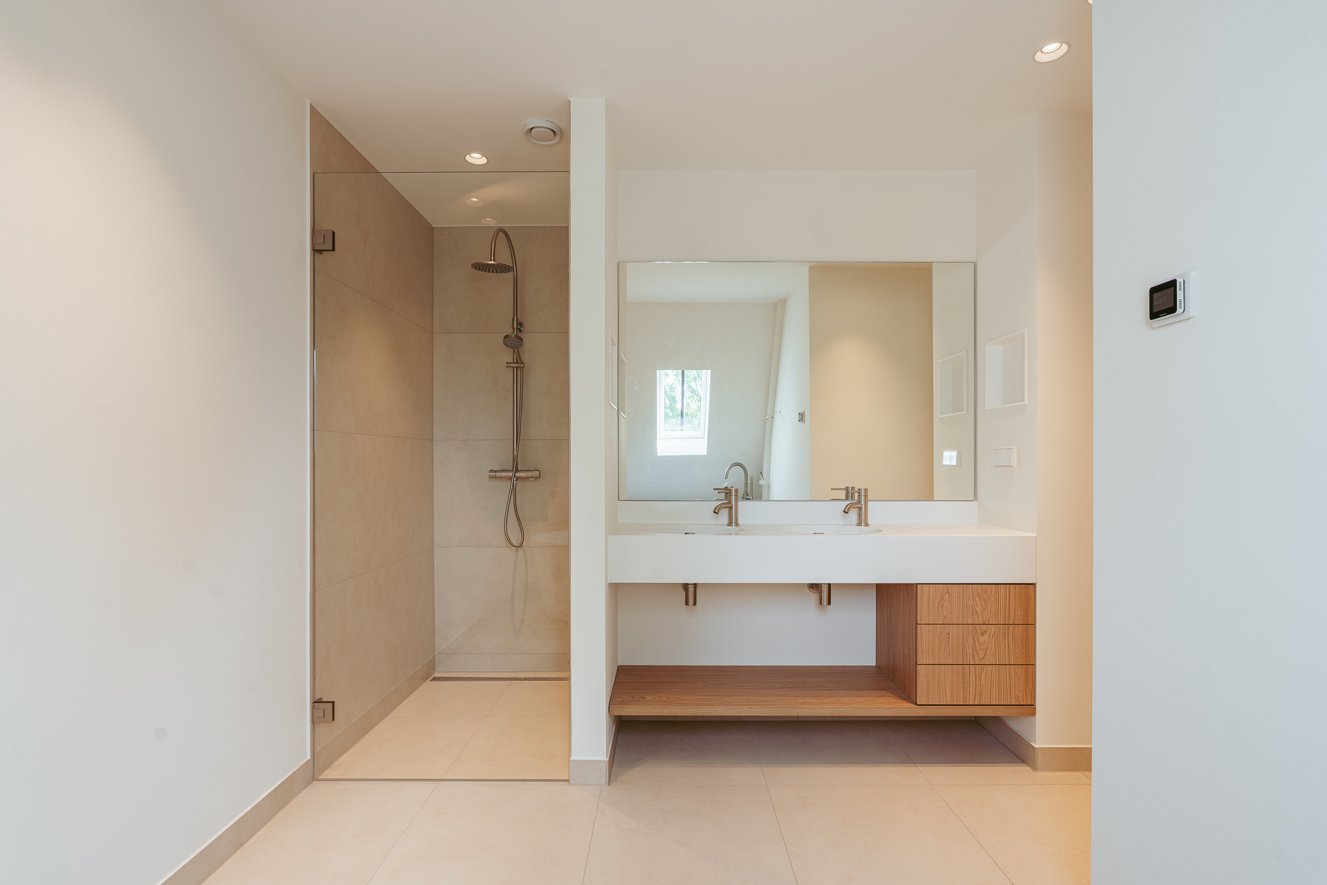 Aan de achterzijde bevindt zich een aparte slaapkamer met eigen douche en wastafel. Deze ruimte leent zich perfect als gastenverblijf of au pair-kamer omdat het beschikking heeft over een eigen wasruimte. Uiteraard zou deze kamer ook een andere functie kunnen dienen, zoals een werk- of studeerkamer.