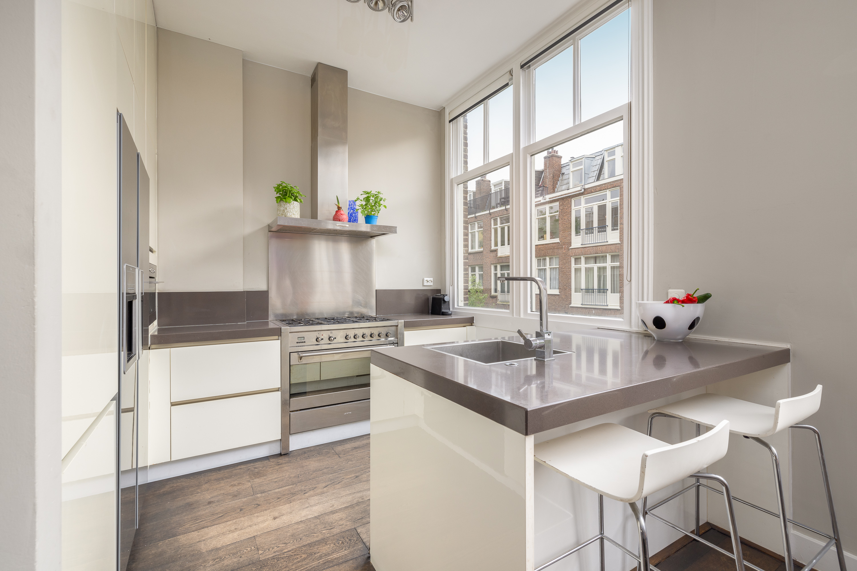 Aan de achterzijde van de woning bevindt zich de eetruimte, open keuken met eiland, en een Frans balkon. De keuken is uitgerust met een 5-pits gasfornuis, oven, magnetron en een koel-/vriescombinatie. Door de overvloed aan glas en de plafondhoogte van 3.07 meter, is deze verdieping bijzonder licht en ruimtelijk.
