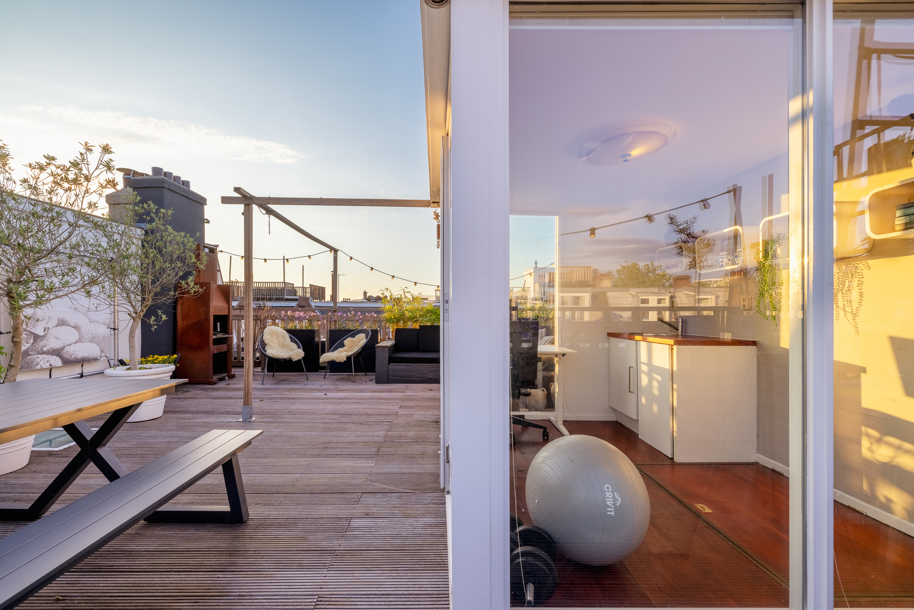 Hier krijgt u toegang tot het zeer ruime, gezellige en fraai afgewerkte dakterras. Op deze verdieping heeft u ook een wastafel en koeling tot uw beschikking. Handig is ook dat de toegang naar het dakhuis kan worden afgesloten, waardoor een fijne ruimte ontstaat van circa 6m². Kortom, genoeg ruimte voor het creëren van een home gym, bijvoorbeeld voor het beoefenen van yoga, of een heerlijke thuiswerkplek.