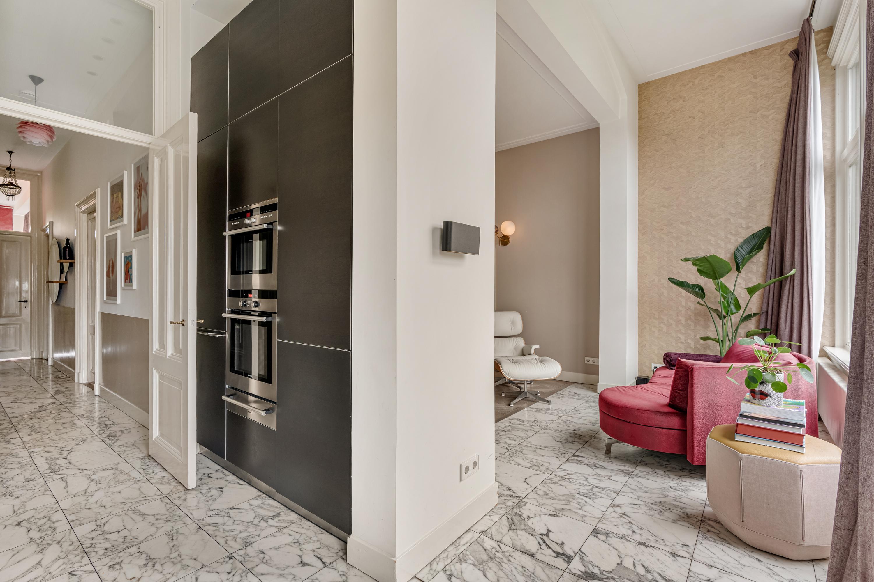 Via de eigen entree bereikt u de tweede verdieping van dit ruime en karaktervolle appartement van circa 184 m². De hal, voorzien van een marmeren vloer, biedt toegang tot alle vertrekken en beschikt over een garderobe en een toilet met fonteintje.