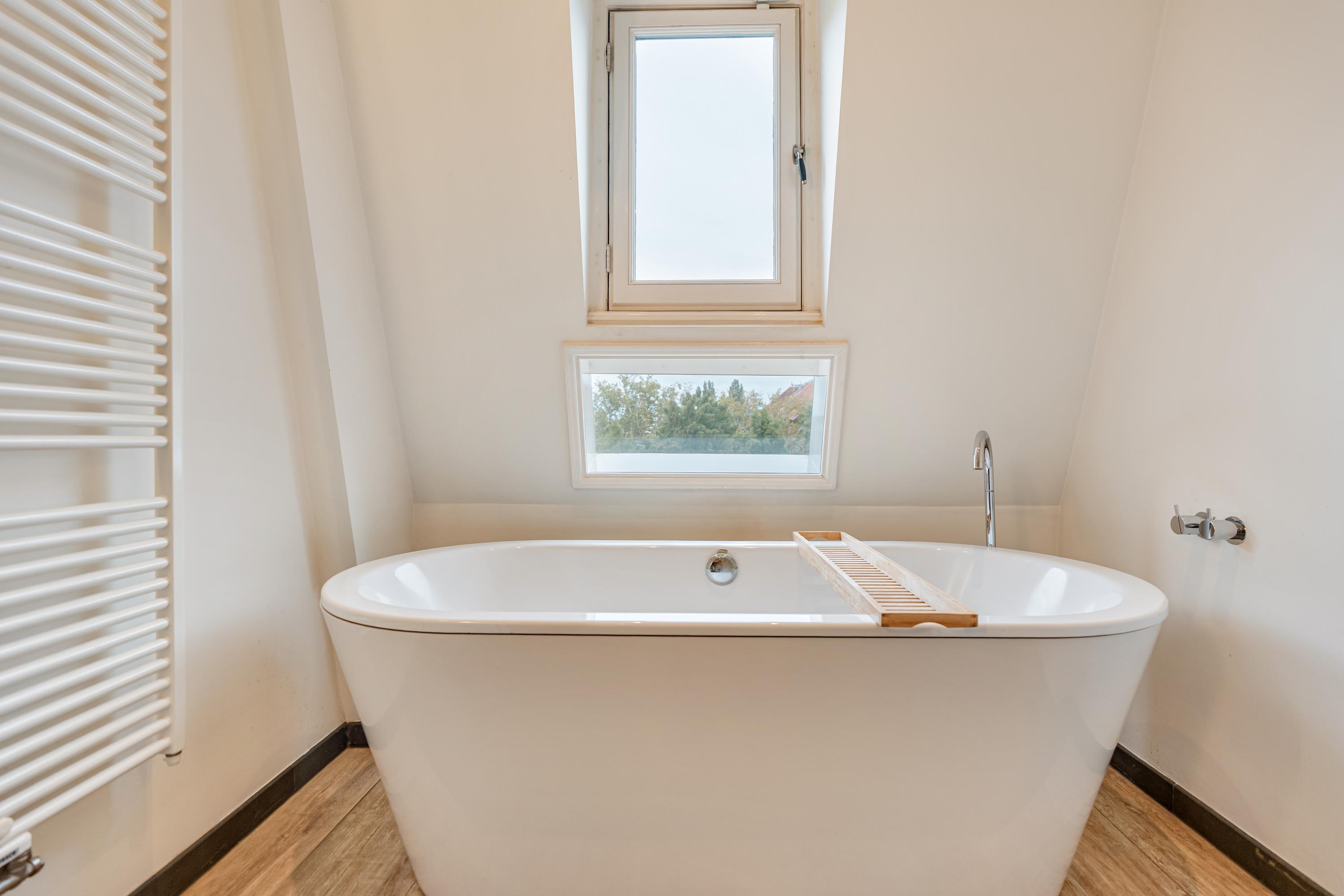 Aan de voorzijde bevindt zich de master bedroom met aangrenzende badkamer voorzien van ligbad, inloopdouche, dubbele wastafel, vloerverwarming en handdoekradiator. Daarnaast is er een tweede badkamer met een stoomcabine en wastafelmeubel. In het midden van deze verdieping ligt een praktische berging met aansluitingen voor wasmachine en droger, en de opstelling van de C.V.-ketel.