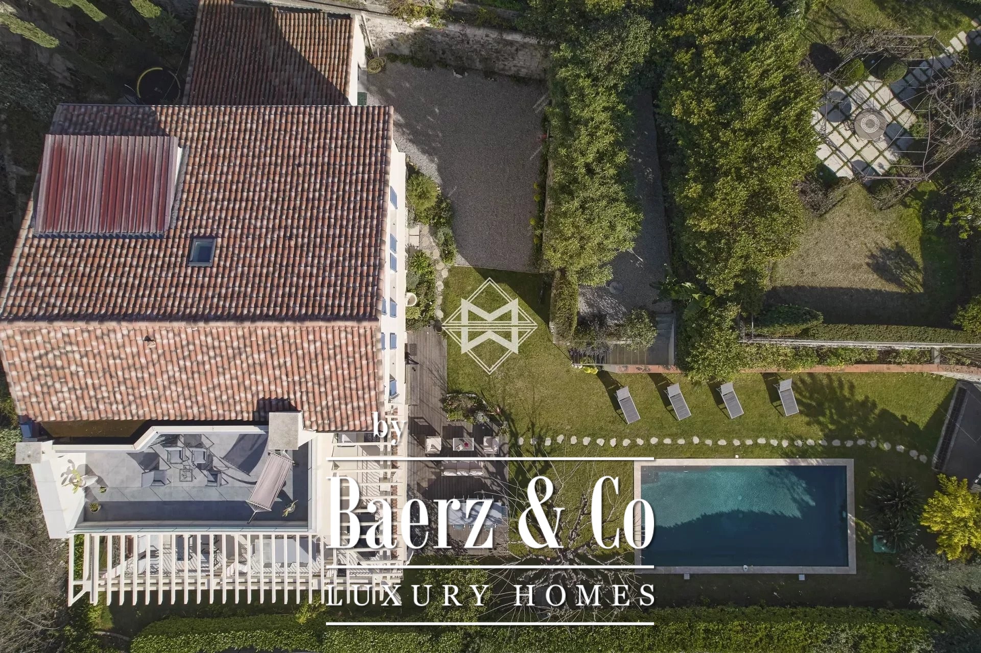 Villa Antibes biedt een zeldzame combinatie van gerenoveerde luxe en panoramisch zeezicht. Deze villa in Antibes beslaat 400 m² verdeeld over meerdere niveaus, discreet gelegen binnen een privé domein op korte loopafstand van de stranden. De entree vloeit over in ruime woon- en eetkamers die naadloos overgaan in de tuin, een schaduwrijk terras en een zwembad. Op de begane grond bevindt zich een royale, volledig uitgeruste keuken en een speciaal petanqueterrein, waardoor een subtiele balans ontstaat tussen binnen- en buitenleven. Een slaapkamer met en-suite badkamer completeert dit niveau.