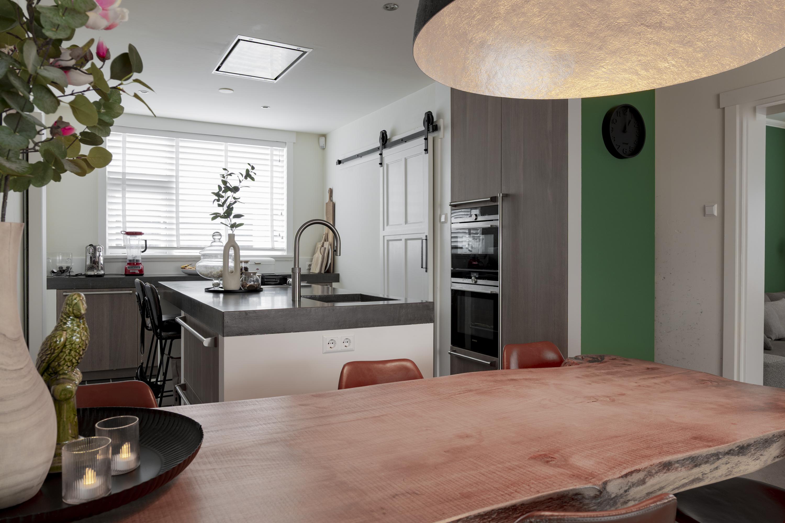 Entree met originele granitovloer, trapopgang, toilet en toegang tot de ruime kelder. De woonkamer met erker en houthaard biedt een fijne, royale leefruimte met volop mogelijkheden voor een comfortabele loungehoek. De luxe woonkeuken vormt het hart van de woning: ruim, licht en stijlvol afgewerkt, met kookeiland en hoogwaardige inbouwapparatuur. Vanuit de keuken is er een prettige verbinding met de entree en met de achtergelegen bijkeuken, inclusief een separate wasruimte.