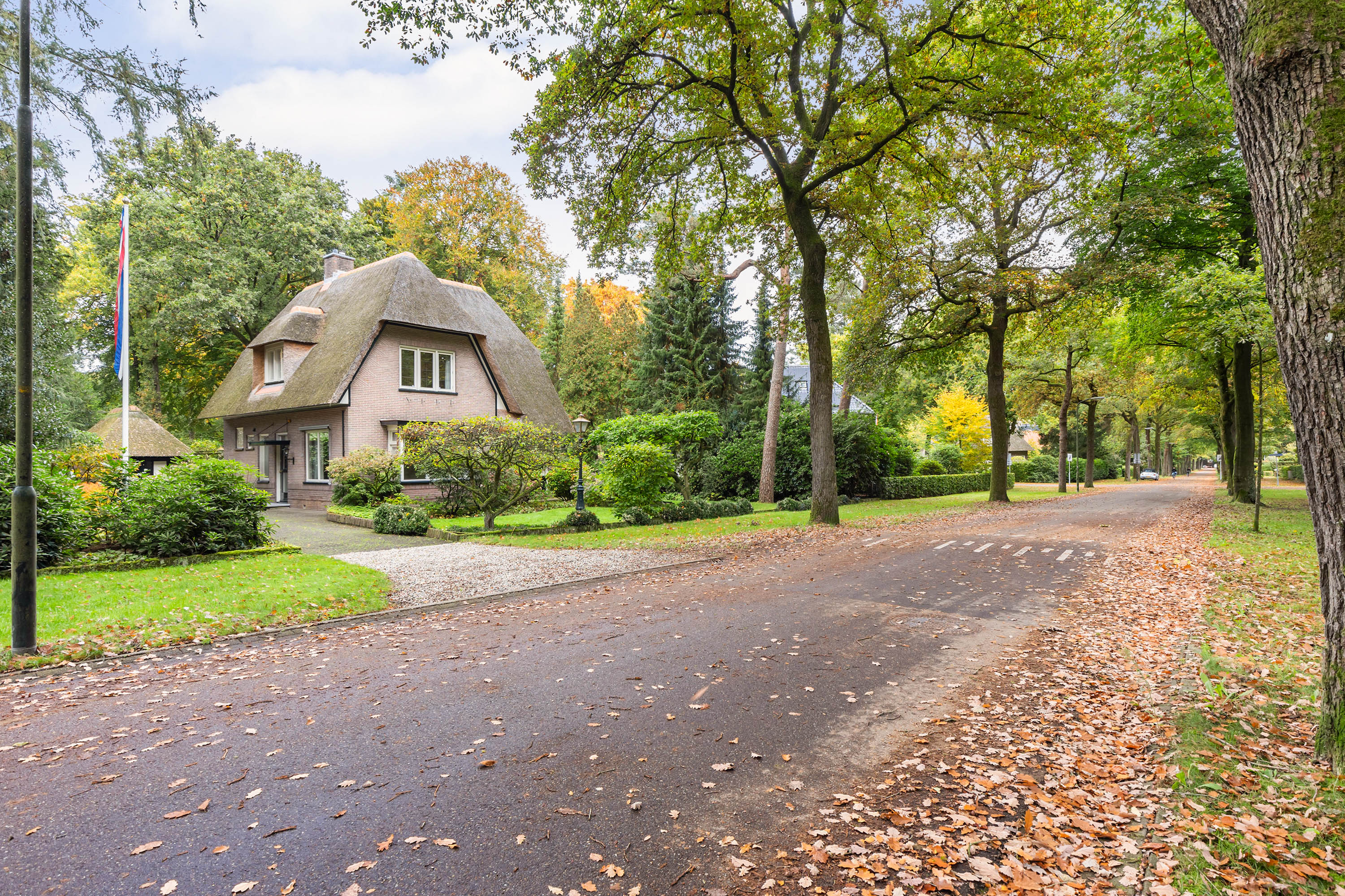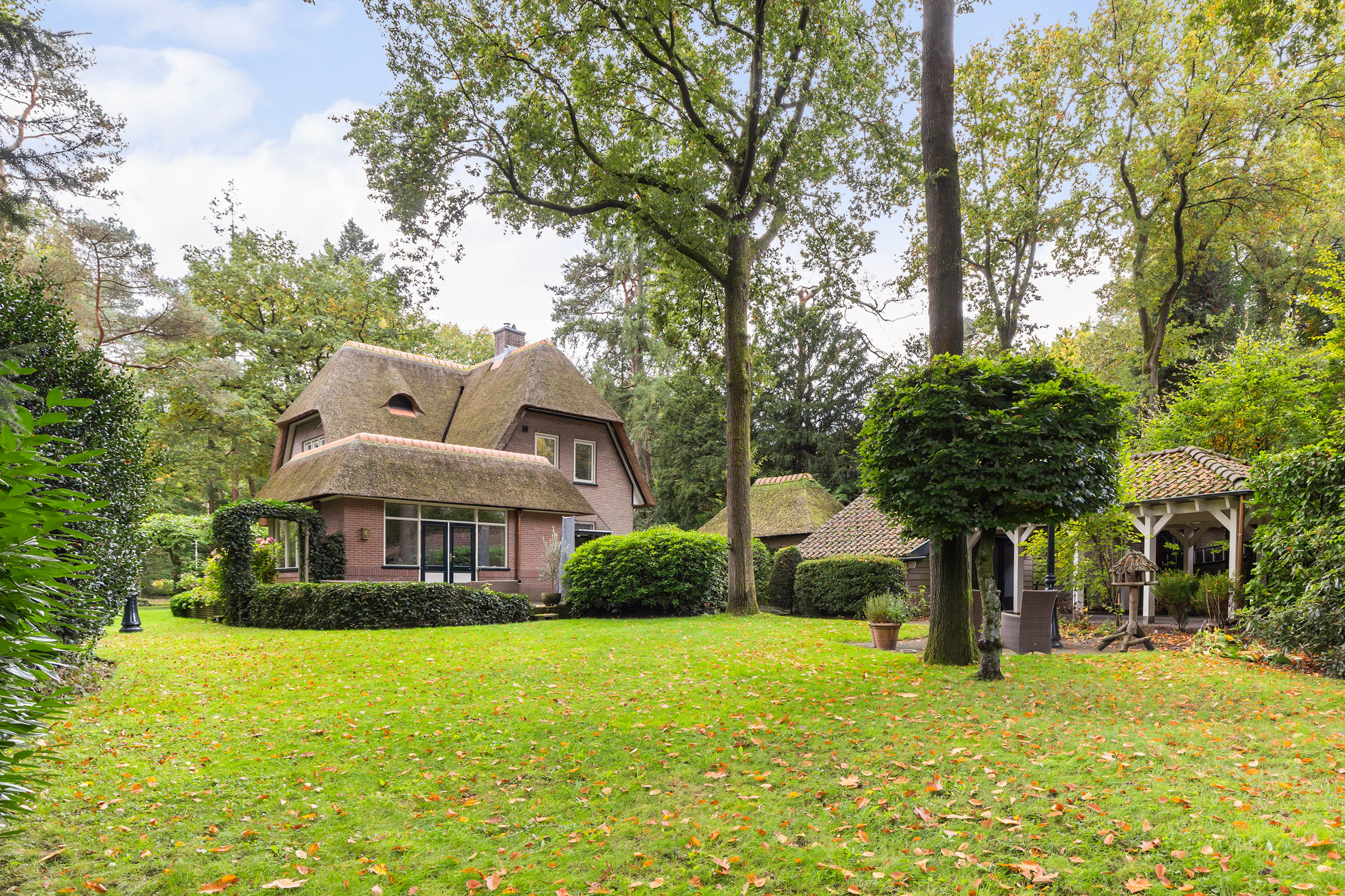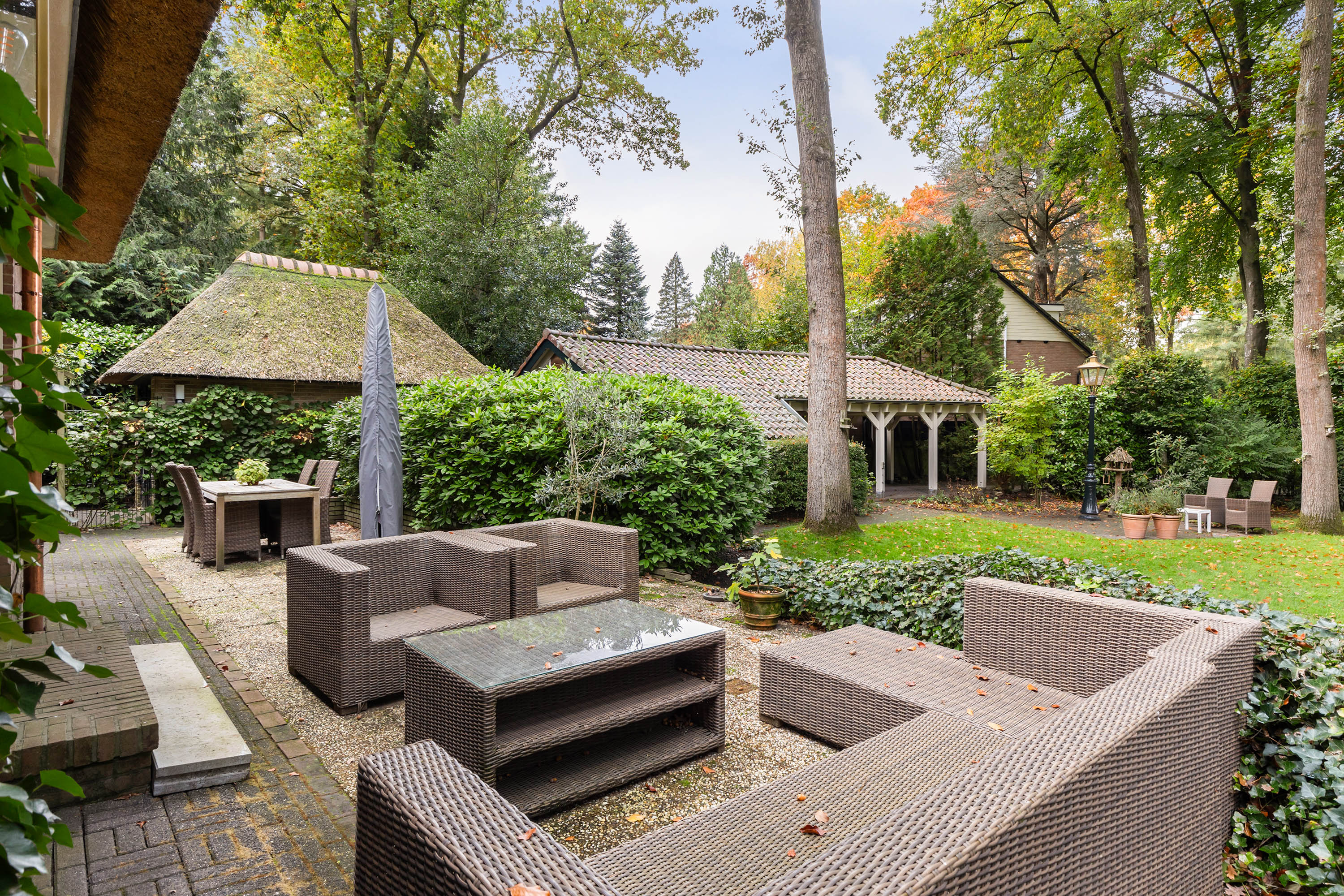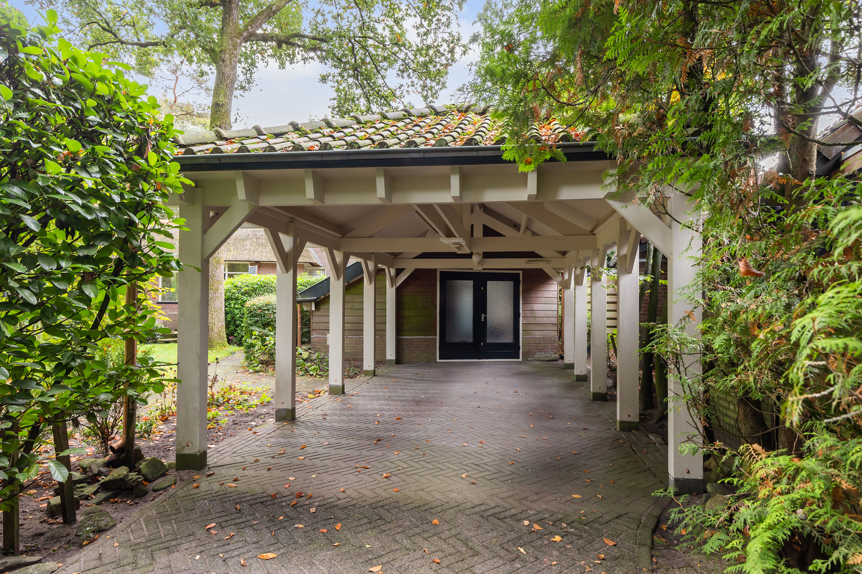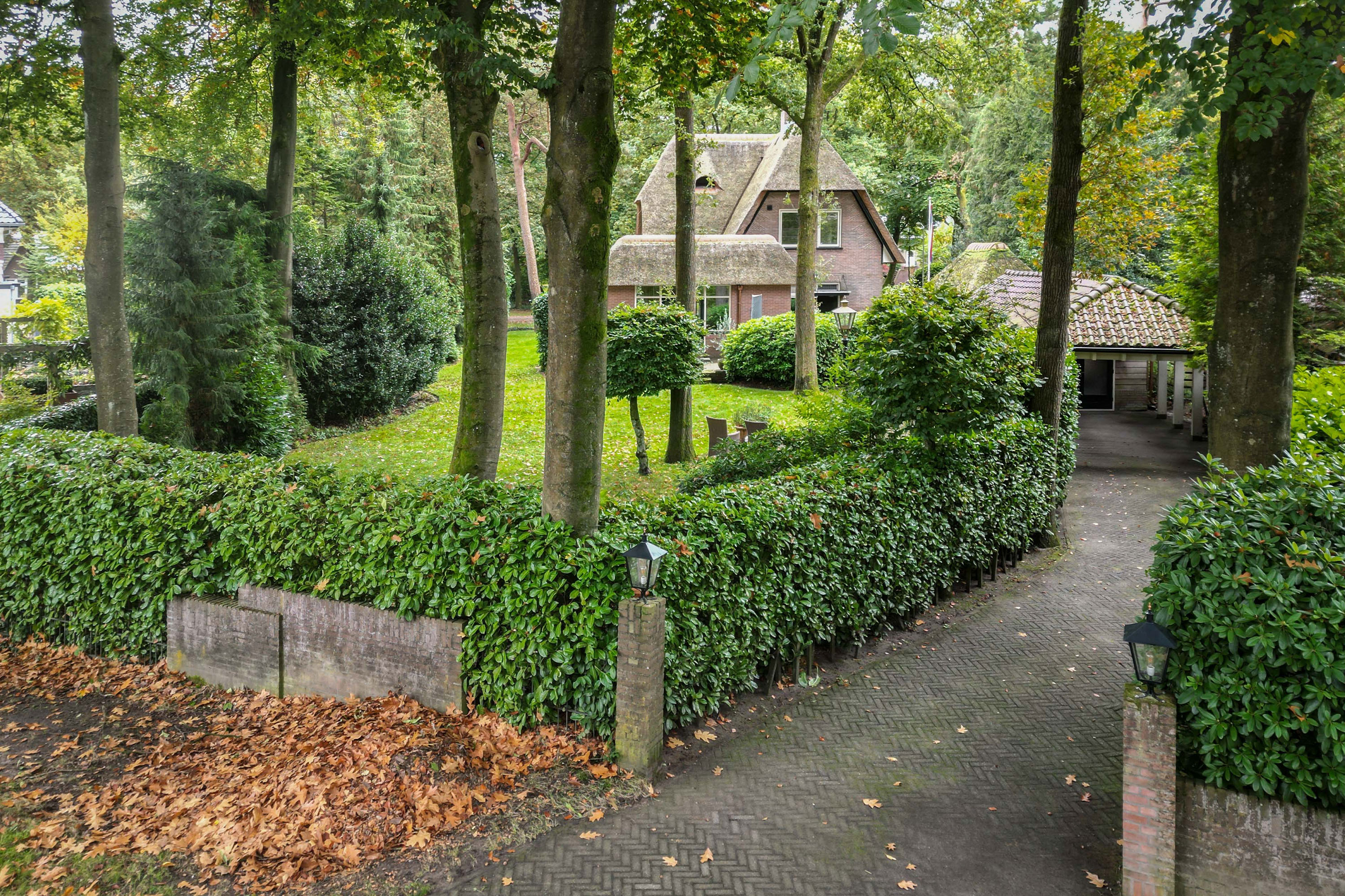 Het perceel van 1.480 m2 beschikt over een dubbele toegang. Via een oprit aan de voorzijde is naast de woning plaats voor 4 auto’s. De oprit leidt naar de garage met rieten kap en hoge nok die qua stijl perfect aansluit bij de woning. Aan de achterzijde is er via de Cederlaan een royale oprit waar 5 auto’s geparkeerd kunnen worden, waar zich ook een grote carport met pannendak bevindt. Daarachter is een houten berging met loopdeuren aanwezig.