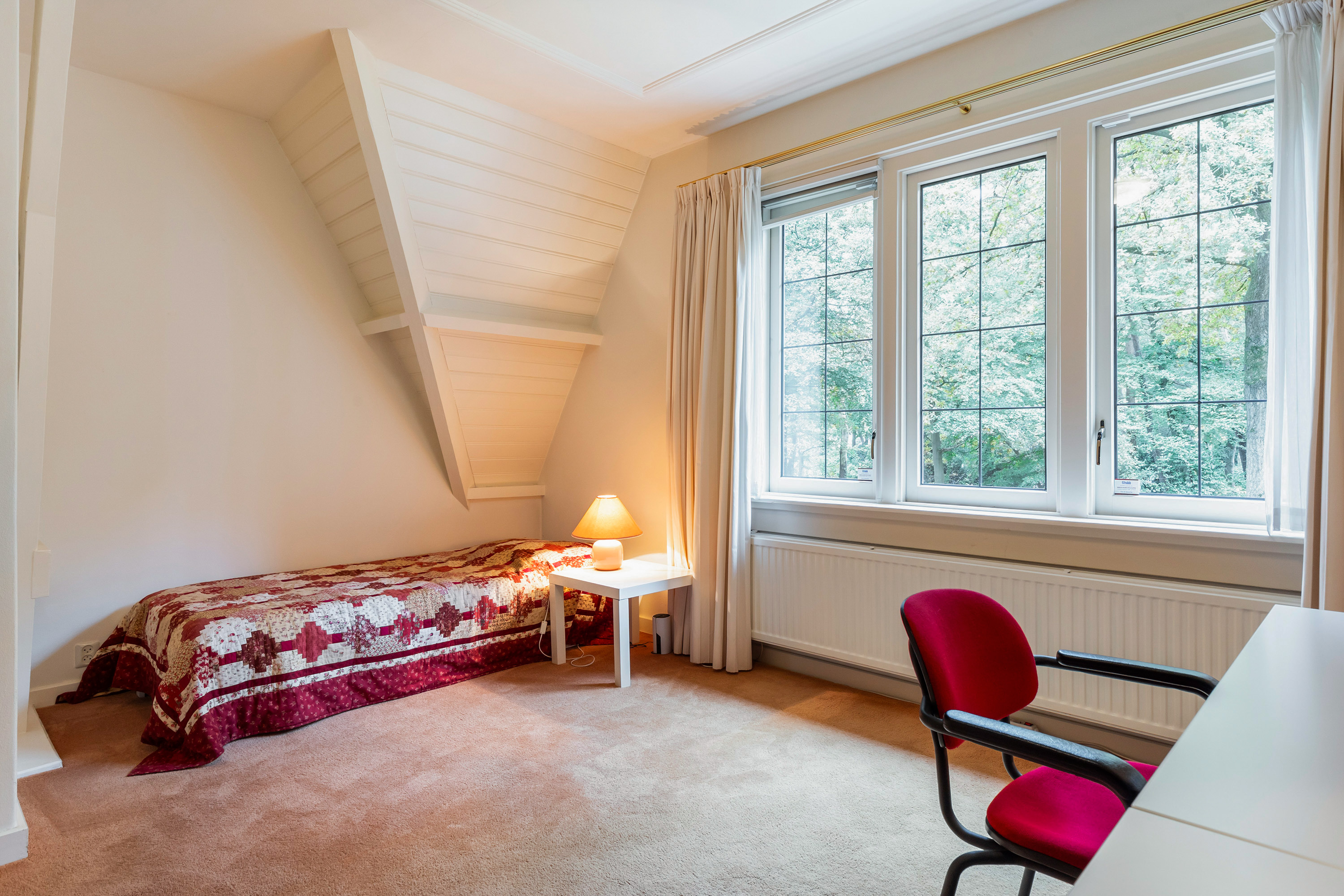 Aan de voorzijde ligt de werk- of slaapkamer met de schuinezijden voorzien van kraaldelen, balken in lichte tinten, en nieuwe ramen met lood-in-glas in houten kozijnen met modern sluitwerk.