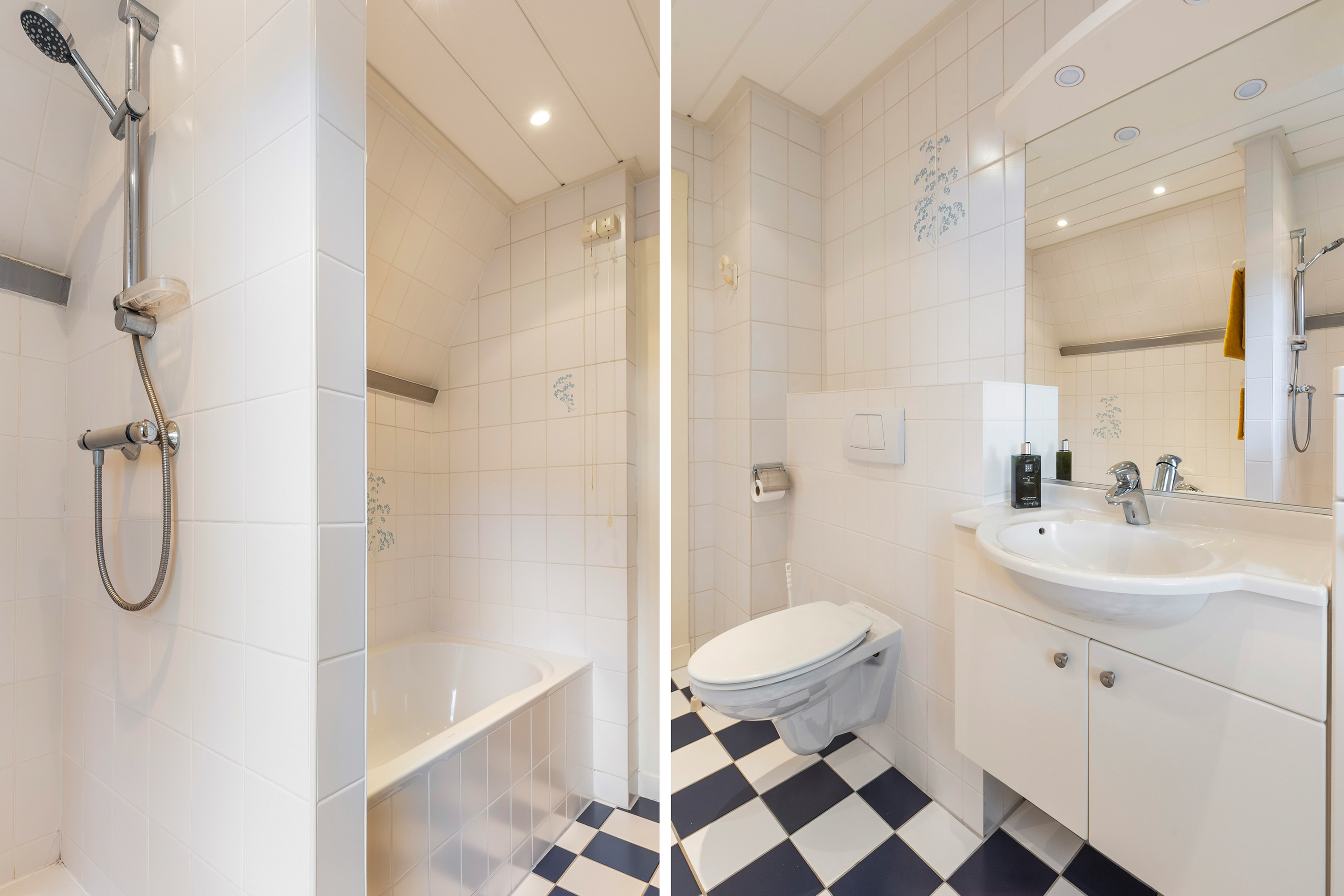 De badkamer heeft een ligbad, een aparte doucheruimte met thermostaatkraan, een wastafelmeubel met verlichting en een wandtoilet. Het raam met deels gematteerd lood-in-glas zorgt voor privacy en ventilatie.