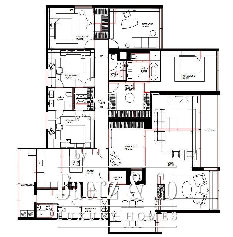 Licht is leidend in de beleving: alle zes slaapkamers zijn gericht op de buitenzijde, terwijl de ligging op drie windrichtingen zorgt voor constante doorstroming van verse lucht en zonlicht van ’s ochtends vroeg tot laat in de avond. De 46 m² grote woonkamer opent direct op een privéterras met uitzicht op de tuin, terwijl de eetkamer van 16 m² en de keuken van 20 m² samen de dagelijkse dynamiek bepalen. Vier badkamers, een aparte werkkamer en een master suite met een kleedruimte van 10,9 m² bieden ruimte aan zowel privacy als samenzijn.