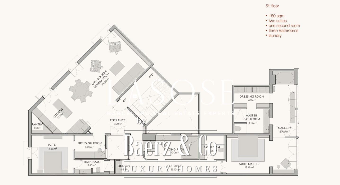 Flat Barcelona zet een serene standaard voor eigentijds wonen in het hart van de stad, met een woonoppervlak van 184 m² op de vijfde verdieping van een volledig in 2021 gerenoveerd pand. Dit onderscheidende appartement beschikt over drie slaapkamers en drie badkamers, voorzien van een natuurhouten parketvloer en hoogwaardige dubbele beglazing die rust en comfort waarborgen. Geavanceerde luchtkanalen voor airconditioning en een warmtepomp zorgen het hele jaar door voor aangename klimaathuishouding op maat.