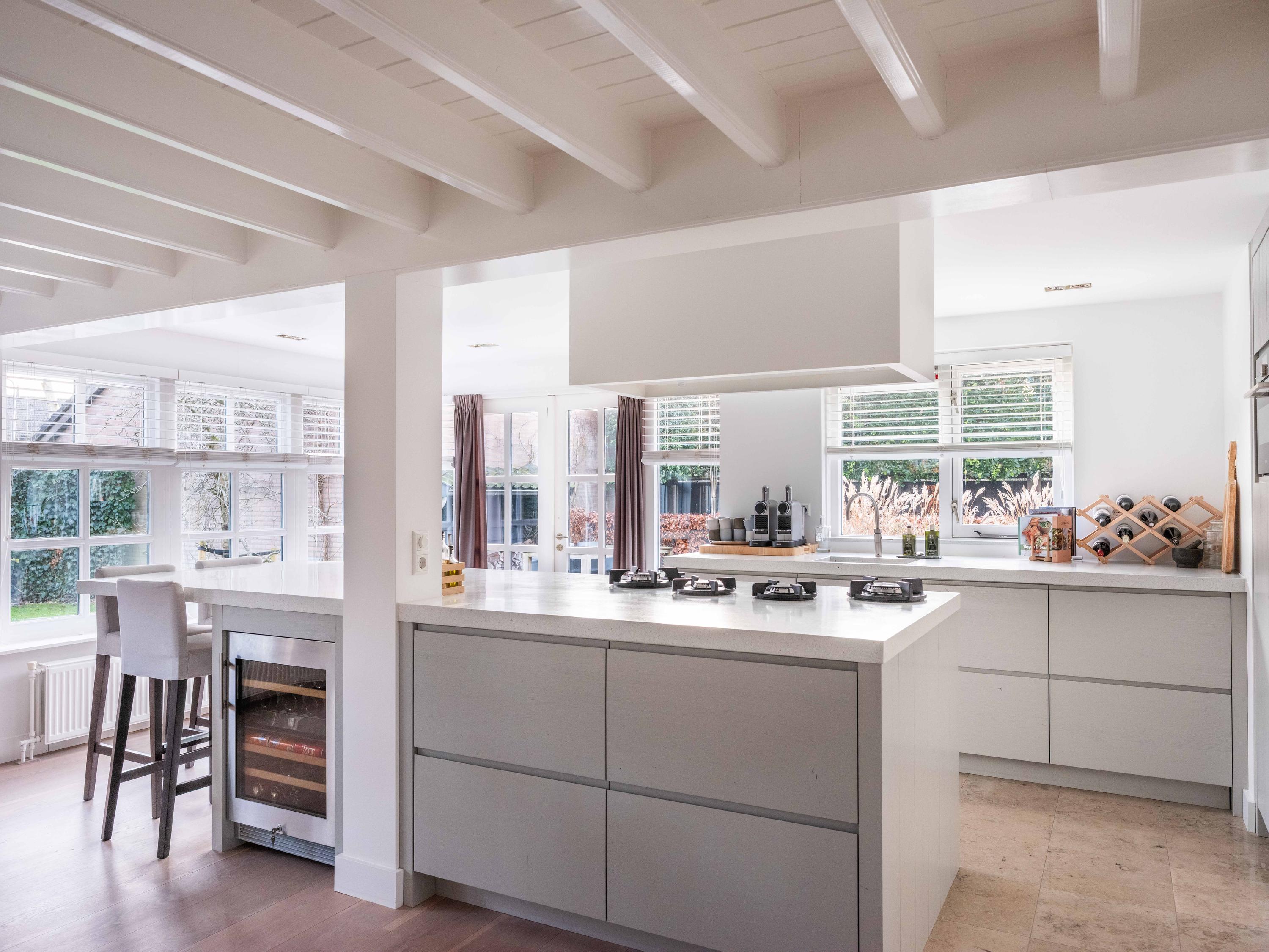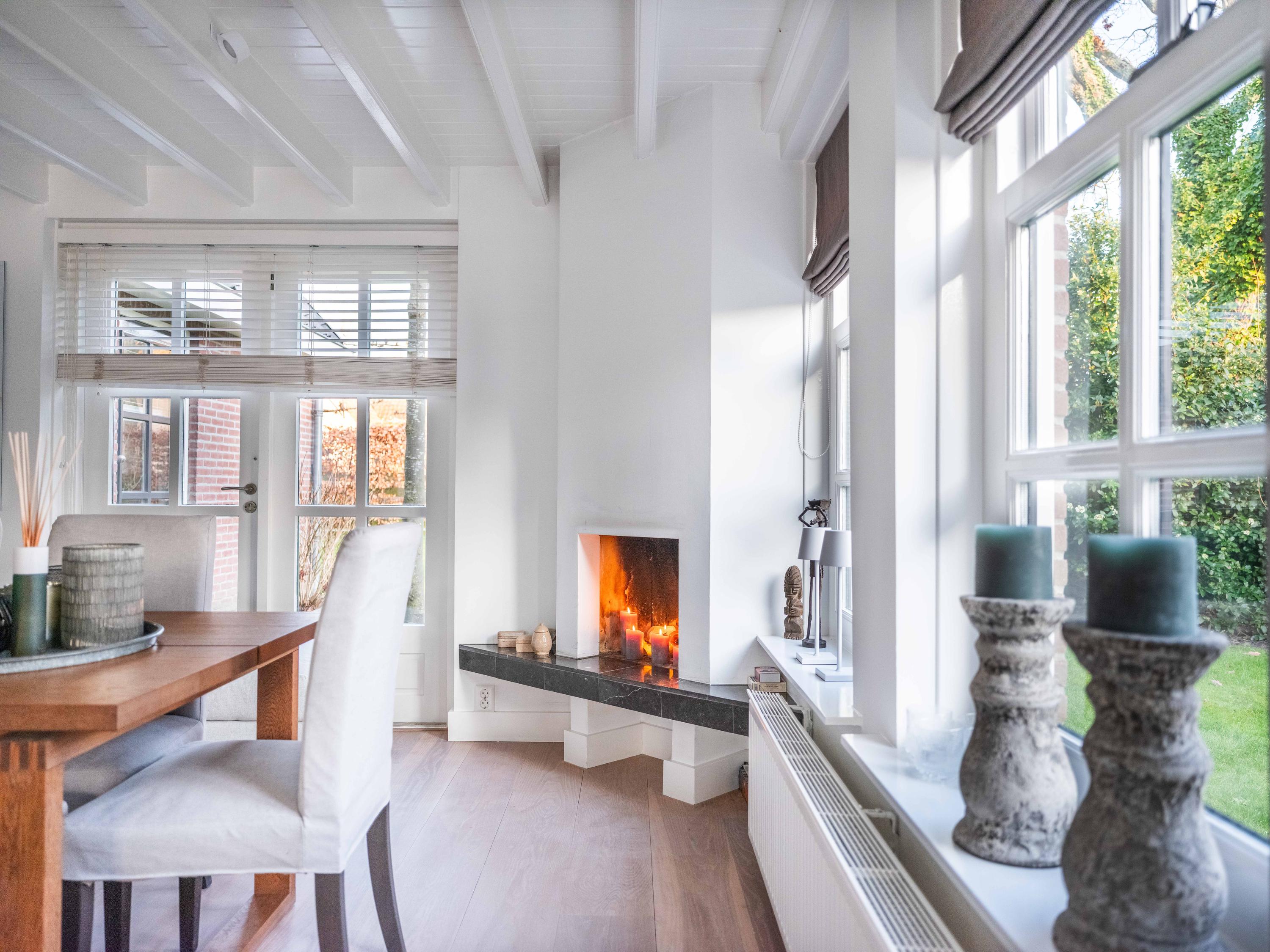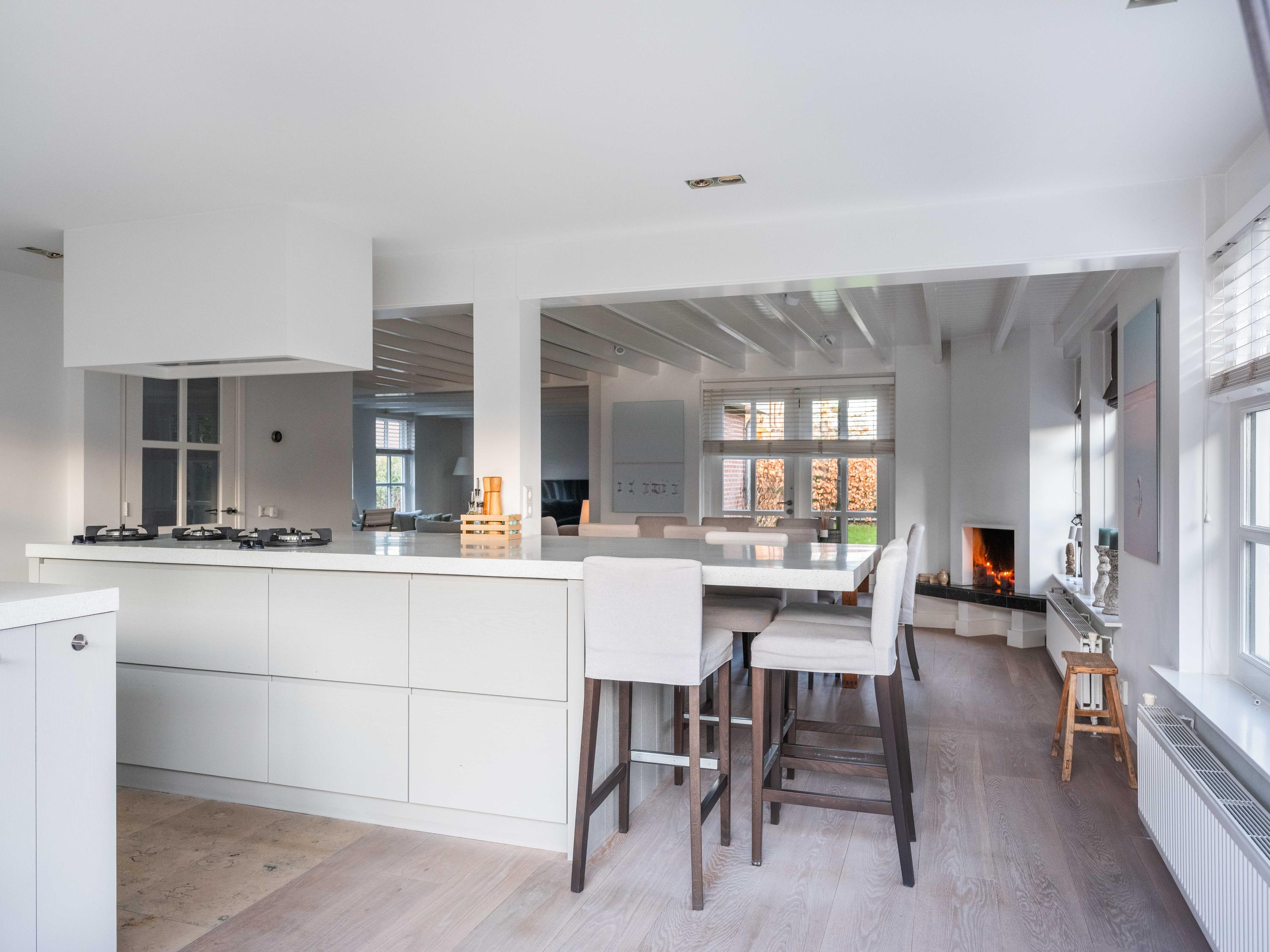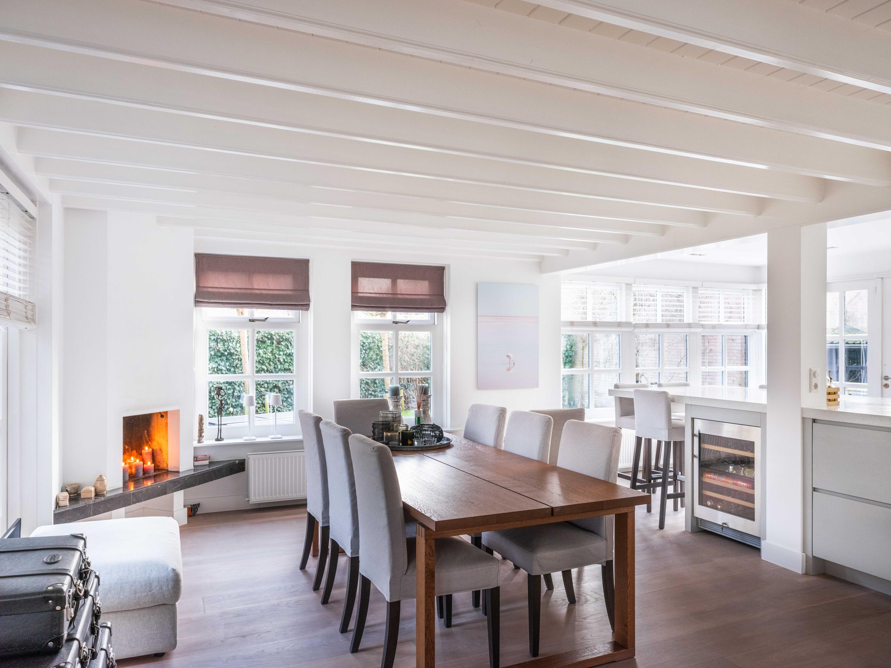 Bij binnenkomst valt direct de fijne sfeer op. De royale hal met trapopgang en modern toilet geeft toegang tot de praktische bijkeuken en leidt verder naar de eetkamer met open haard. Vanuit hier openen dubbele tuindeuren naar de fraai aangelegde tuin, waardoor binnen en buiten moeiteloos in elkaar overlopen. De woonkamer sluit naadloos aan op de designkeuken van Piet Jan van den Kommer – een echte blikvanger die perfect past bij de landelijke stijl van het huis. De houten vloeren en balkenplafonds versterken het gevoel van warmte en karakter.