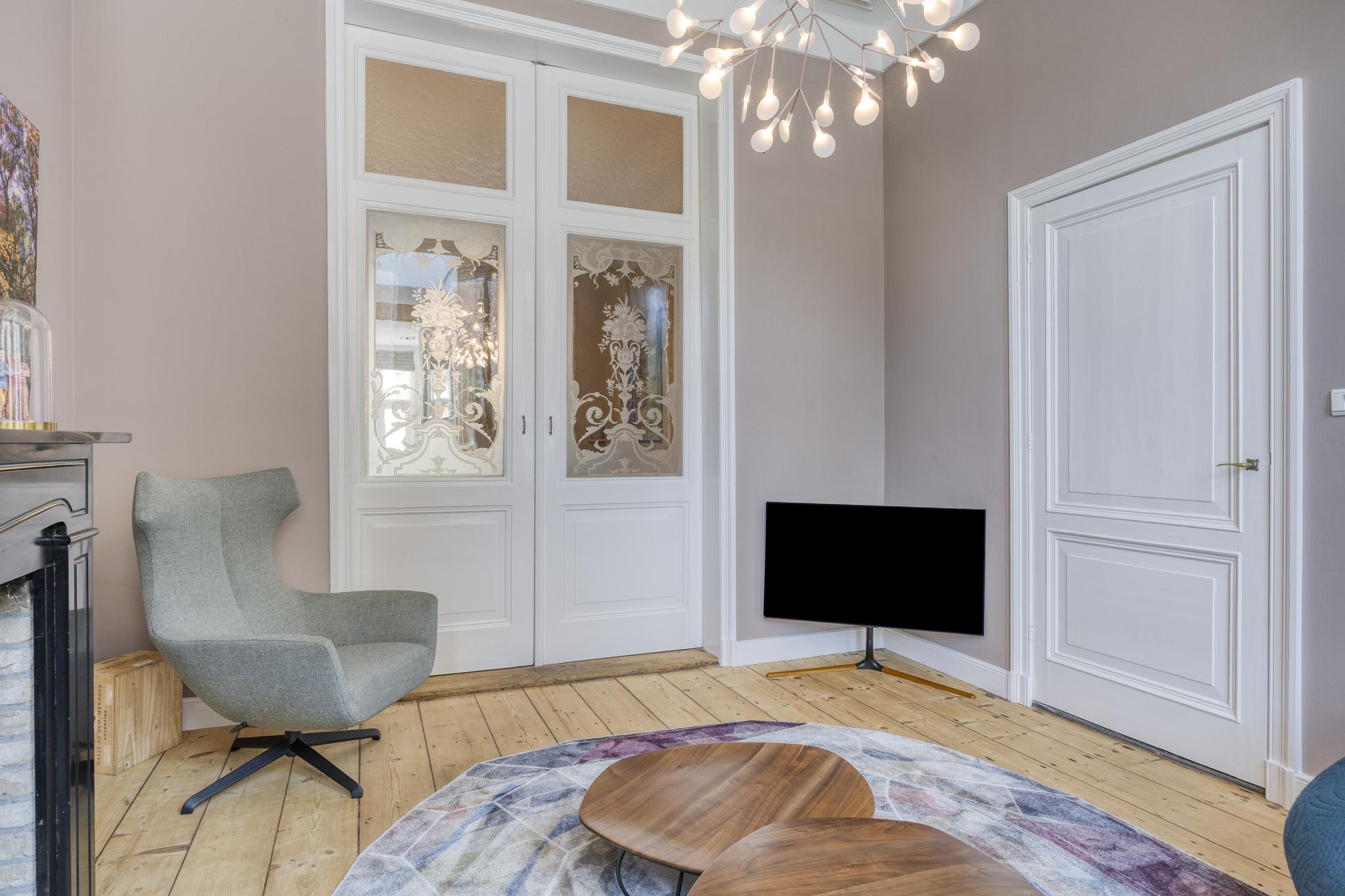 woonkamer, verdeeld in een voor- en achterkamer met schuifdeur, voorzien van 2-tal schouwpartijen met een open haard, wandafwerking stucwerk, houten vloer, plafond afgewerkt met stucwerk;