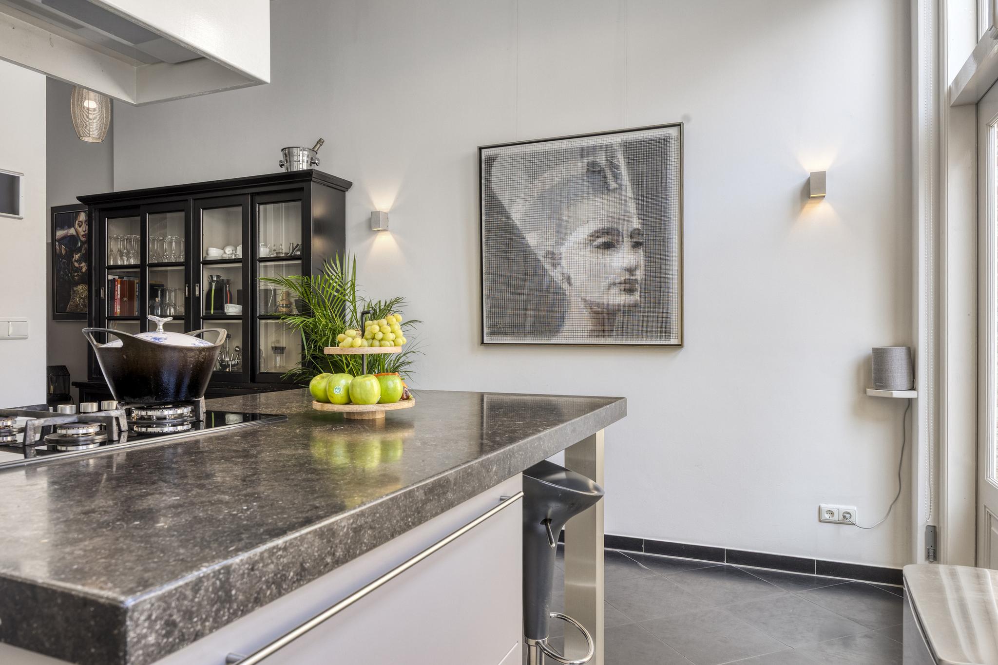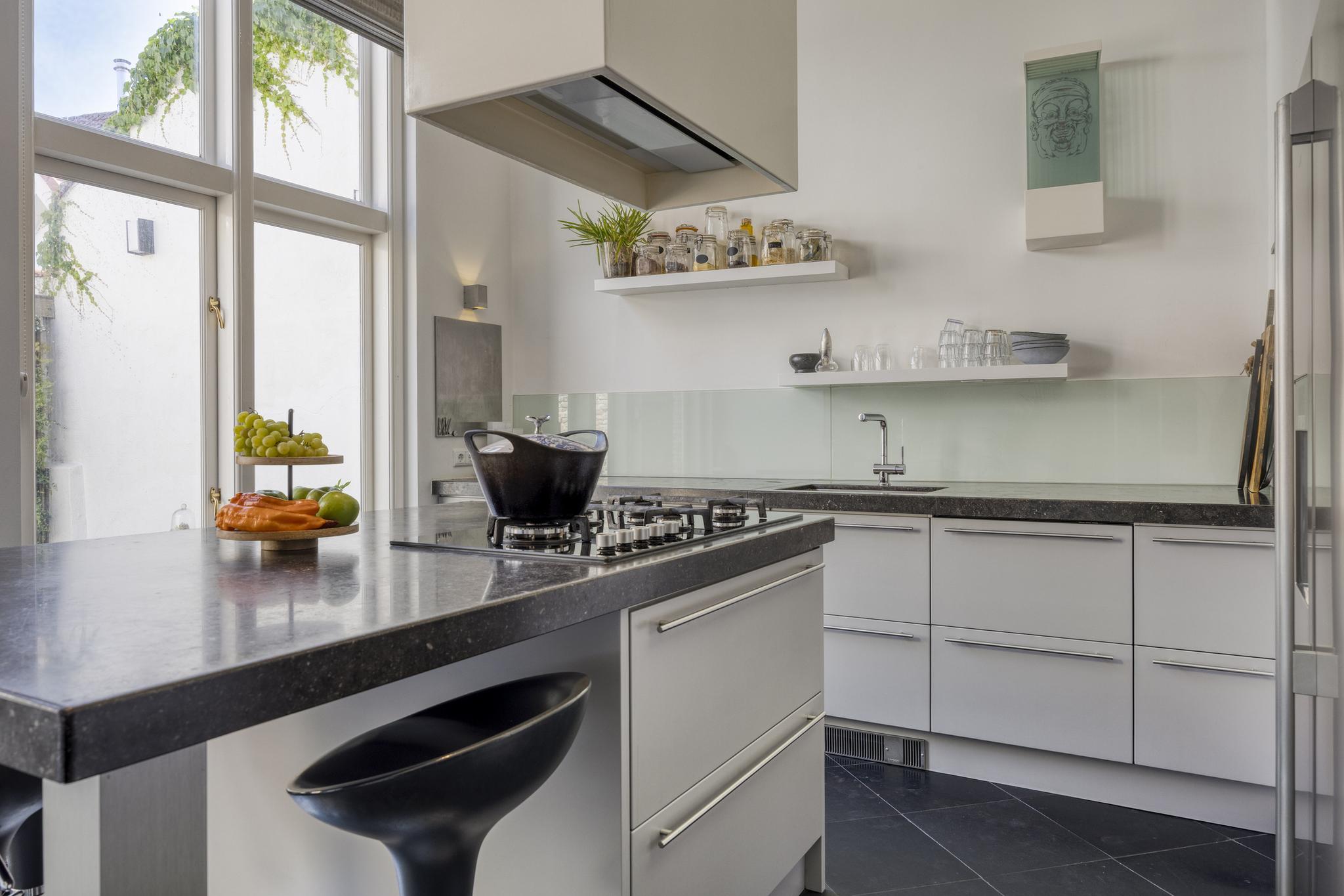 open woonkeuken, waarin geplaatst een in de lengte opgestelde inbouwkeuken met kookeiland, voorzien van een granieten aanrechtblad met een spoelbak, inbouw 5-pits gaskookplaat, -opstelplaats Amerikaanse koel/vriescombinatie, -stoomoven, - 2-tal warmhoudlades, -vaatwasser en een afzuigkap, wandafwerking stucwerk, tegelvloer, plafond afgewerkt met spuitwerk vv. inbouwspots, tuindeuren naar tuin/terras;