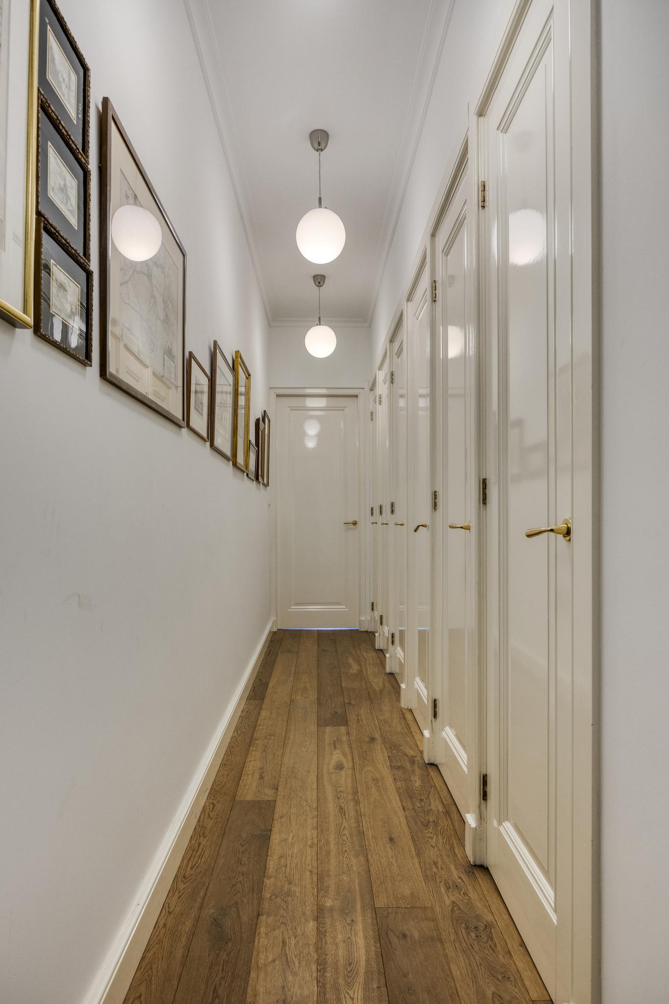 royale slaapkamer voor met een inbouwkastenwand, wandafwerking stucwerk, houten vloer, plafond afgewerkt met stucwerk;