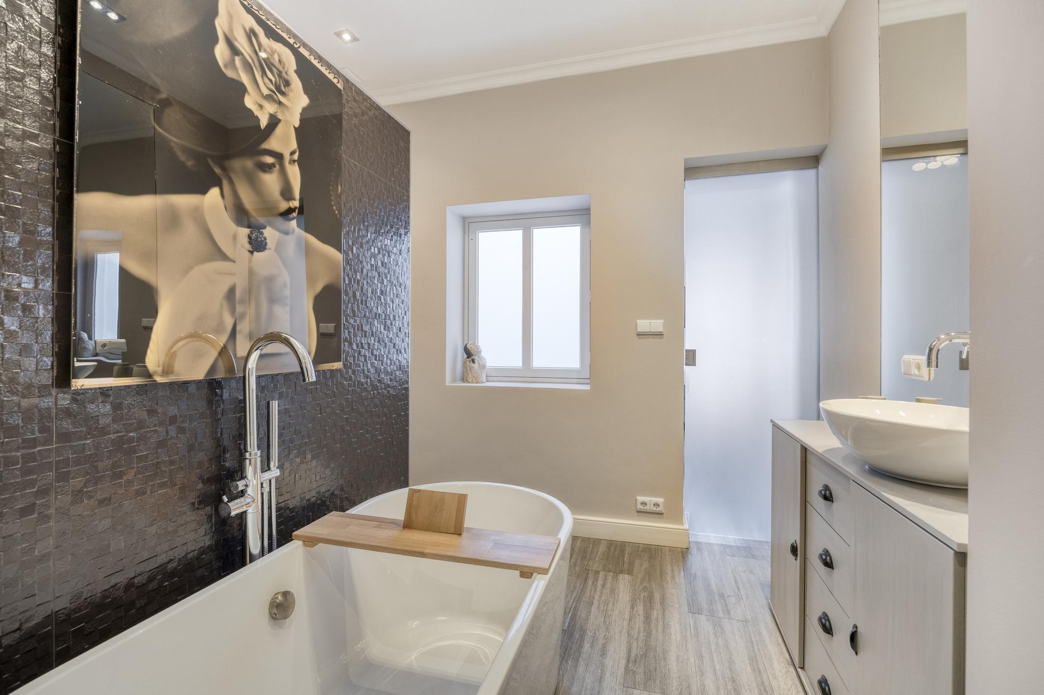 betegelde badkamer en-suite, voorzien van een vrijstaand ligbad, inloopdouche, infrarood sauna, badkamermeubel met een wastafel en een deur naar separaat toilet en inloopkast;