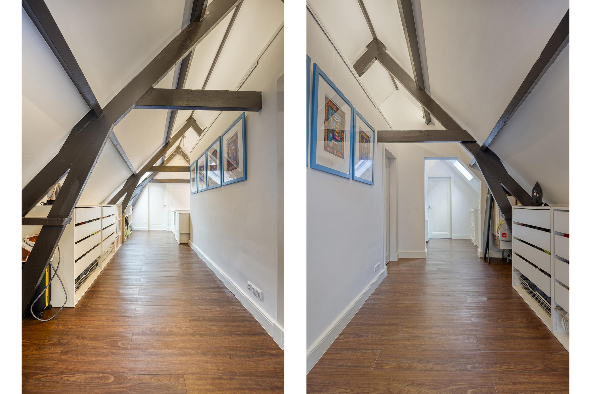 Overloop met opstelplaats HR-combiketel en een 3-tal dakramen, wandafwerking stucwerk, PVC-vloer, schuine dakvlakken afgewerkt met stucwerk;