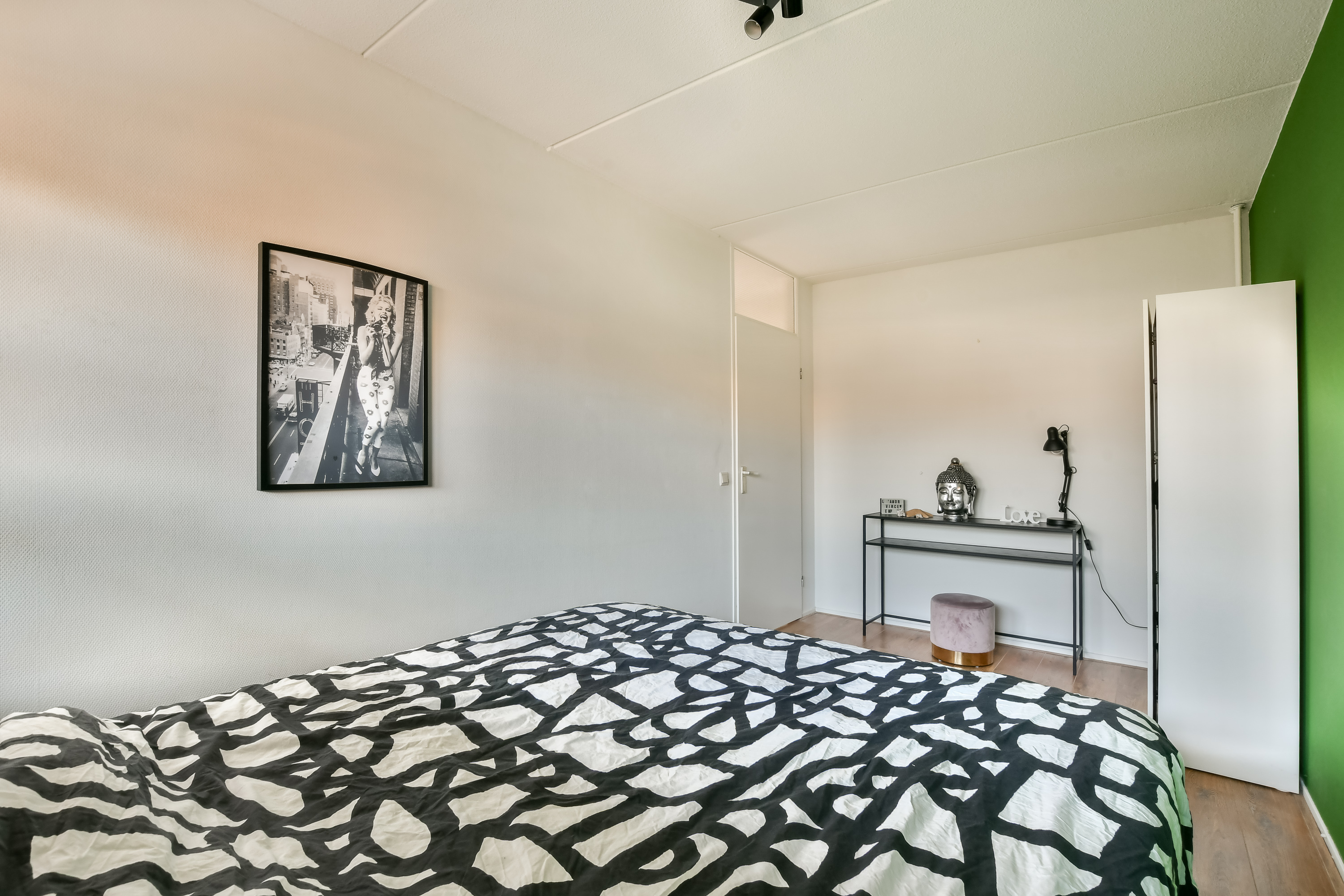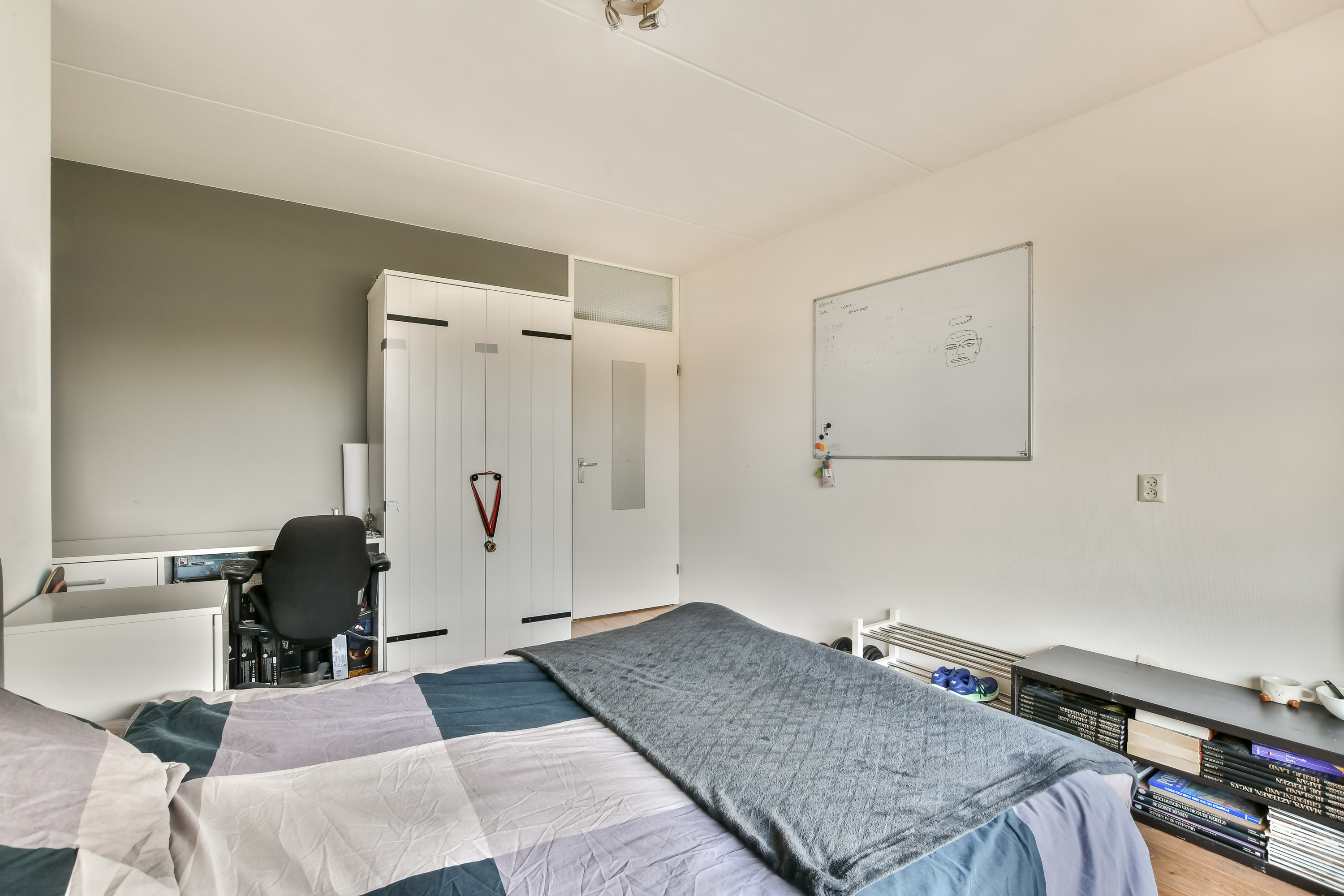 De ruime vierde slaapkamer aan de voorzijde beschikt over vaste kasten, een dakkapel en een laminaatvloer.