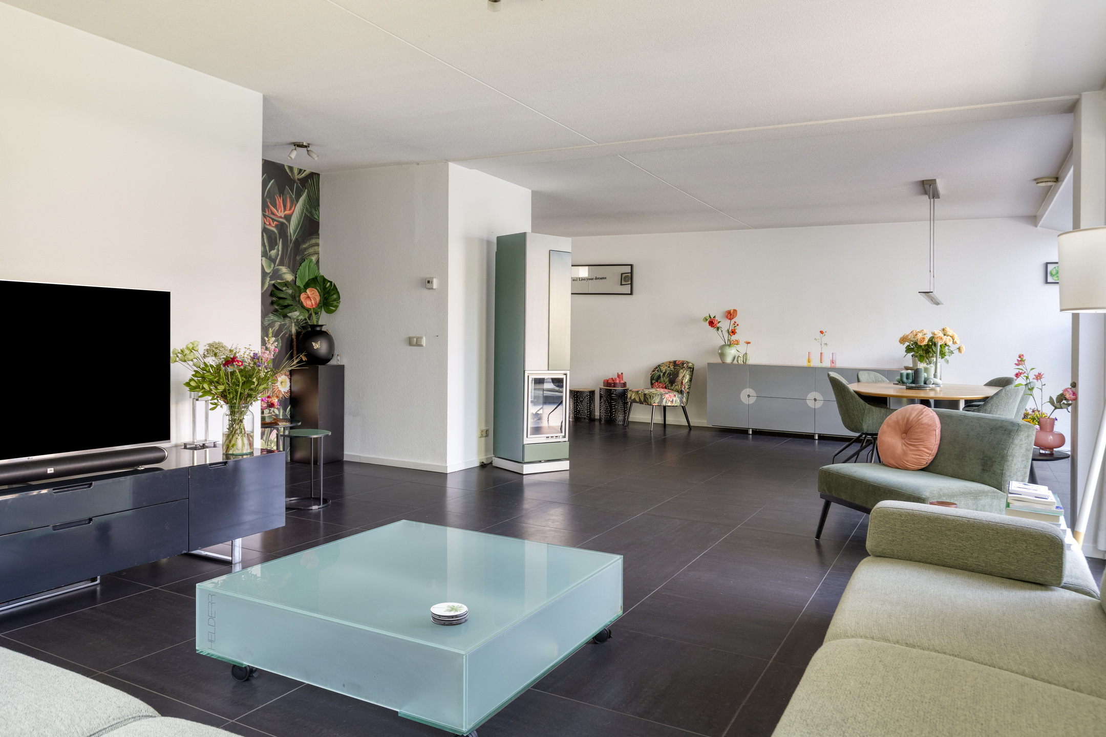 • Uitgebouwde, lichte woonkamer met vloerverwarming, plavuizenvloer, openslaande deuren én schuifpui naar de tuin