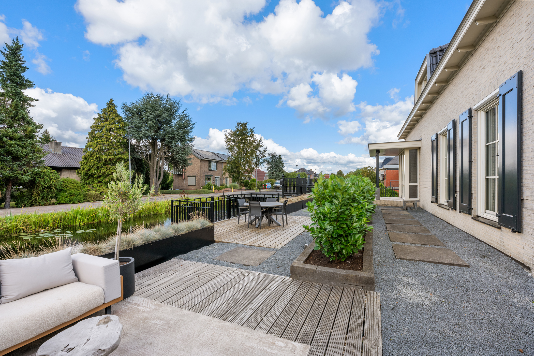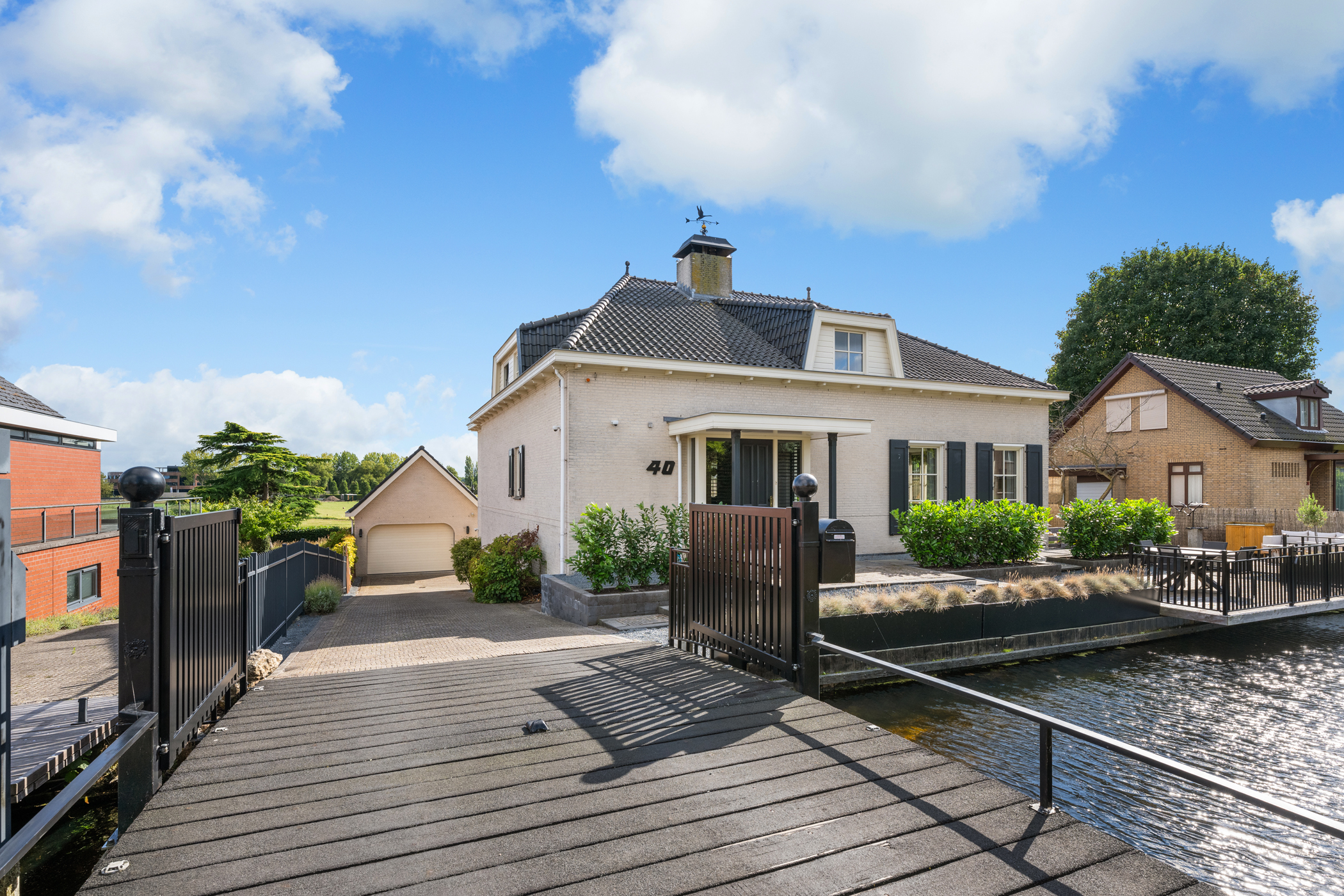 Via een eigen af te sluiten brug is het perceel te bereiken. De oprijlaan leidt naar de achterzijde, met voldoende parkeergelegenheid voor meerdere auto’s en een ruime garage.