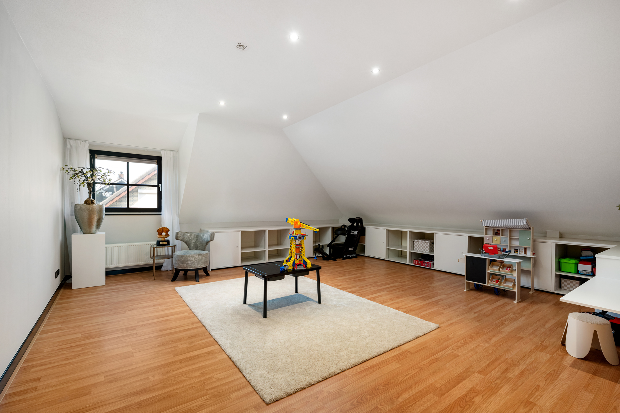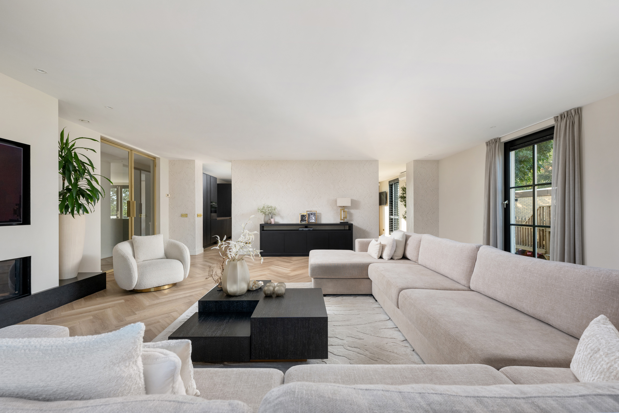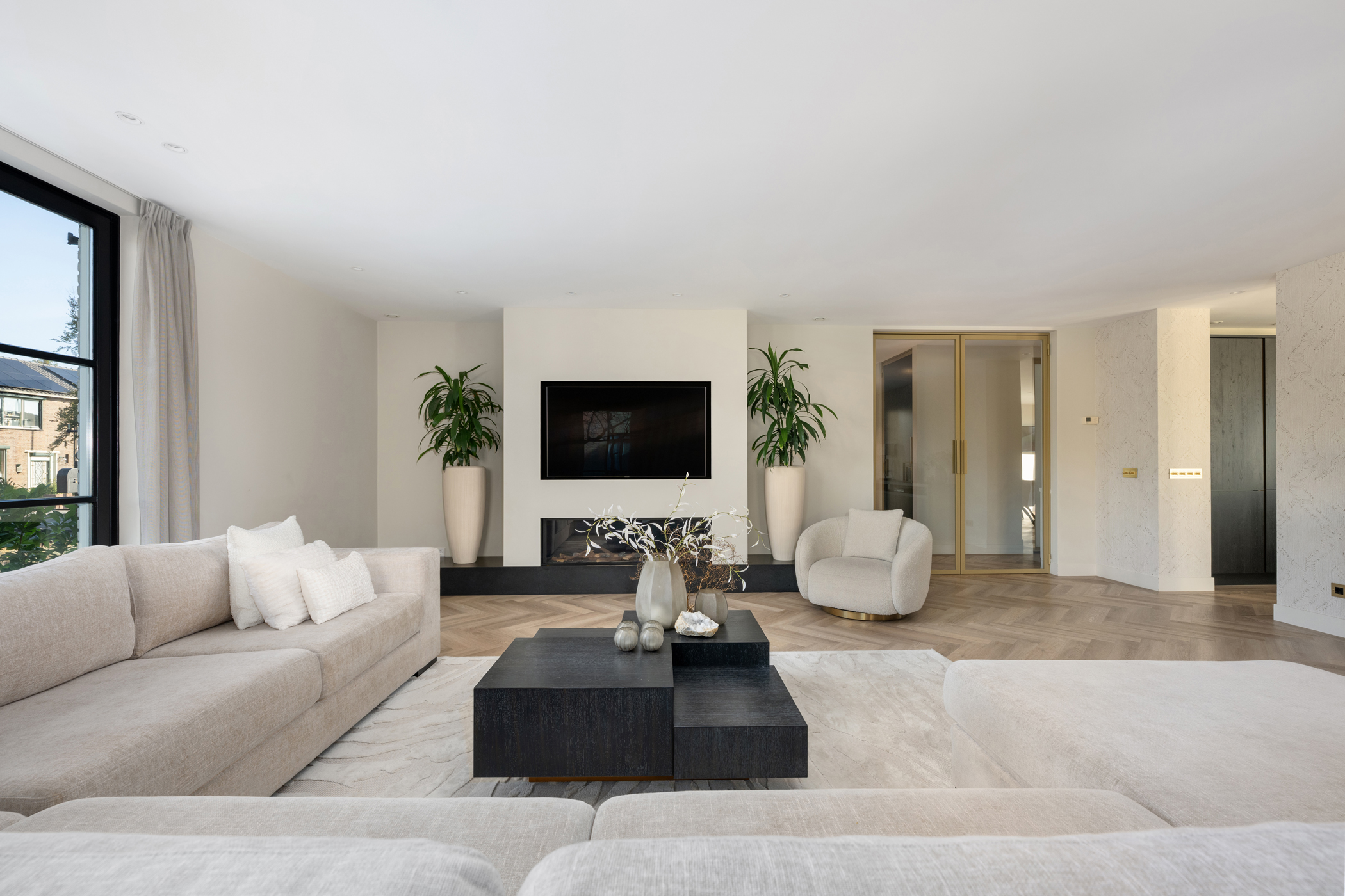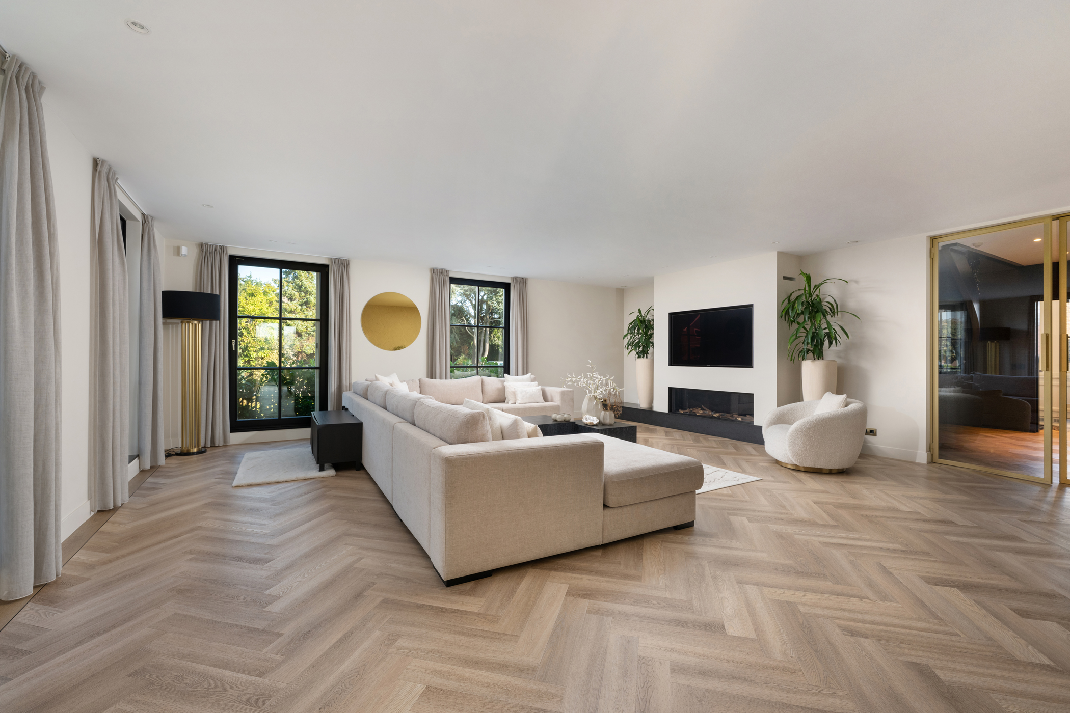 De royale woonkamer heeft een sfeervolle elektrische haard, screens, rolluiken en airconditioning, en een pvc-vissengraatvloer met vloerverwarming. Dankzij de grote raampartijen is de woonkamer licht en prettig ruim.