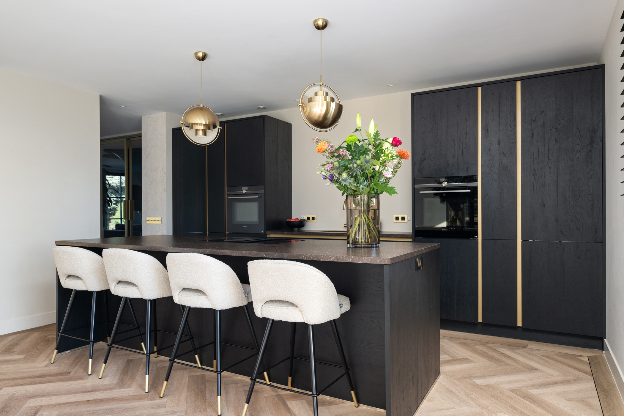 De moderne leefkeuken is voorzien van een stijlvol kookeiland en hoogwaardige inbouwapparatuur, waaronder inductiekookplaat met geïntegreerde afzuiging, combimagnetron, oven met stoomfunctie, koelkast, vriezer, vaatwasser en heetwaterkraan. Via openslaande deuren is het ruime, zonnige terras van ca. 29 m² bereikbaar.