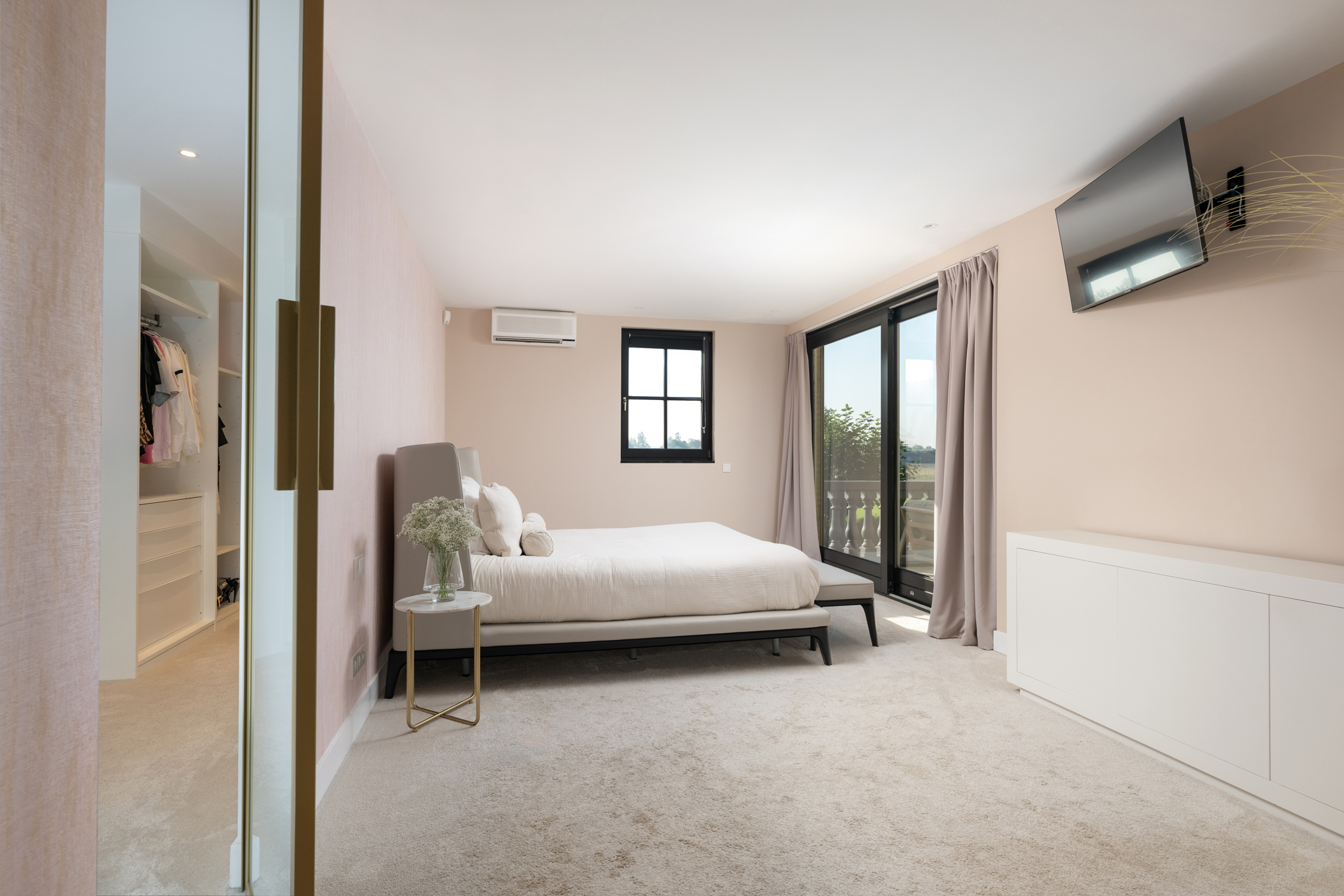 De master bedroom op de begane grond heeft een moderne ensuite badkamer met ligbad, dubbele wastafel, douche en toilet. De slaapkamer beschikt over airconditioning, vloerbedekking en een walk-in closet, en biedt via een schuifpui toegang tot het terras.