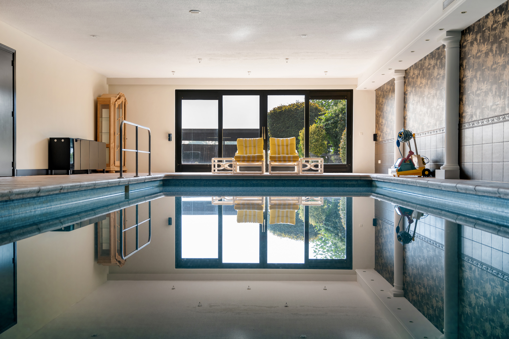Via openslaande deuren is de wellnessruimte bereikbaar, met technische ruimte, pantry, sauna, toiletruimte en luxe binnenzwembad. Vanuit de wellness leiden schuifpuien naar de achtertuin en de vrijstaande garage. Aan de achterzijde van de garage bevindt zich een hobbykas.