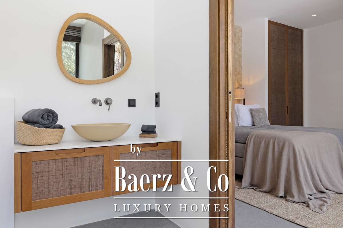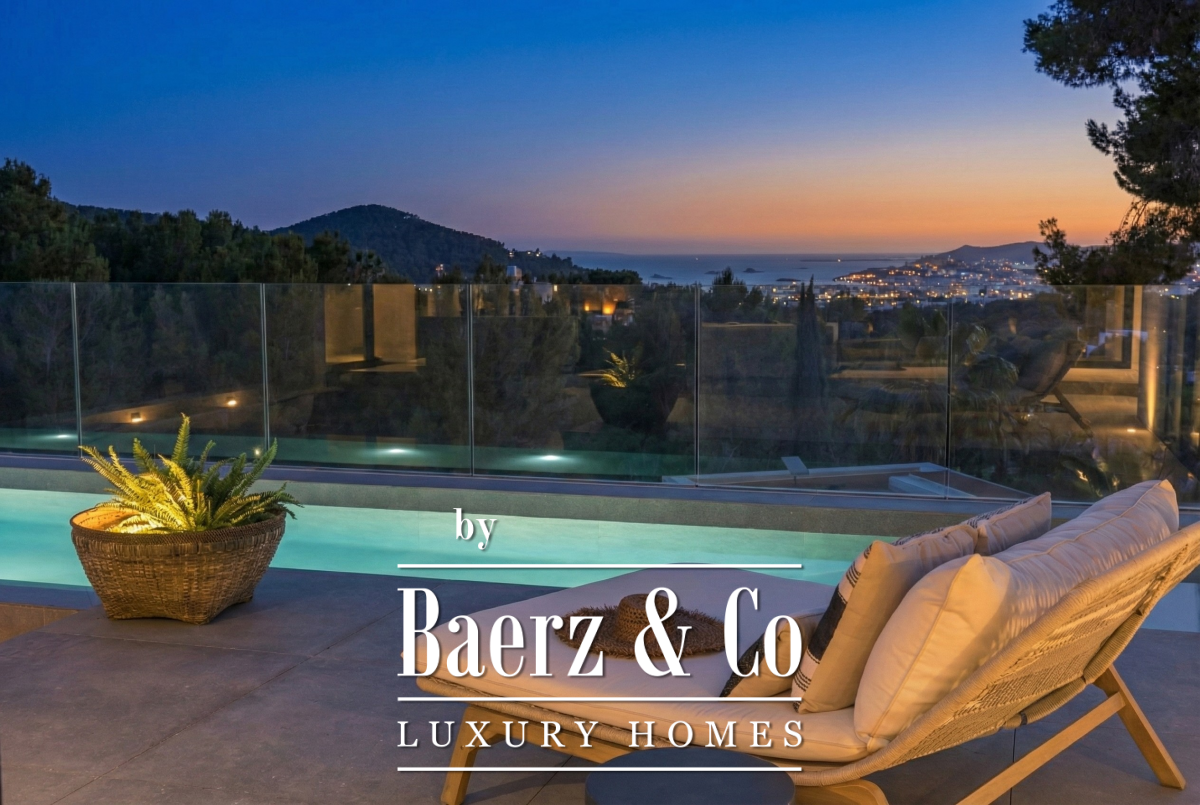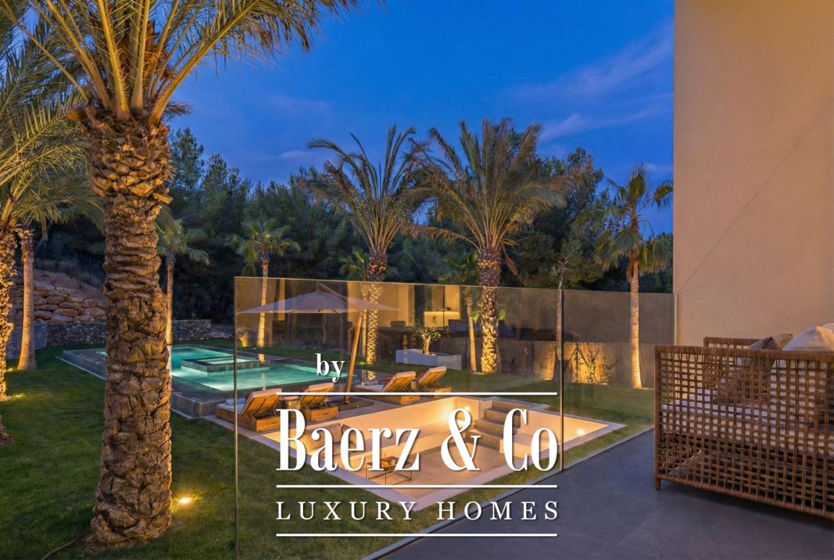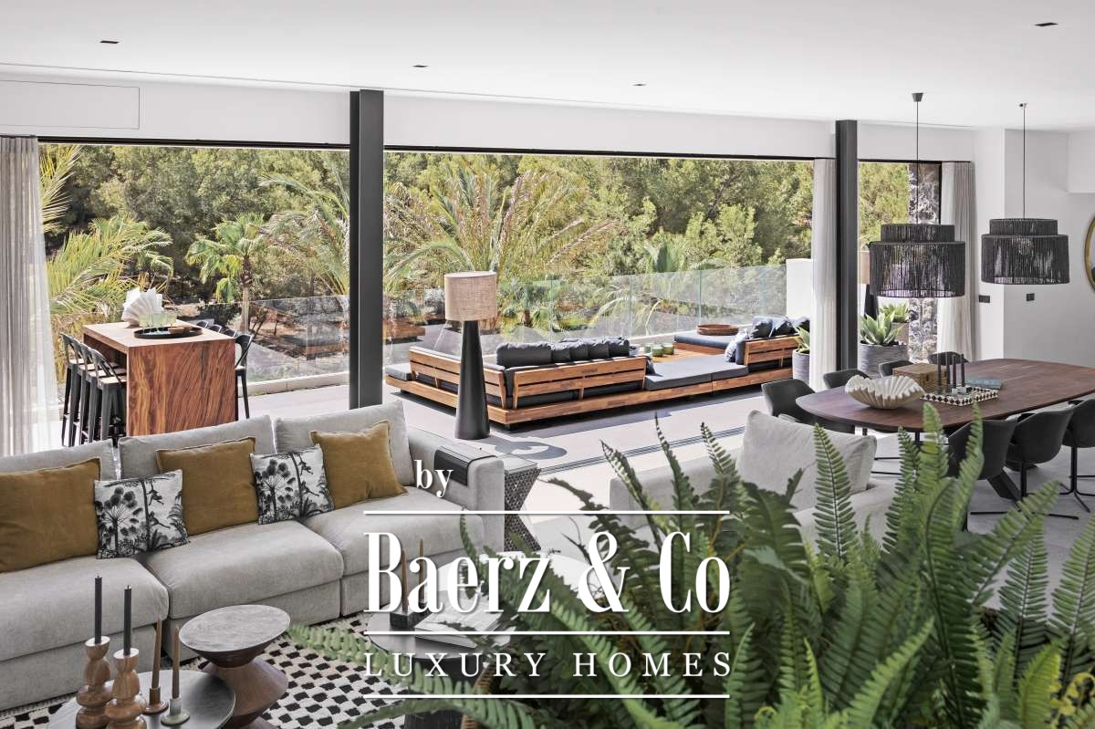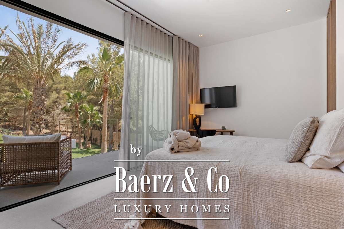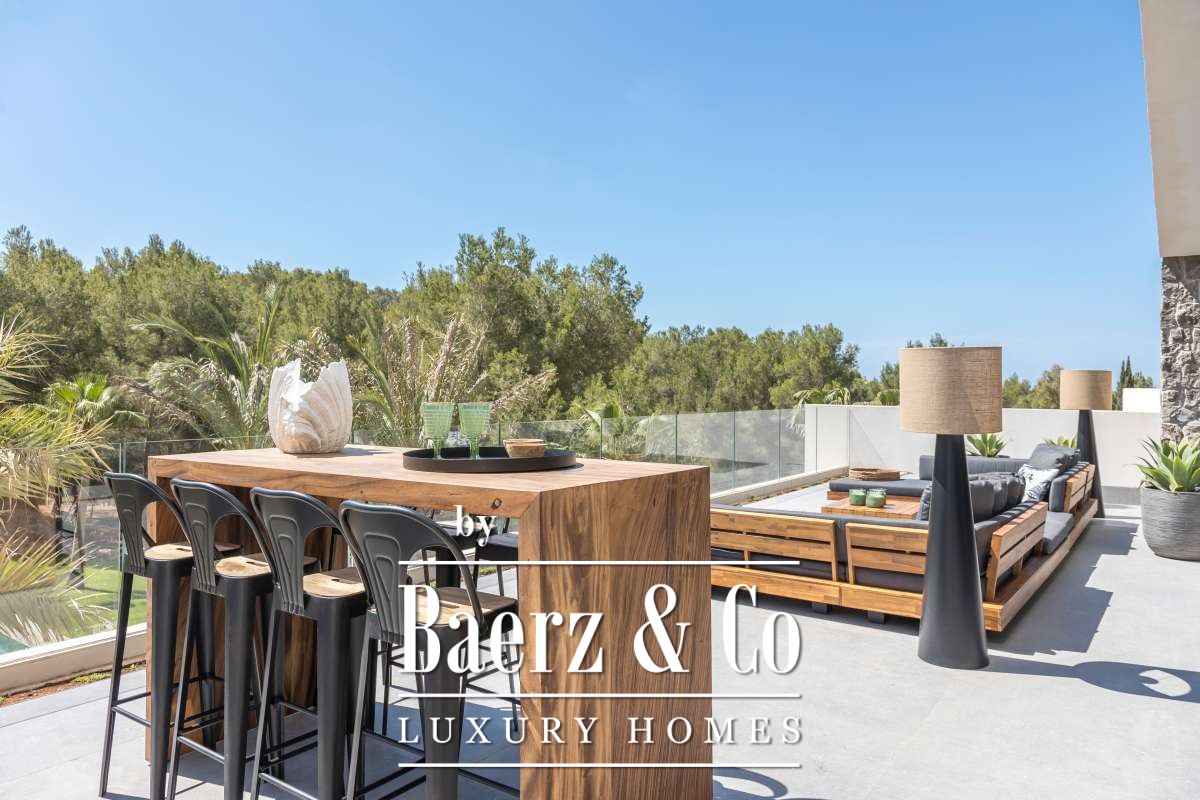 De omgevingEen door Blakstad ontworpen villa, verfijnd, uitgevoerd en opgeleverd door Iván Torres Arquitectos, met de naam "Tauet" heeft een spectaculair uitzicht op Dalt Vila en bevindt zich hoog op een heuvel in een van de meest gewilde woonwijken van het eiland, namelijk Can Furnet. Deze rustige buurt biedt rust en privacy, en ligt op slechts enkele minuten afstand van het charmante dorpje Jesús, waar u al uw dagelijkse benodigdheden kunt vinden. Deze locatie biedt een grote verscheidenheid aan keuzes als het gaat om strandleven. Het dichtstbijzijnde strand is het brede zandstrand van Talamanca, op slechts 8 minuten rijden. Hier kunt u een ontspannen stranddag doorbrengen in de pittoreske baai en heerlijk al-fresco dineren in schilderachtige restaurants aan zee. Voor een meer rustige en ongerepte strandervaring zijn Cala Olivera, Cala Bonita en Cala Espart serene baaien waar u kunt genieten van de pure natuur van het eiland, en dat allemaal binnen 10 minuten rijden. Op slechts 8 minuten rijden richting Ibiza-Stad vindt u het chique gebied van Marina Botafoch met de bekende jachthaven, die de thuisbasis vormt van 's werelds meest indrukwekkende superjachten. Struin rustig over de boulevard en ontdek de luxe designer winkels zoals Louis Vuitton, Hermès en Dior. Geniet ook van culinaire hoogstandjes in de gastronomische restaurants It, Roto en STK, die naast het iconische nachtleven van Ibiza liggen, zoals Lío en Pacha. Enkele minuten verder bevindt u zich in het kloppende hart van het eiland, namelijk het bruisende Ibiza-Stad. Deze charmante stad zit vol cultureel erfgoed, uitgebreide eetgelegenheden, rooftop bars, een jachthaven en een mix van zowel lokale boetieks als internationale winkels. De luchthaven is ook gemakkelijk bereikbaar op slechts 15 minuten rijden van deze rustige residentie. Dit huis biedt het toppunt van luxueus wonen, dicht bij al Ibiza's belangrijkste hotspots, en biedt tegelijkertijd een serene en privé woonervaring met een ongeëvenaard uitzicht.De villaDeze nieuwbouw villa combineert smaakvol modern design met Balinese invloeden. De villa "Tauet" is een uitzonderlijk eigendom dat een warme en uitnodigende sfeer uitstraalt. Een belangrijk hoogtepunt van deze woning is de volledig gemeubileerde oplevering, die direct klaar is om in te trekken. Er is veel aandacht besteed aan de prachtige styling en het algehele interieurontwerp. De villa heeft een bebouwde oppervlakte van 426m2 op een perceel van 1404m2, en is verdeeld over 2 verdiepingen met 5 ruime slaapkamers en 5 luxe badkamers. U betreedt deze moderne woning via een strakke trap die naar een indrukwekkende voordeur leidt. Bij binnenkomst wordt u begroet door een adembenemende entree, een glazen hemelraam dat het interieur baadt in natuurlijk licht. Vanaf hier komt u op de hoofd verdieping en bevindt u zich in een grote, open woon- en eetruimte met prachtig uitzicht op de weelderige omgeving door de kamerhoge ramen van vloer tot plafond. De moderne en volledig uitgeruste keuken is voorzien van een verfijnde keuken bar, perfect om 's ochtends aan uw koffie te nippen of te genieten van een drankje met vrienden. Vanuit de woonkamer heeft u toegang tot het aangrenzende balkon met een lounge- en eethoek die een mooi uitzicht bieden over uw uitnodigende tuin, en zo de perfecte setting creëren voor een naadloze binnen- en buiten leefervaring. Via een imposante moderne trap kunt u de verschillende niveaus van het huis bereiken. De ruime slaapkamers met eigen luxe en suite badkamers bevinden zich allen op de benedenverdiepingen. De master slaapkamers bieden een geweldig uitzicht over de vredige tropische tuin. Ook hebben ze een eigen balkon die uitkijkt over het enorme zwembad, ontwaak hier dagelijks in uw privé paradijs. De overige slaapkamers bieden ook een eigen terras, vol privacy en ontspanning.De buitenruimtesDe villa heeft een schitterende tropische tuin met vele luxe lounge zitjes, perfect om buiten te ontspannen. U vindt er een groot en elegant overloopzwembad in Balinese stijl met geïntegreerde jacuzzi als middelpunt van de tuin. Het zwembad wordt omringd door een fraai groen gazon en tropische palmbomen, wat de perfecte buiten-spa omgeving creëert. Ontspanningsruimtes zijn er in overvloed, waaronder ligstoelen, een Bali-bed en een geïntegreerde zithoek. Naast de serene tuin biedt de villa ook verhoogde buitenterrassen met een adembenemend uitzicht. De bovenste verdieping beschikt over een ruim dakterras met panoramisch uitzicht dat helemaal tot aan Dalt Vila reikt. Het kroonjuweel van de buitenruimtes van de villa is een geweldig dakterras met een tweede overloopzwembad. Organiseer exclusieve diners met dit verbluffende uitzicht of geniet van cocktail avonden onder de sterren voor onvergetelijke avonden. Dit buitengewone dakterras biedt u privacy en totale ontspanning. Om uw veiligheid te garanderen is het pand volledig omheind. Deze droomvilla belichaamt het luxueuze leven en combineert naadloos moderne verfijning met de kalmte van de natuur, waardoor er een exclusieve woonervaring wordt gecreëerd.
