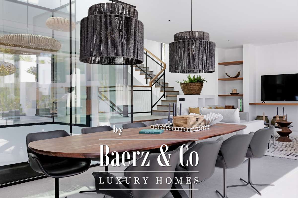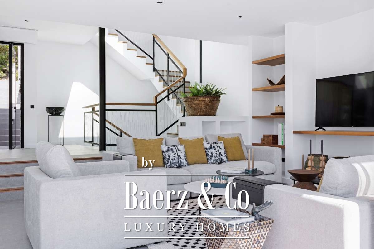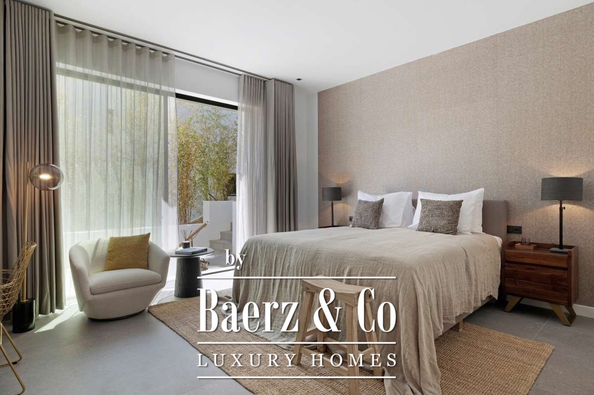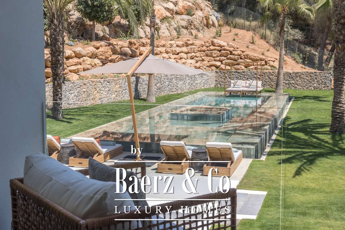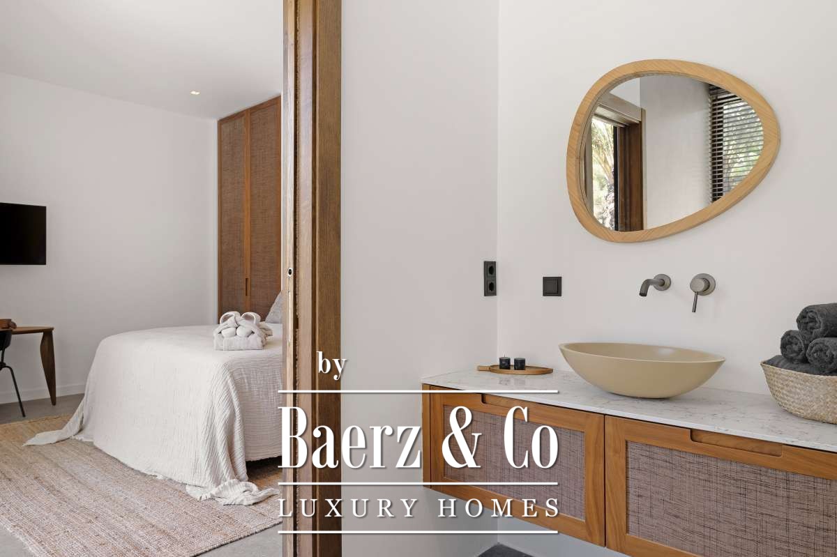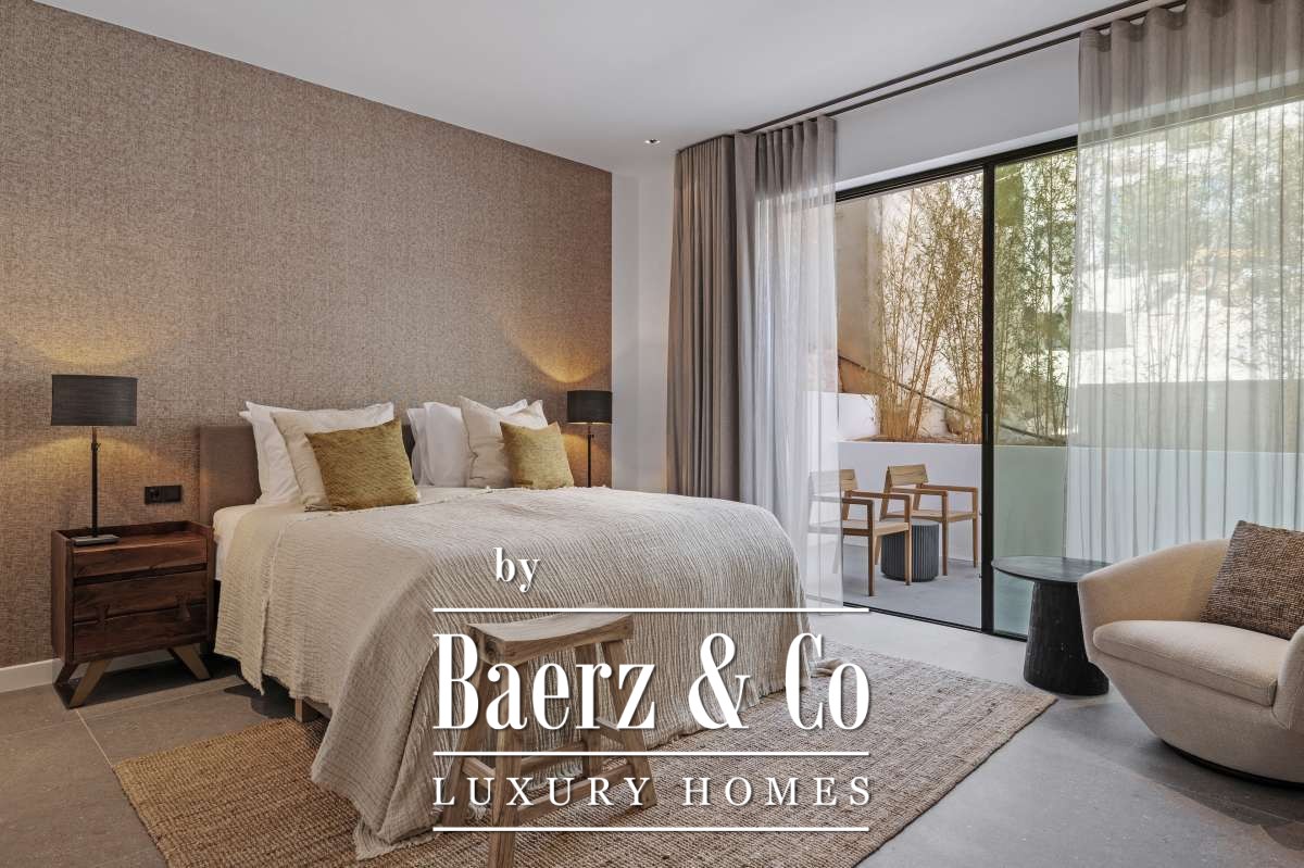 De omgevingEen door Blakstad ontworpen villa, verfijnd, uitgevoerd en opgeleverd door Iván Torres Arquitectos, met de naam "Tauet" heeft een spectaculair uitzicht op Dalt Vila en bevindt zich hoog op een heuvel in een van de meest gewilde woonwijken van het eiland, namelijk Can Furnet. Deze rustige buurt biedt rust en privacy, en ligt op slechts enkele minuten afstand van het charmante dorpje Jesús, waar u al uw dagelijkse benodigdheden kunt vinden. Deze locatie biedt een grote verscheidenheid aan keuzes als het gaat om strandleven. Het dichtstbijzijnde strand is het brede zandstrand van Talamanca, op slechts 8 minuten rijden. Hier kunt u een ontspannen stranddag doorbrengen in de pittoreske baai en heerlijk al-fresco dineren in schilderachtige restaurants aan zee. Voor een meer rustige en ongerepte strandervaring zijn Cala Olivera, Cala Bonita en Cala Espart serene baaien waar u kunt genieten van de pure natuur van het eiland, en dat allemaal binnen 10 minuten rijden. Op slechts 8 minuten rijden richting Ibiza-Stad vindt u het chique gebied van Marina Botafoch met de bekende jachthaven, die de thuisbasis vormt van 's werelds meest indrukwekkende superjachten. Struin rustig over de boulevard en ontdek de luxe designer winkels zoals Louis Vuitton, Hermès en Dior. Geniet ook van culinaire hoogstandjes in de gastronomische restaurants It, Roto en STK, die naast het iconische nachtleven van Ibiza liggen, zoals Lío en Pacha. Enkele minuten verder bevindt u zich in het kloppende hart van het eiland, namelijk het bruisende Ibiza-Stad. Deze charmante stad zit vol cultureel erfgoed, uitgebreide eetgelegenheden, rooftop bars, een jachthaven en een mix van zowel lokale boetieks als internationale winkels. De luchthaven is ook gemakkelijk bereikbaar op slechts 15 minuten rijden van deze rustige residentie. Dit huis biedt het toppunt van luxueus wonen, dicht bij al Ibiza's belangrijkste hotspots, en biedt tegelijkertijd een serene en privé woonervaring met een ongeëvenaard uitzicht.De villaDeze nieuwbouw villa combineert smaakvol modern design met Balinese invloeden. De villa "Tauet" is een uitzonderlijk eigendom dat een warme en uitnodigende sfeer uitstraalt. Een belangrijk hoogtepunt van deze woning is de volledig gemeubileerde oplevering, die direct klaar is om in te trekken. Er is veel aandacht besteed aan de prachtige styling en het algehele interieurontwerp. De villa heeft een bebouwde oppervlakte van 426m2 op een perceel van 1404m2, en is verdeeld over 2 verdiepingen met 5 ruime slaapkamers en 5 luxe badkamers. U betreedt deze moderne woning via een strakke trap die naar een indrukwekkende voordeur leidt. Bij binnenkomst wordt u begroet door een adembenemende entree, een glazen hemelraam dat het interieur baadt in natuurlijk licht. Vanaf hier komt u op de hoofd verdieping en bevindt u zich in een grote, open woon- en eetruimte met prachtig uitzicht op de weelderige omgeving door de kamerhoge ramen van vloer tot plafond. De moderne en volledig uitgeruste keuken is voorzien van een verfijnde keuken bar, perfect om 's ochtends aan uw koffie te nippen of te genieten van een drankje met vrienden. Vanuit de woonkamer heeft u toegang tot het aangrenzende balkon met een lounge- en eethoek die een mooi uitzicht bieden over uw uitnodigende tuin, en zo de perfecte setting creëren voor een naadloze binnen- en buiten leefervaring. Via een imposante moderne trap kunt u de verschillende niveaus van het huis bereiken. De ruime slaapkamers met eigen luxe en suite badkamers bevinden zich allen op de benedenverdiepingen. De master slaapkamers bieden een geweldig uitzicht over de vredige tropische tuin. Ook hebben ze een eigen balkon die uitkijkt over het enorme zwembad, ontwaak hier dagelijks in uw privé paradijs. De overige slaapkamers bieden ook een eigen terras, vol privacy en ontspanning.De buitenruimtesDe villa heeft een schitterende tropische tuin met vele luxe lounge zitjes, perfect om buiten te ontspannen. U vindt er een groot en elegant overloopzwembad in Balinese stijl met geïntegreerde jacuzzi als middelpunt van de tuin. Het zwembad wordt omringd door een fraai groen gazon en tropische palmbomen, wat de perfecte buiten-spa omgeving creëert. Ontspanningsruimtes zijn er in overvloed, waaronder ligstoelen, een Bali-bed en een geïntegreerde zithoek. Naast de serene tuin biedt de villa ook verhoogde buitenterrassen met een adembenemend uitzicht. De bovenste verdieping beschikt over een ruim dakterras met panoramisch uitzicht dat helemaal tot aan Dalt Vila reikt. Het kroonjuweel van de buitenruimtes van de villa is een geweldig dakterras met een tweede overloopzwembad. Organiseer exclusieve diners met dit verbluffende uitzicht of geniet van cocktail avonden onder de sterren voor onvergetelijke avonden. Dit buitengewone dakterras biedt u privacy en totale ontspanning. Om uw veiligheid te garanderen is het pand volledig omheind. Deze droomvilla belichaamt het luxueuze leven en combineert naadloos moderne verfijning met de kalmte van de natuur, waardoor er een exclusieve woonervaring wordt gecreëerd.