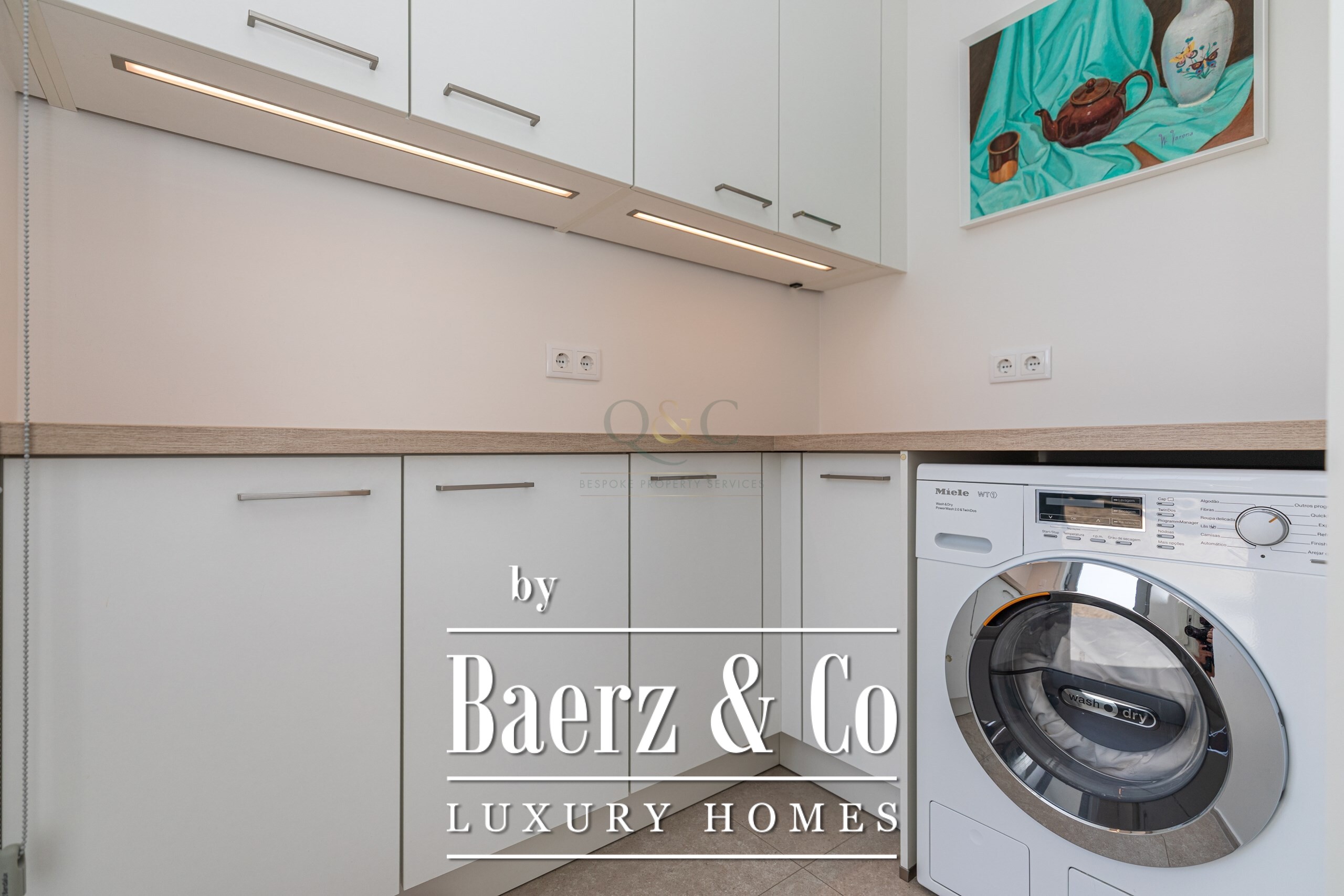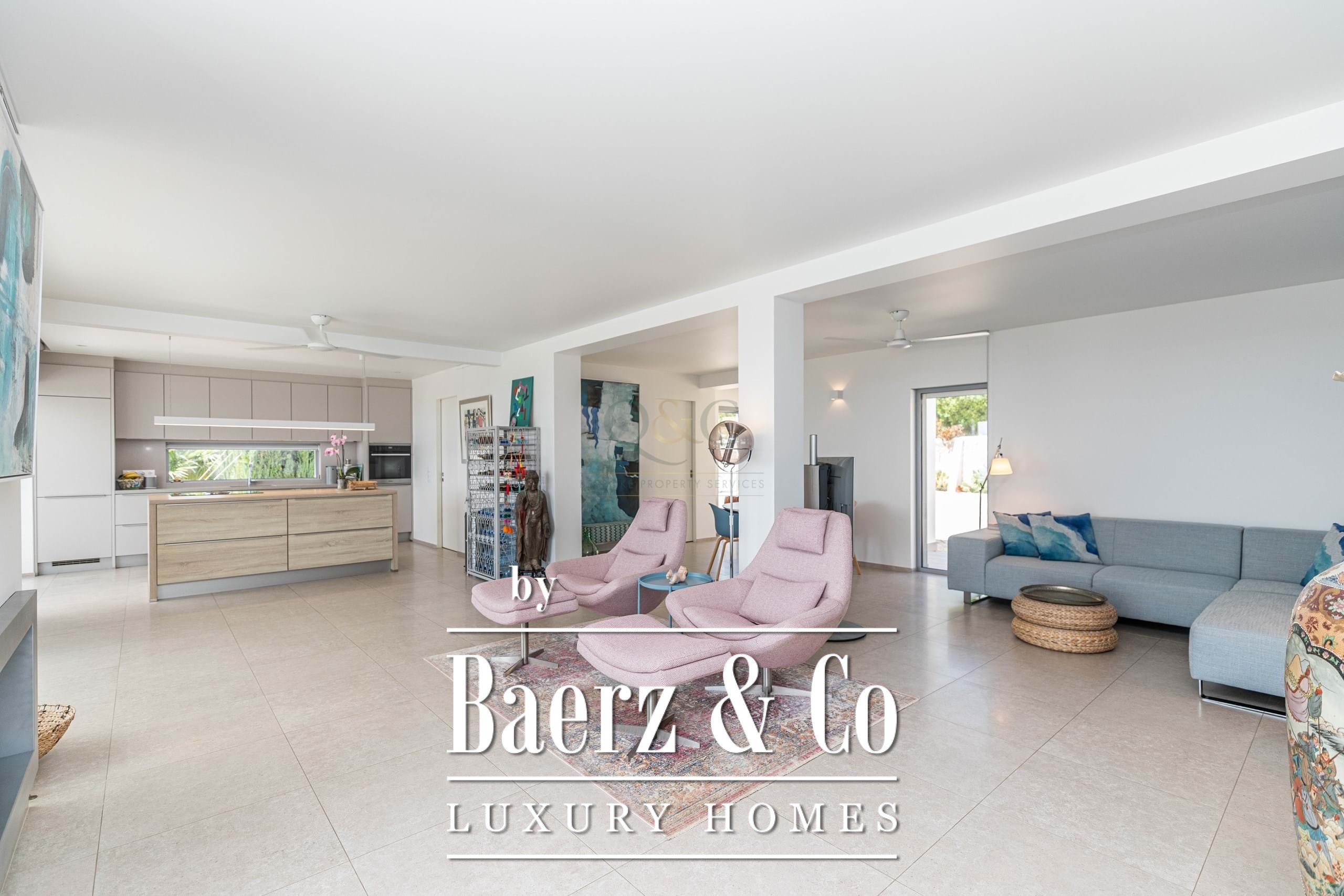 In de villa vult het daglicht ieder vertrek binnen de 302 m² aan verfijnde woonruimte. De royale entreehal loopt door naar een indrukwekkende open woonkamer van 80 m², waar kamerhoge raampartijen de binnenruimte laten overlopen in een brede veranda. Architectonische lijnen en natuurlijke afwerkingen geven het geheel een moderne ingetogenheid, met op maat gemaakte details en vloerverwarming voor comfort het hele jaar door. De keuken wordt gekenmerkt door een centraal eiland, hoogwaardige apparatuur en directe toegang tot het terras. Extra functionaliteit wordt geboden door een aparte wasruimte met eigen dienstingang.