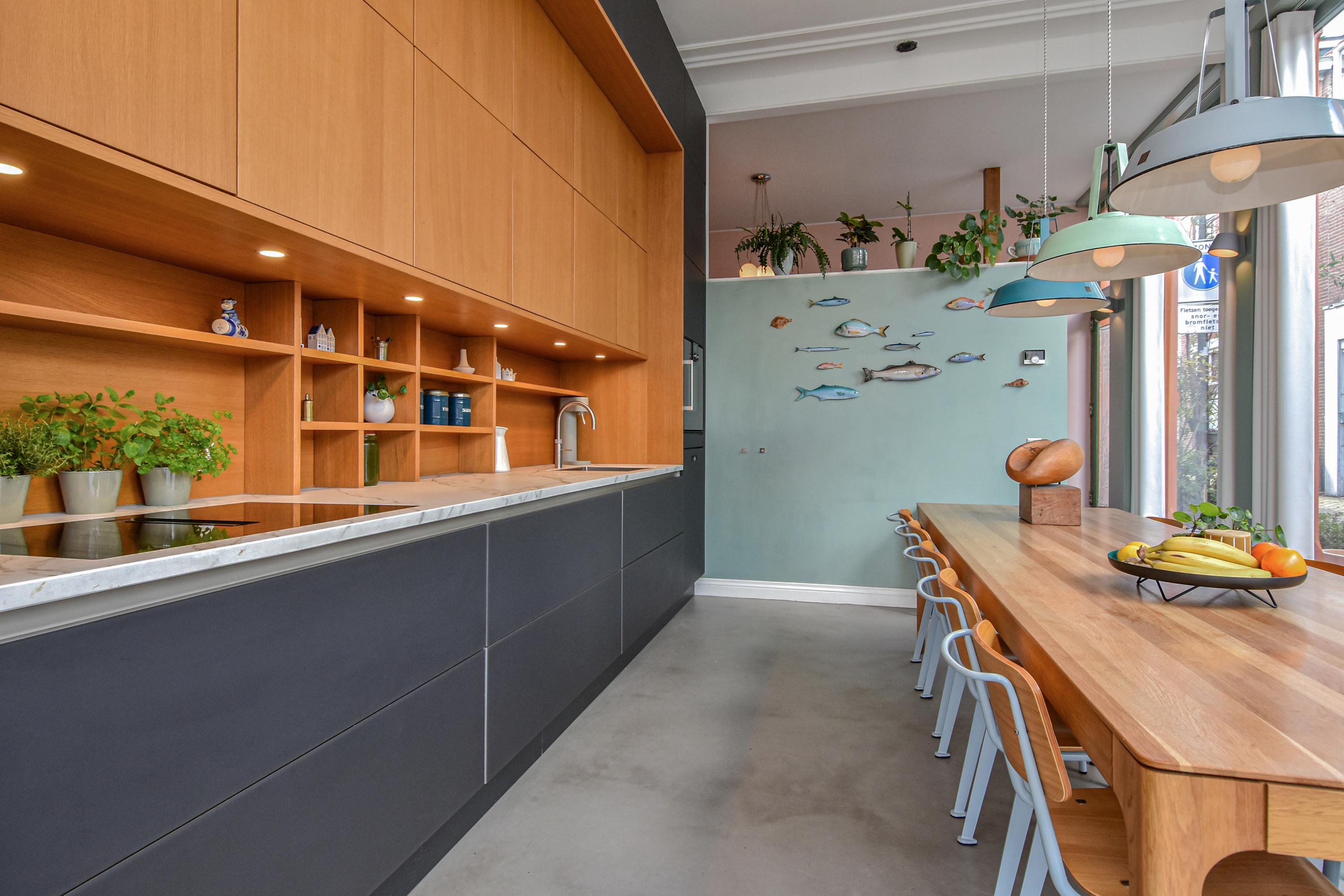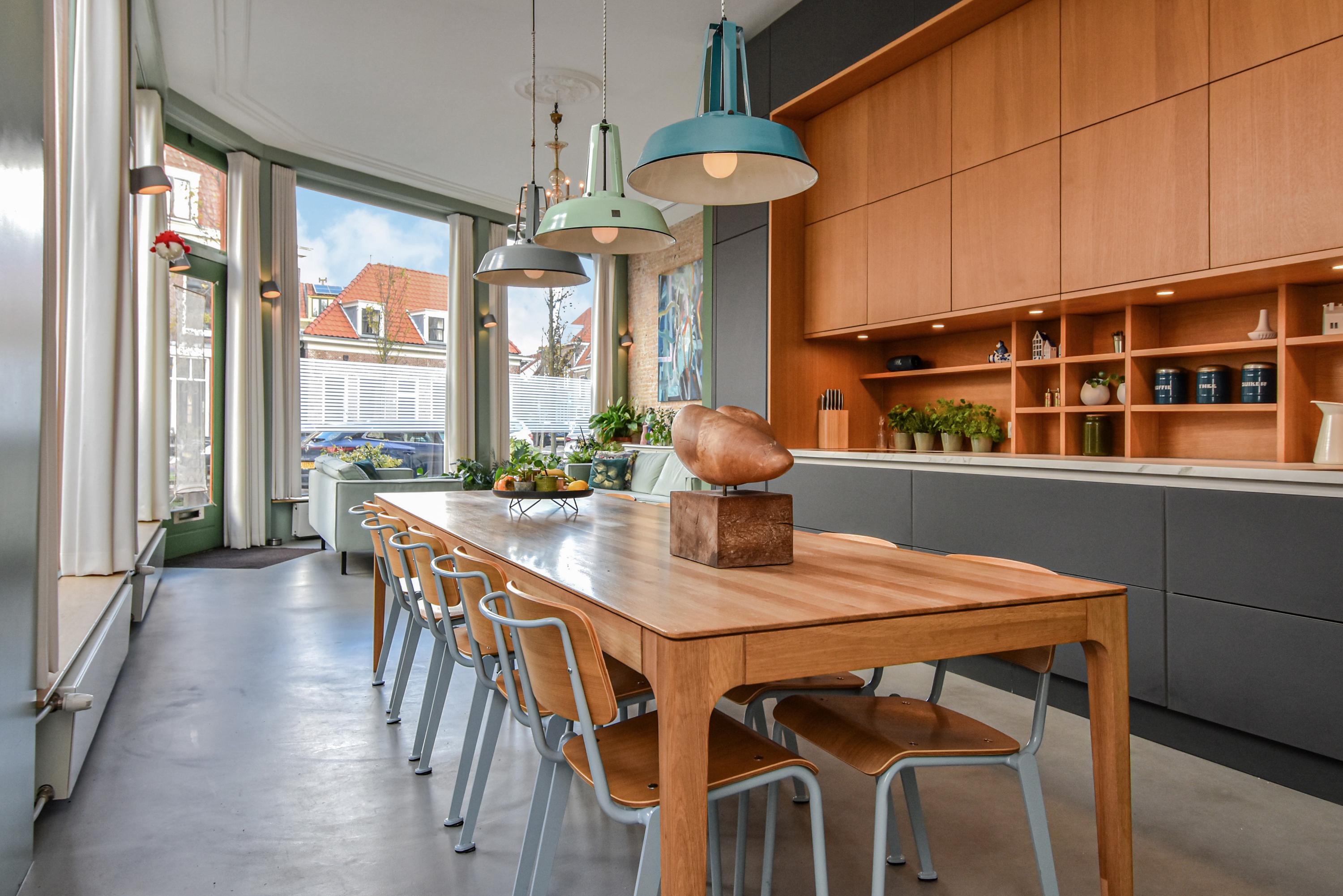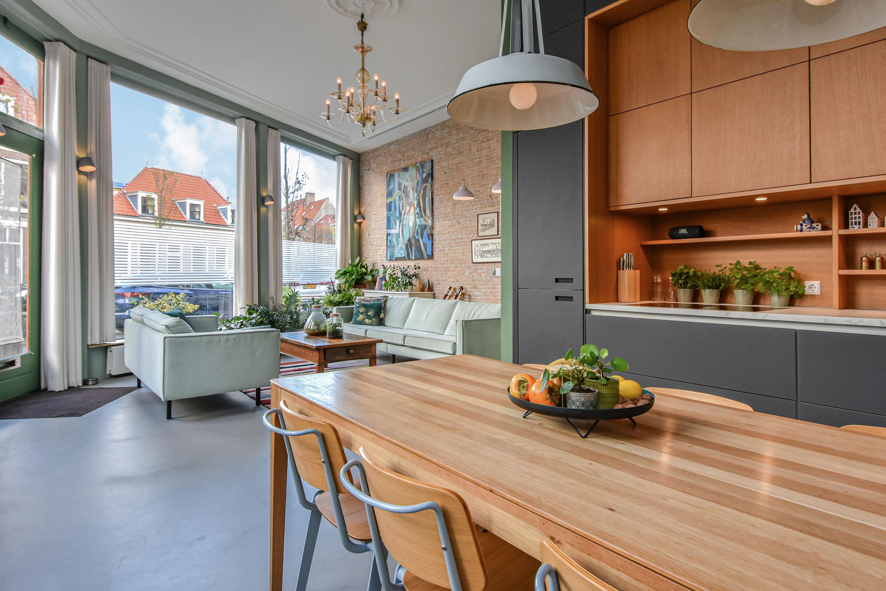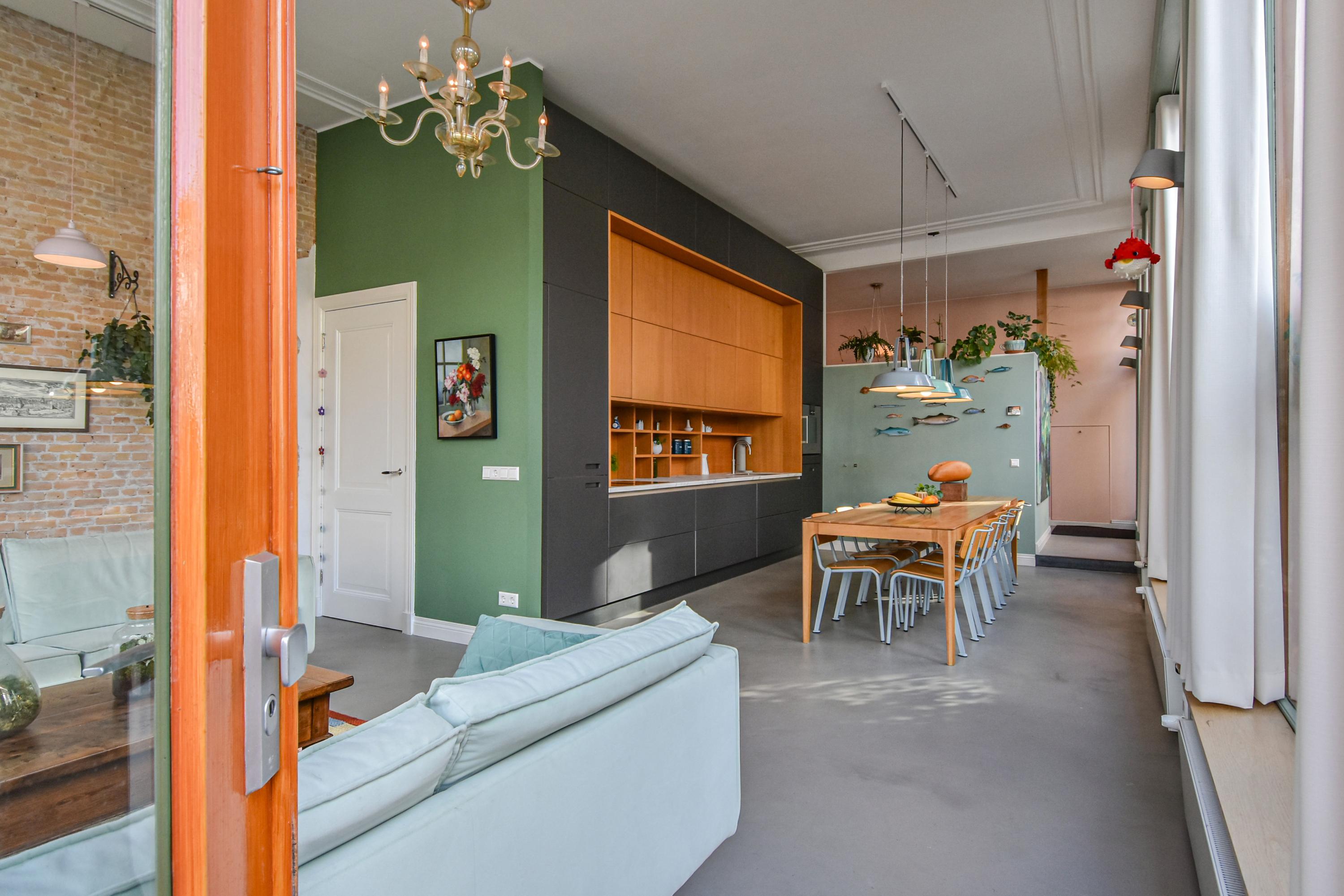 Bij binnenkomst word je direct verrast door de prachtige woonkeuken met haar indrukwekkende hoge glazen puien en een plafondhoogte van maar liefst 3,55 meter. In het plafond zit de originele gestucte sierlijst. De ruimte baadt in het licht en biedt volop plek voor een royale eettafel. De stijlvol afgewerkte keuken vormt het hart van de woning: een fijne ruimte met luxe inbouwapparatuur, waar je met plezier kookt en gasten ontvangt.