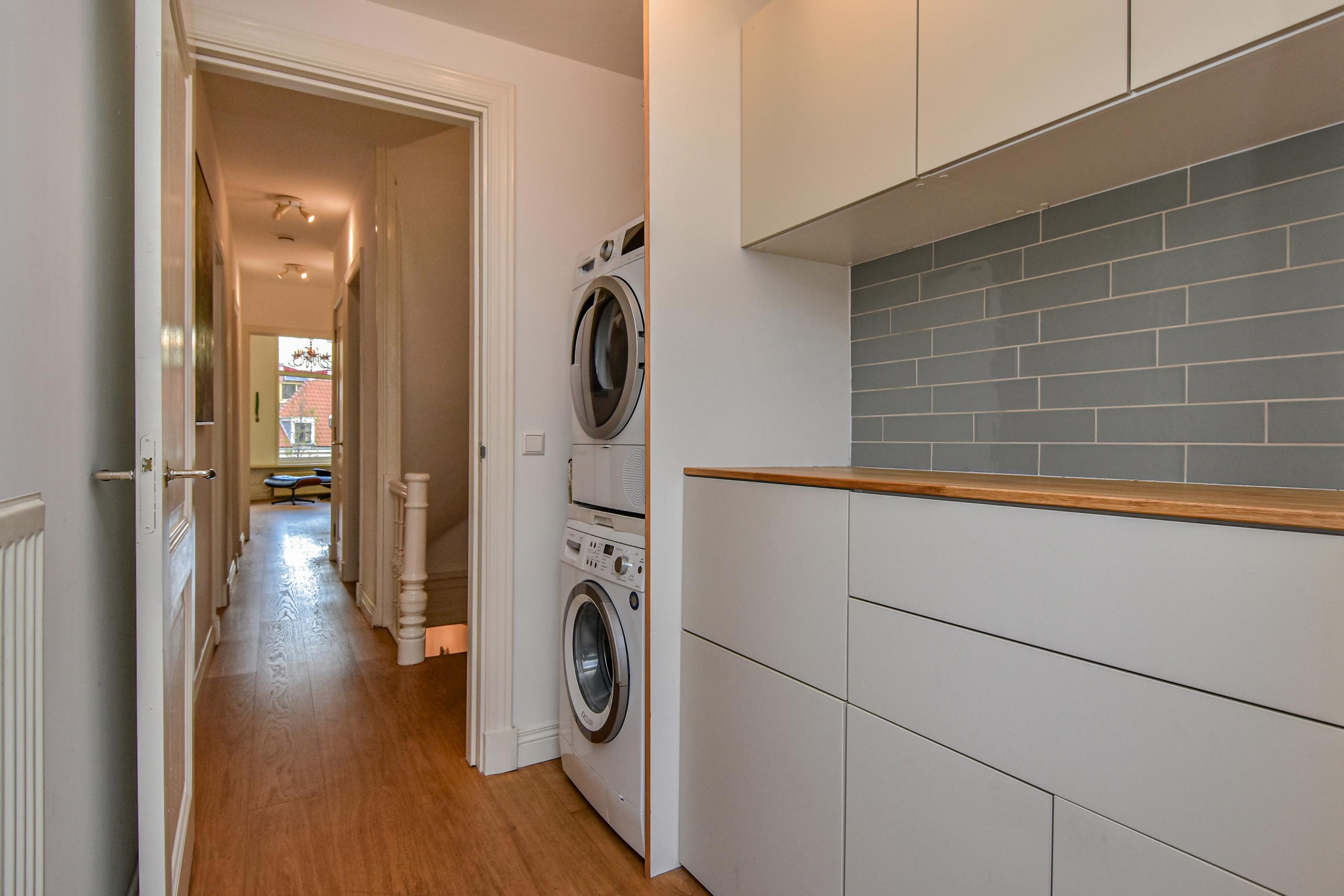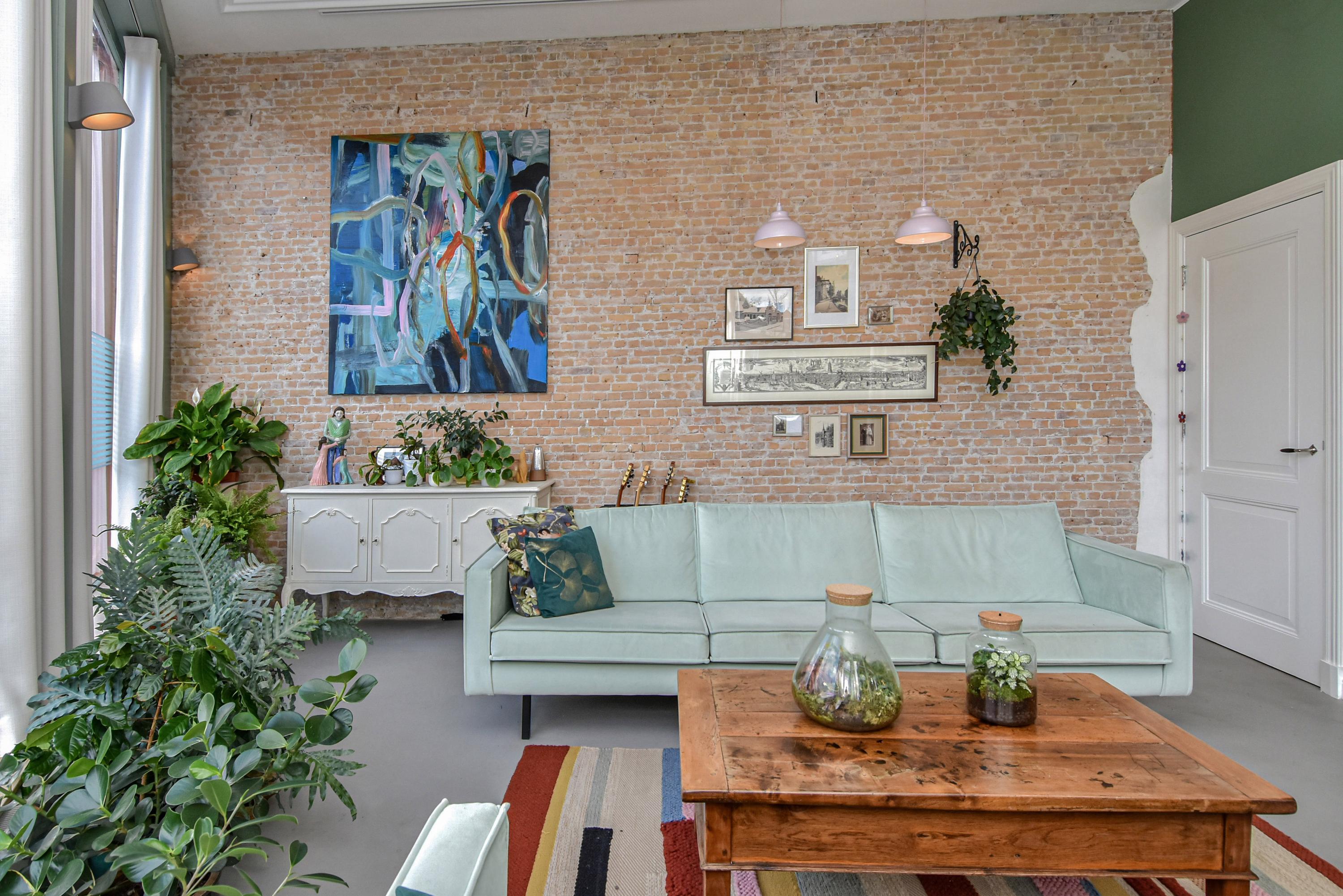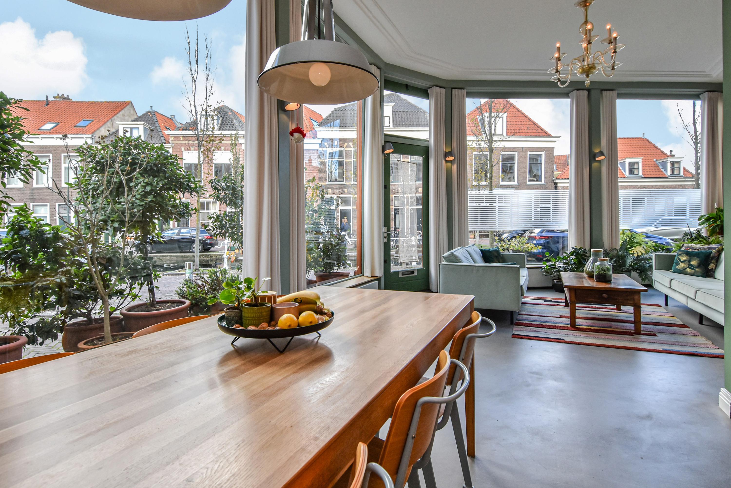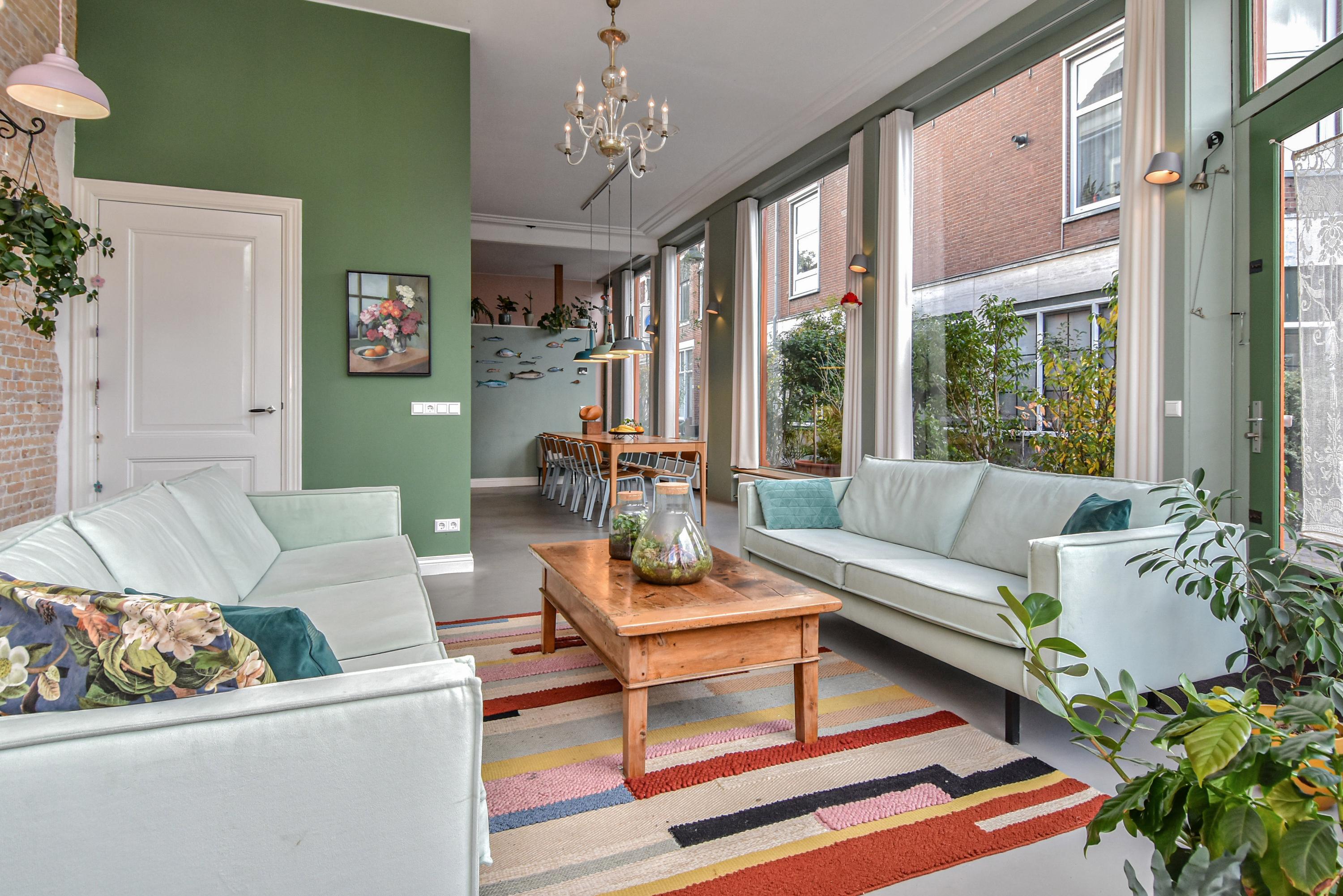 Bij binnenkomst word je direct verrast door de prachtige woonkeuken met haar indrukwekkende hoge glazen puien en een plafondhoogte van maar liefst 3,55 meter. In het plafond zit de originele gestucte sierlijst. De ruimte baadt in het licht en biedt volop plek voor een royale eettafel. De stijlvol afgewerkte keuken vormt het hart van de woning: een fijne ruimte met luxe inbouwapparatuur, waar je met plezier kookt en gasten ontvangt.