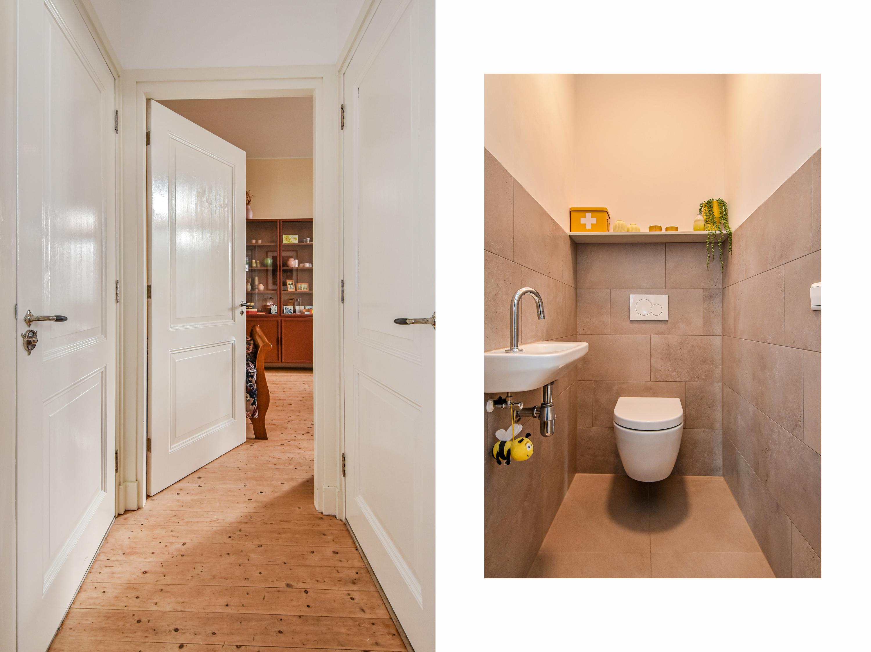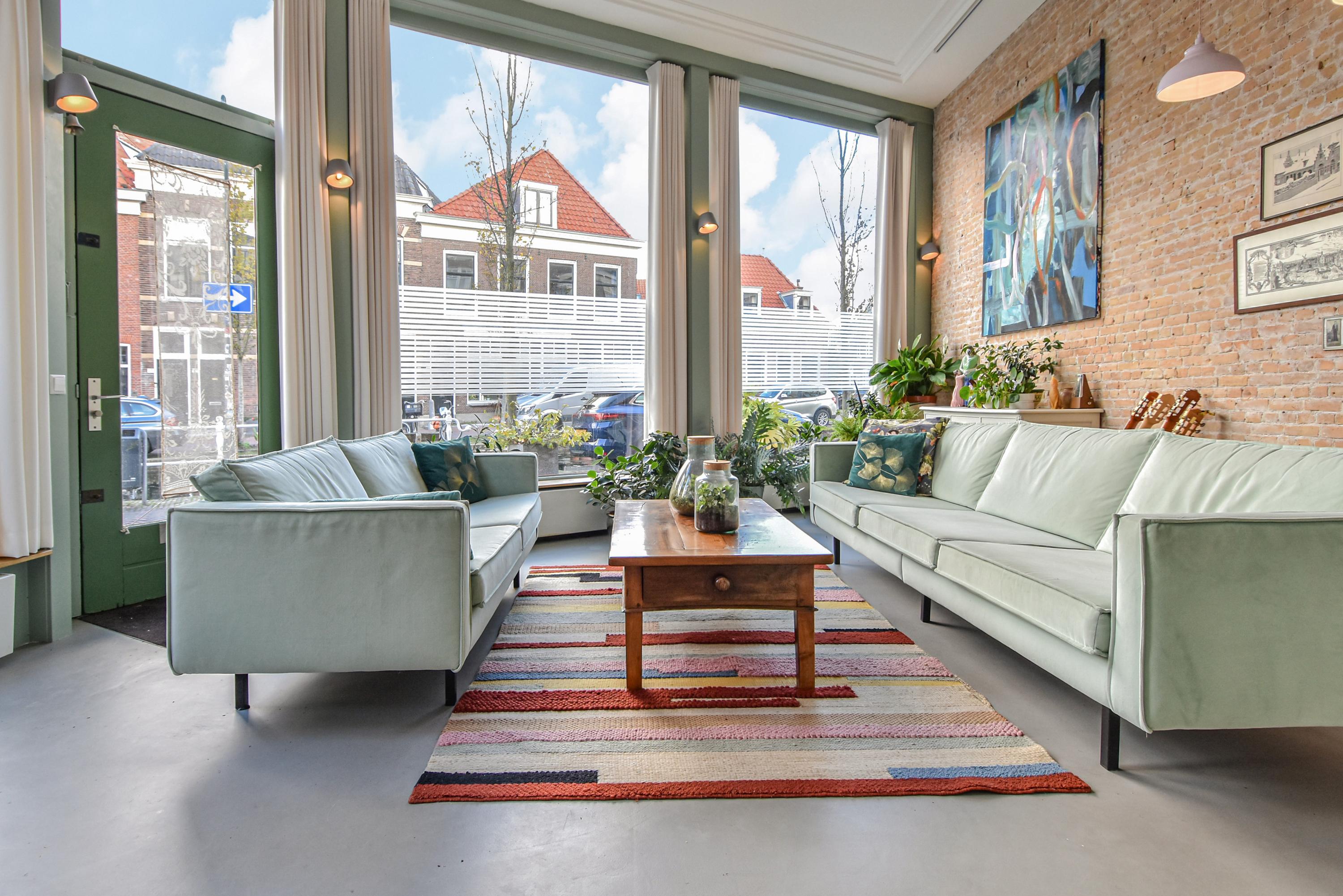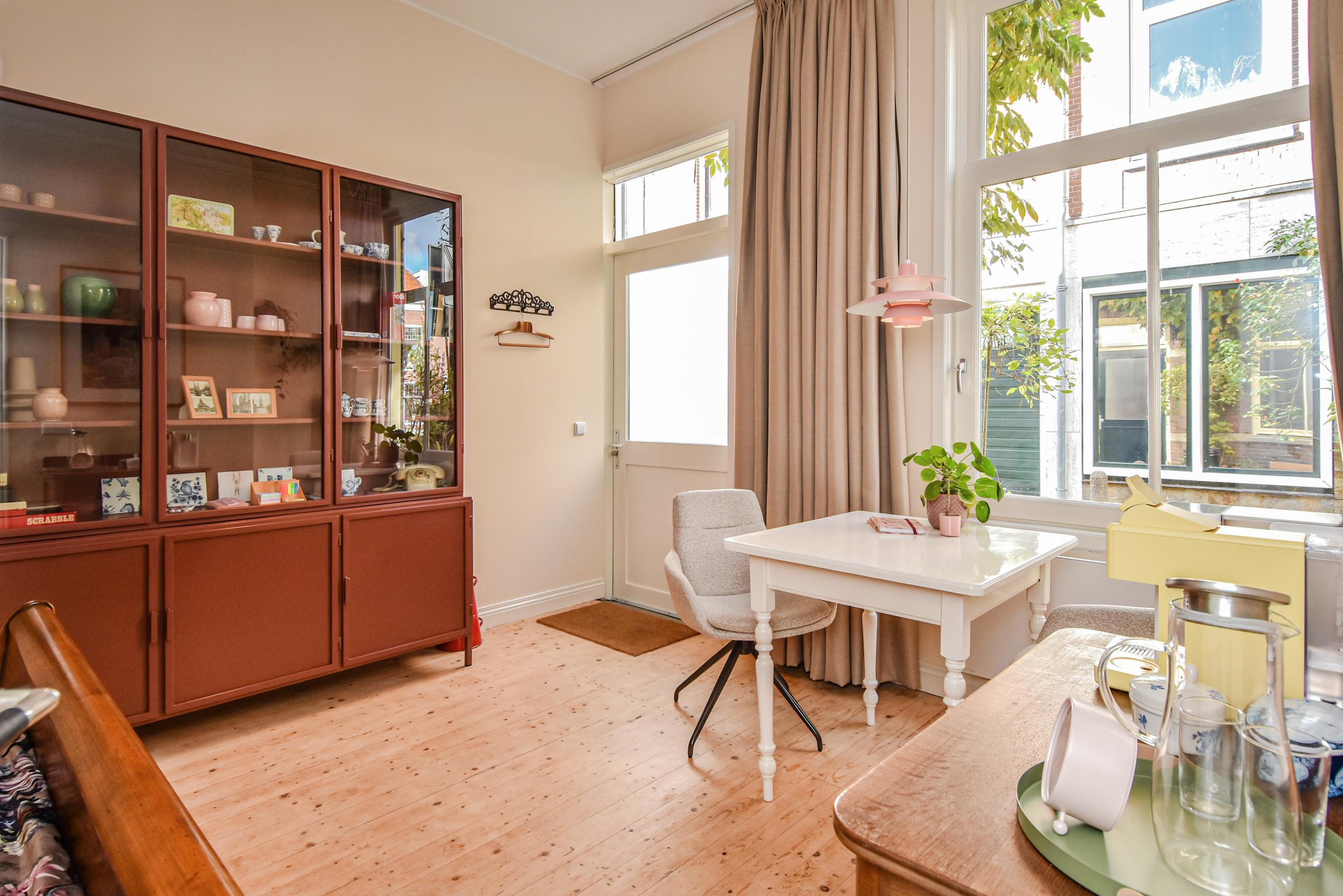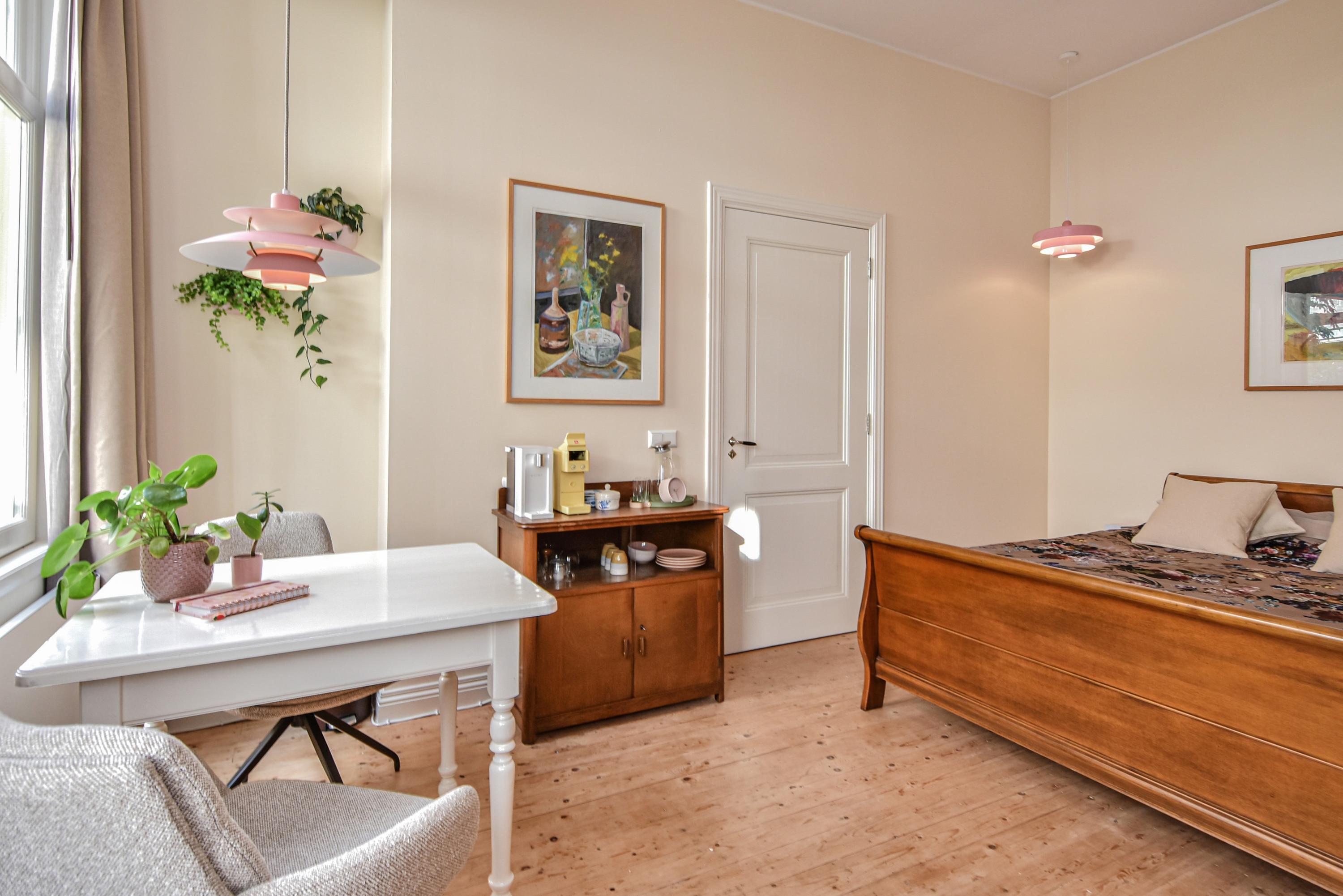 Aan weerszijden van de keuken bevinden zich twee sfeervolle leefruimtes: aan de ene kant een zitkamer en aan de andere kant een knusse woonkamer met een gezellige zithoek. Aangrenzend bevindt zich de inpandige studio, eveneens met een fraaie hoogte en openslaande deuren naar de straat. Deze ruimte is ingericht als slaapkamer met een eigen badkamer voorzien van inloopdouche, dubbele wastafel en toilet — ideaal als gastenverblijf, aanleunwoning, kantoor of praktijkruimte aan huis. Aan de achterzijde is een grote, praktische fietsenberging met vliering. Deze heeft toegang via de Broerhuisstraat. Vanuit de woonkamer leidt een rechte trap naar de eerste verdieping.