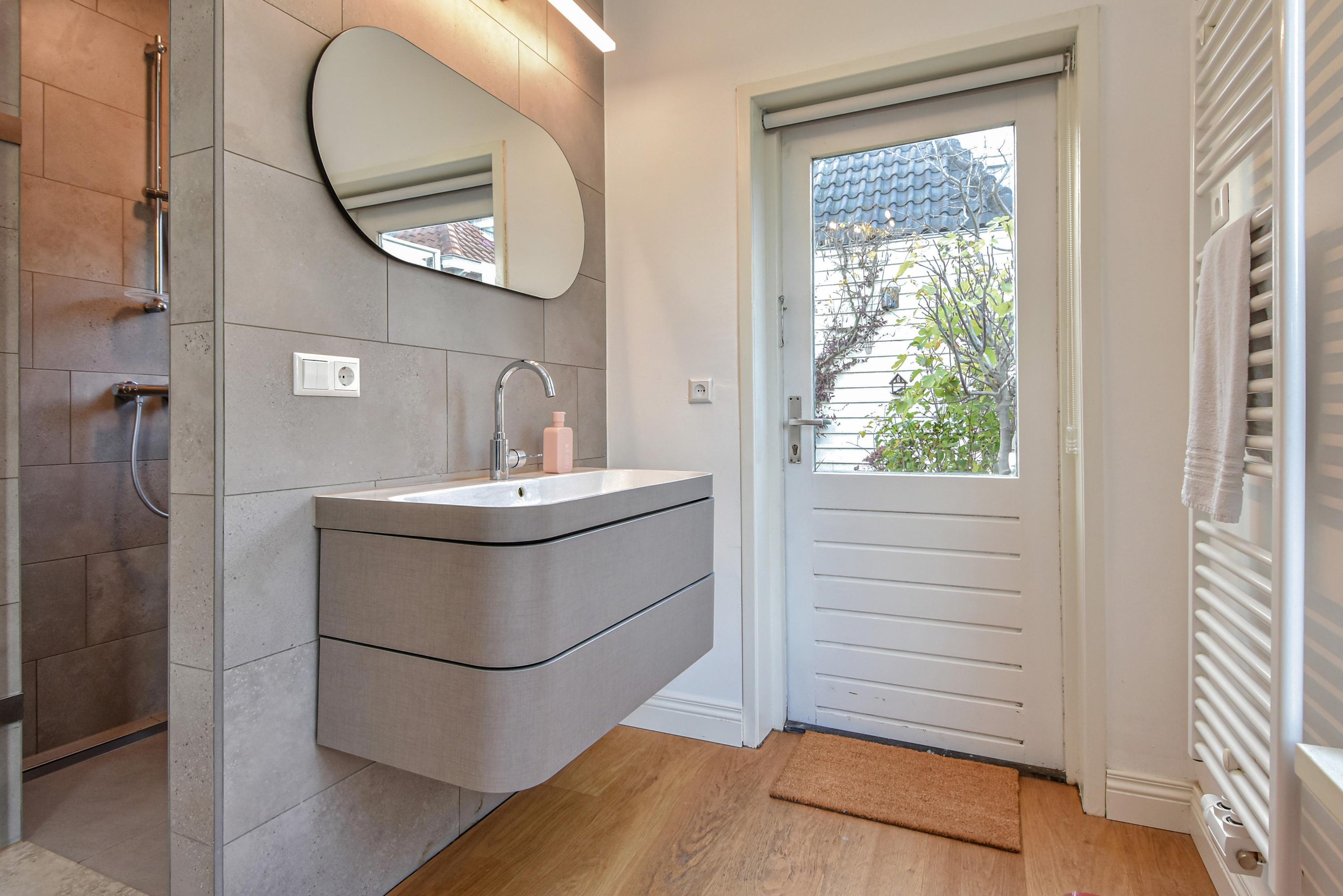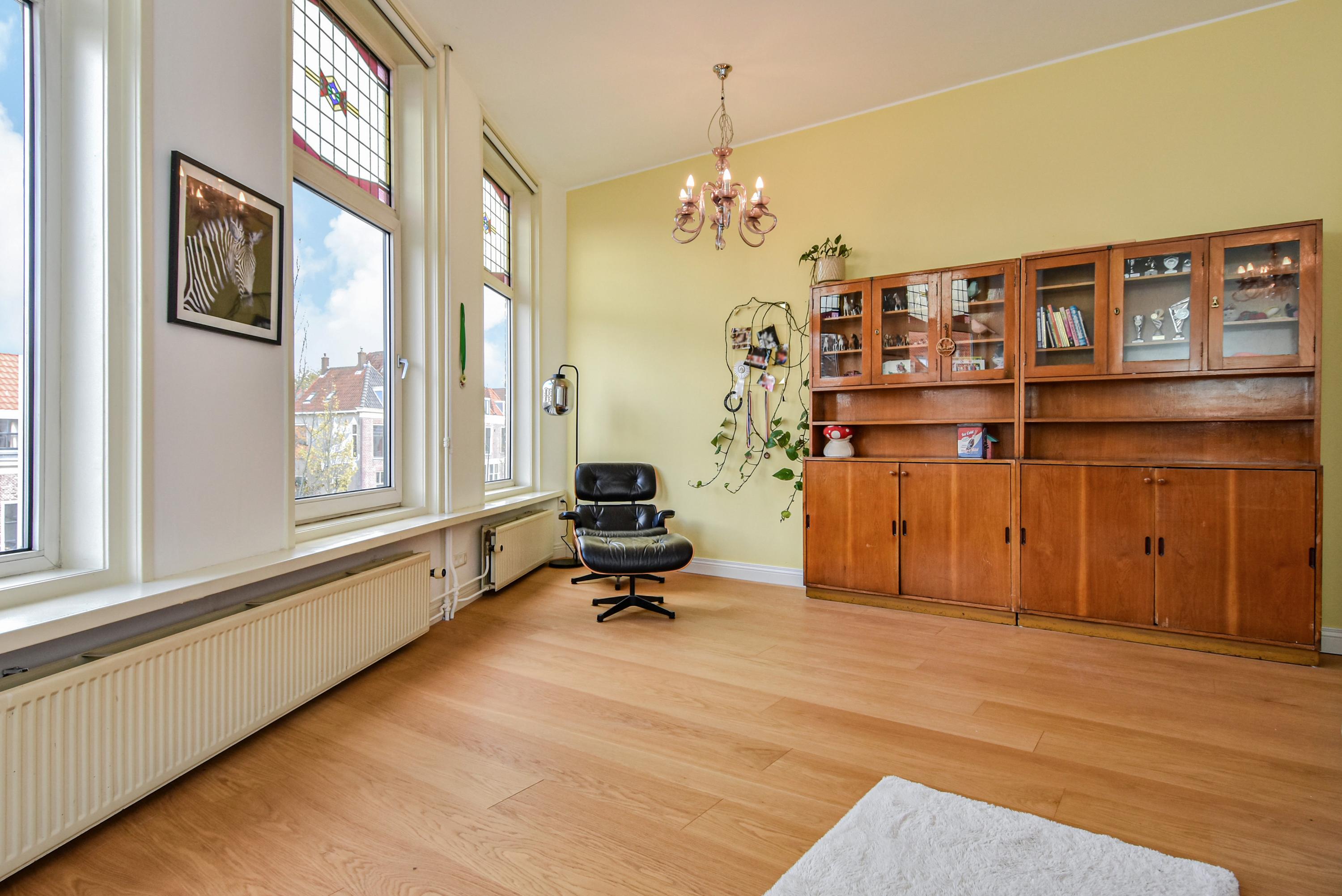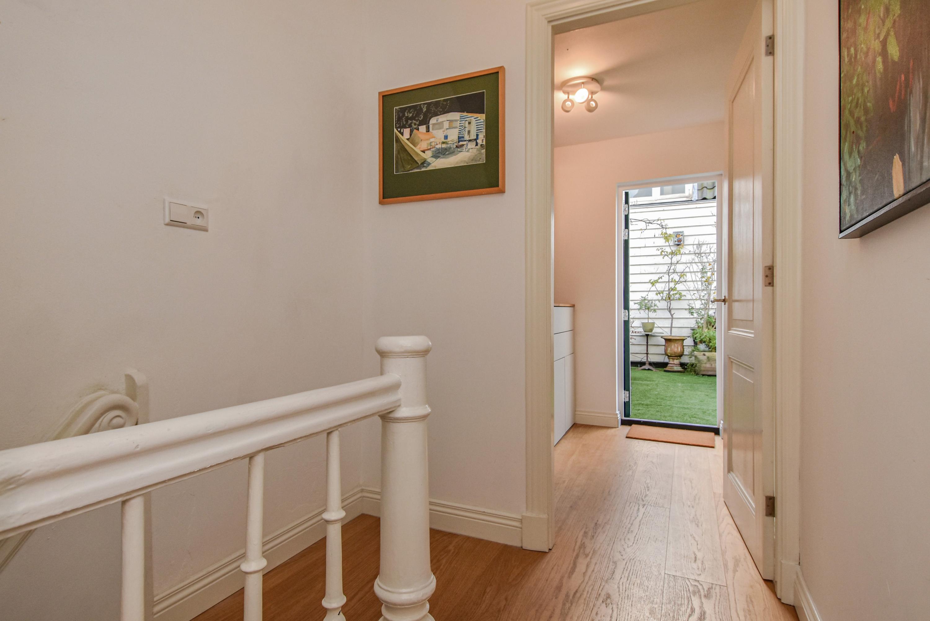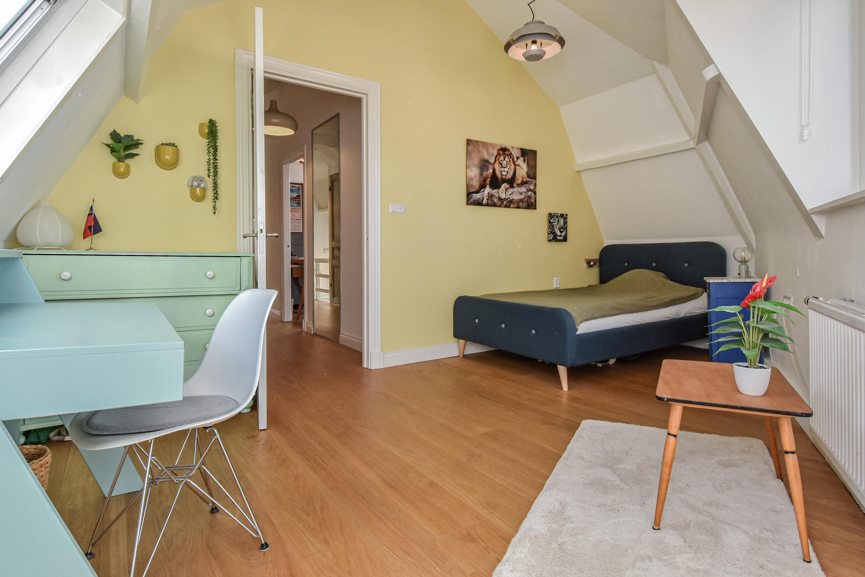 Aan weerszijden van de keuken bevinden zich twee sfeervolle leefruimtes: aan de ene kant een zitkamer en aan de andere kant een knusse woonkamer met een gezellige zithoek. Aangrenzend bevindt zich de inpandige studio, eveneens met een fraaie hoogte en openslaande deuren naar de straat. Deze ruimte is ingericht als slaapkamer met een eigen badkamer voorzien van inloopdouche, dubbele wastafel en toilet — ideaal als gastenverblijf, aanleunwoning, kantoor of praktijkruimte aan huis. Aan de achterzijde is een grote, praktische fietsenberging met vliering. Deze heeft toegang via de Broerhuisstraat. Vanuit de woonkamer leidt een rechte trap naar de eerste verdieping.
