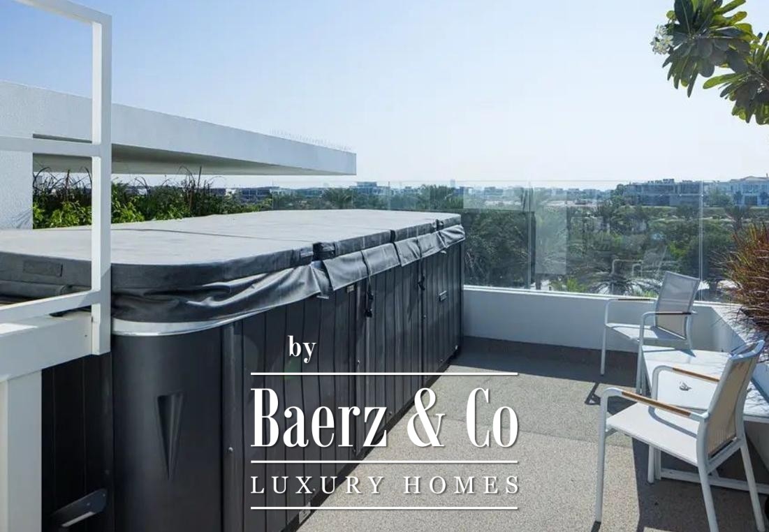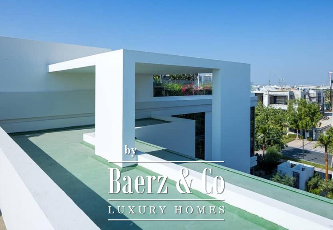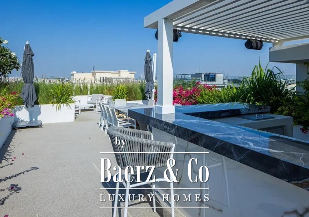 De woning beschikt over zes slaapkamers, elk met een eigen en-suite badkamer. Meerdere verfijnde ontvangstruimtes, een formele eetkamer en een privévergaderkamer zorgen voor moeiteloze overgangen tussen werk, ontspanning en sociale bijeenkomsten. Afzonderlijke vertrekken voor huishoudelijk personeel en bedienden zijn doordacht geïntegreerd. Een privé-kantoor biedt optimale focus, terwijl zowel een showcooking-keuken als een volledig uitgeruste functionele keuken flexibele culinaire mogelijkheden bieden. De thuisbioscoop, fitnessruimte en een dakterras maken het huis compleet voor vrije tijd. Buiten kijkt een groot terras uit over de skyline, nodigt het zwembad uit tot rustige ochtenden en zorgt het bubbelbad voor het ultieme gevoel van ontspanning.