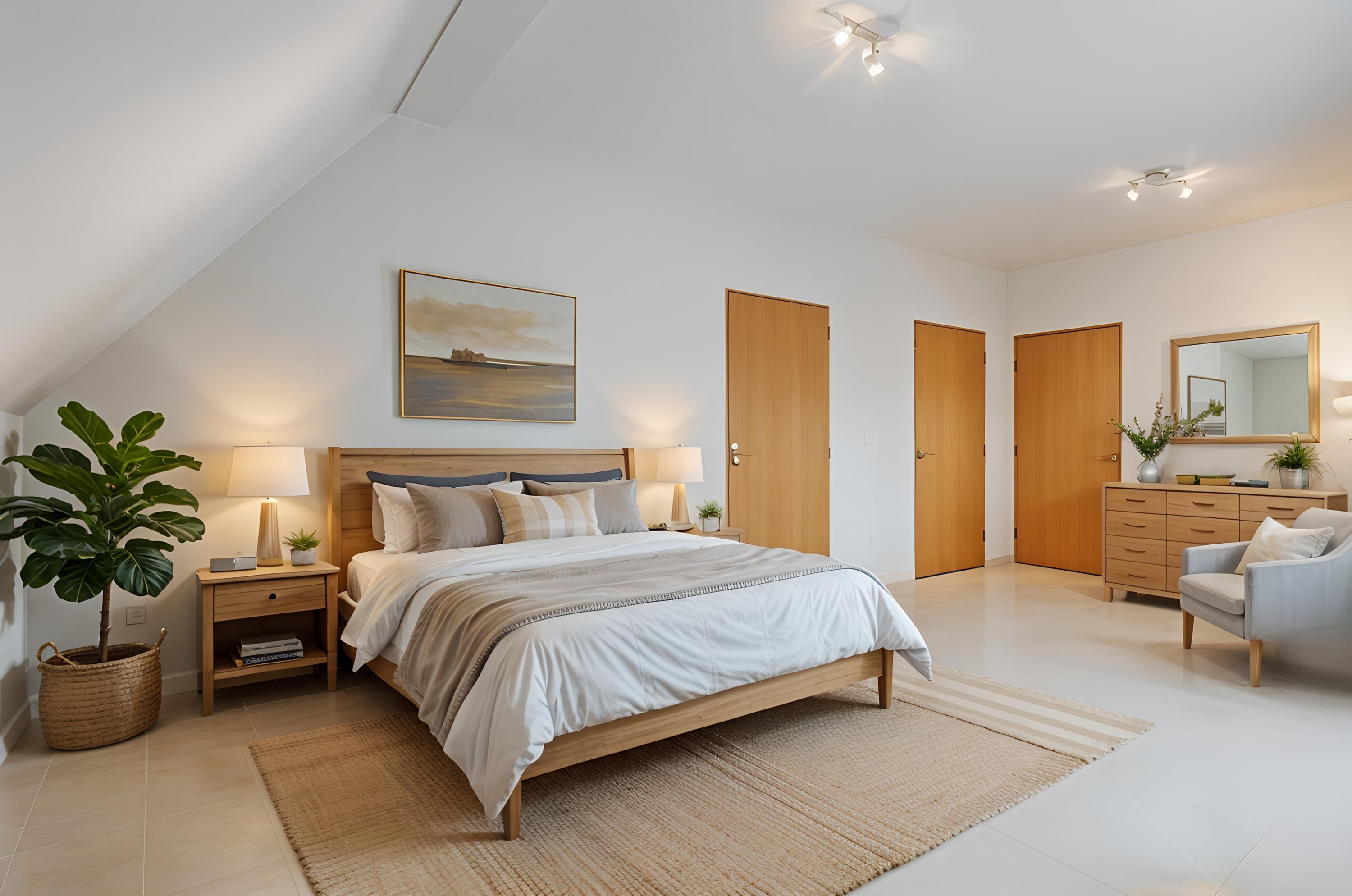 De hoofdslaapkamer beschikt over maatwerk garderobekasten, dubbele deuren naar het balkon en een luxe en-suite badkamer. Deze royale ruimte heeft een inloopdouche en een tweede douche met antislipvloer, ideaal voor minder valide bewoners. Ook is er een dubbel wastafelmeubel en een wandcloset aanwezig.