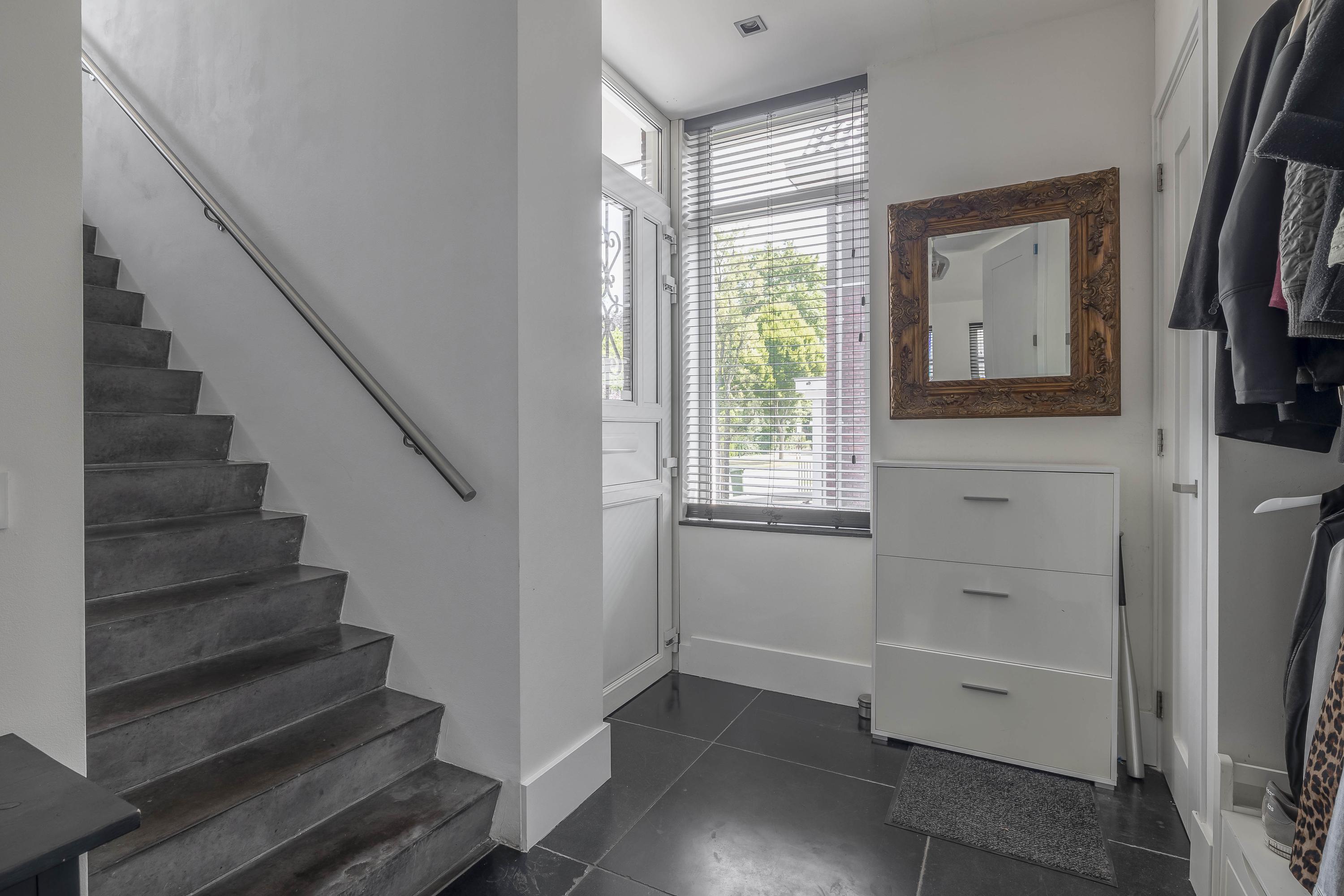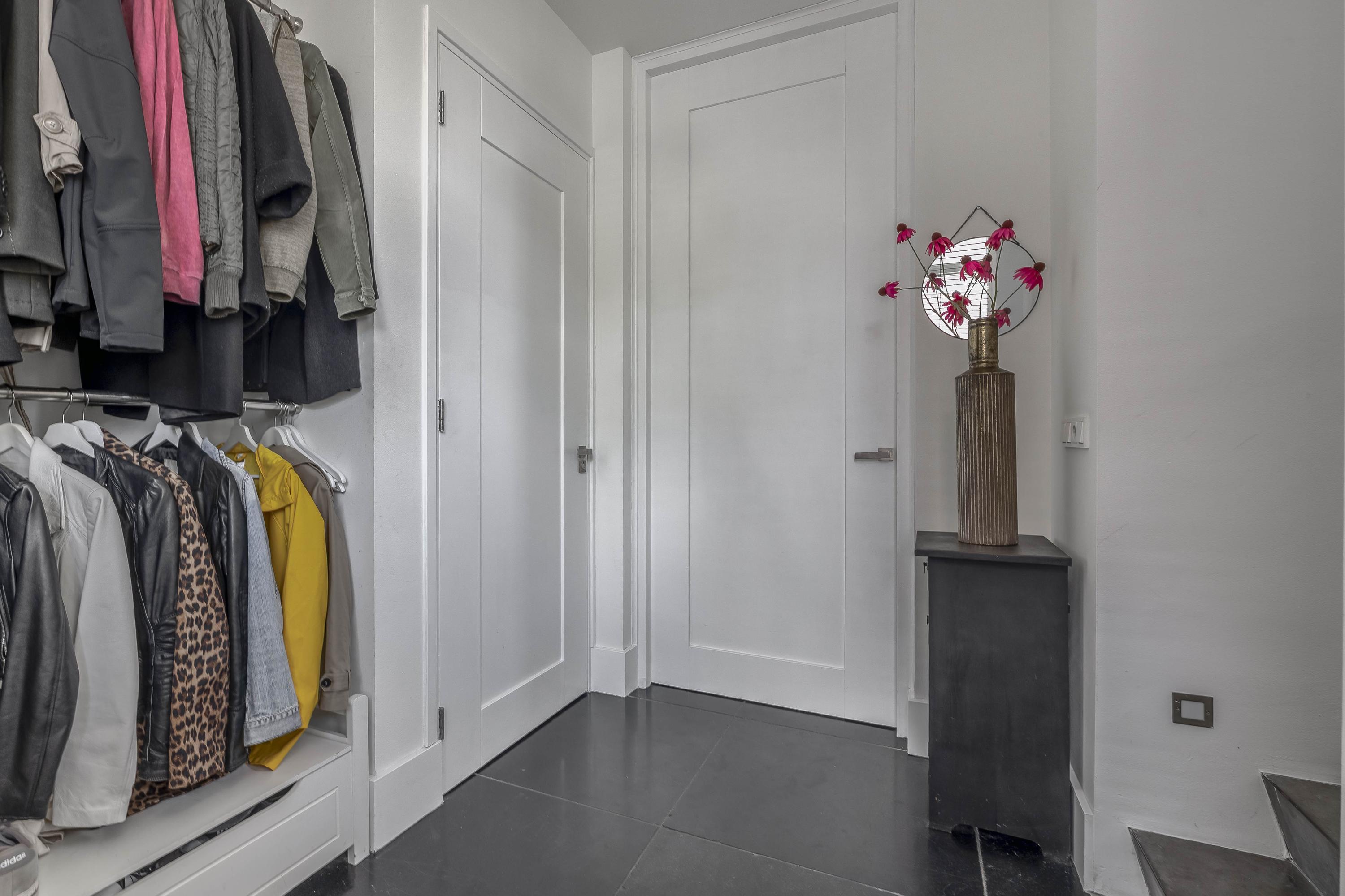 Aan de achterzijde van de woning biedt een extra portaal met kastenwand en achterdeur directe toegang tot de tuin.
