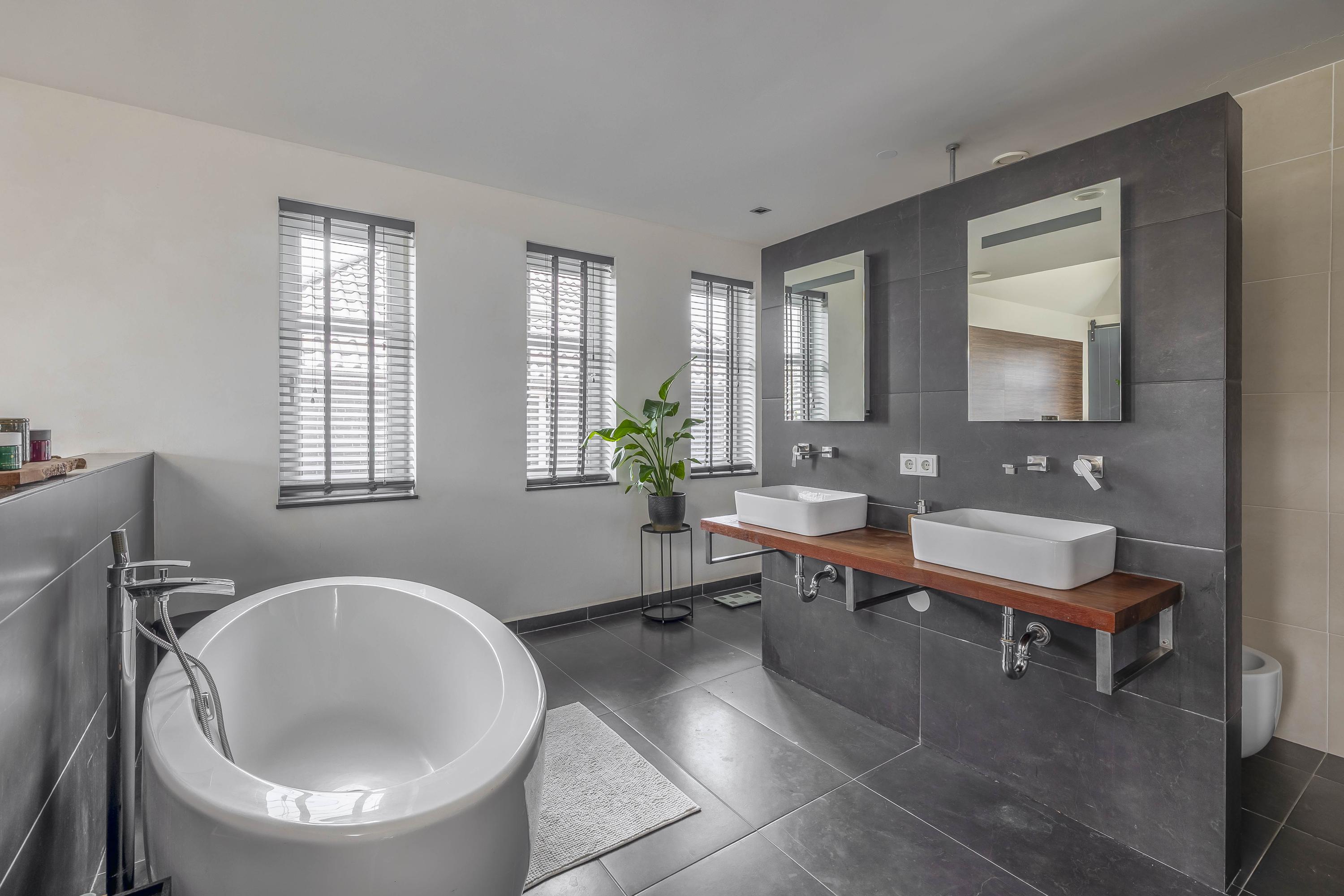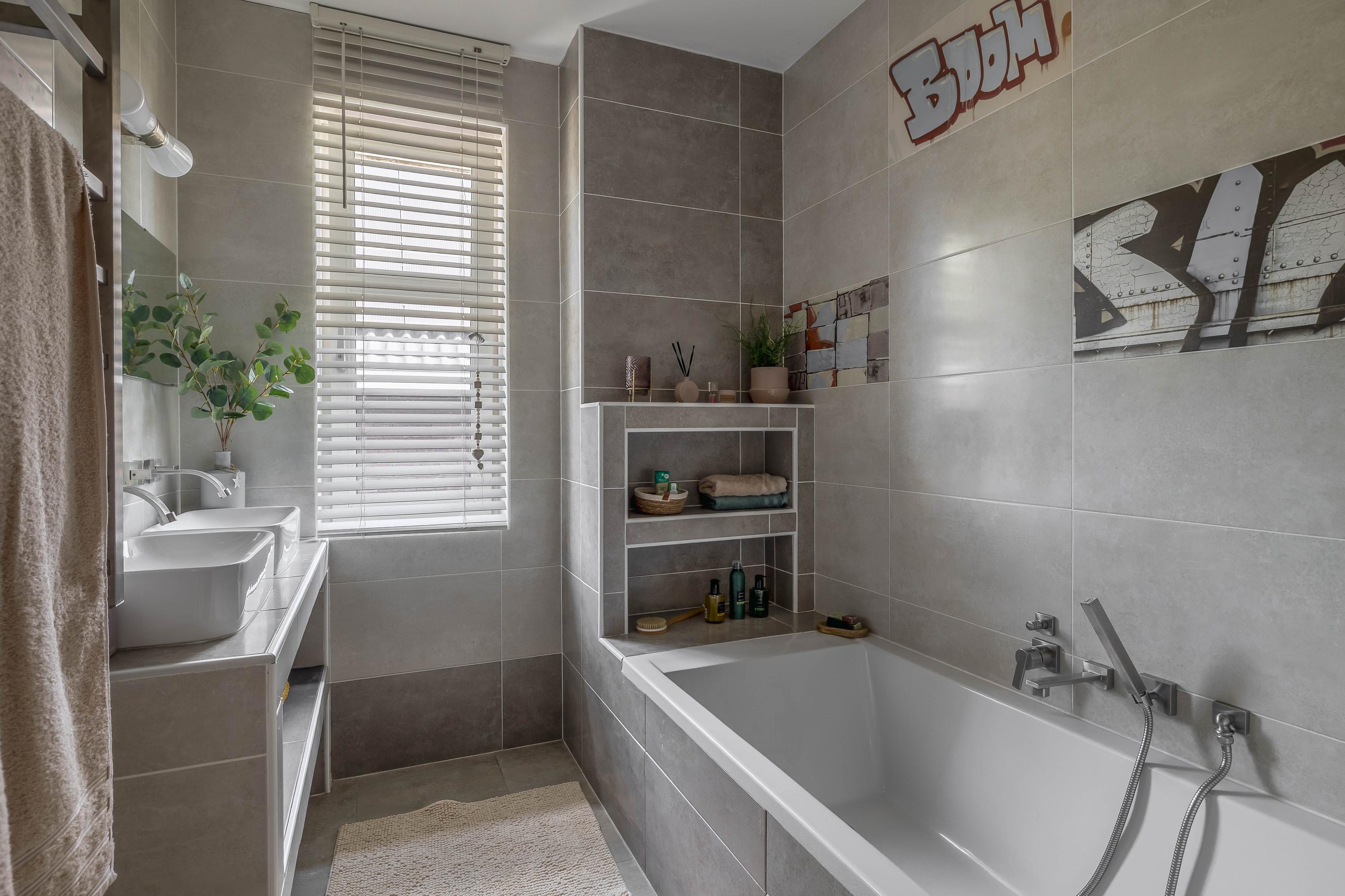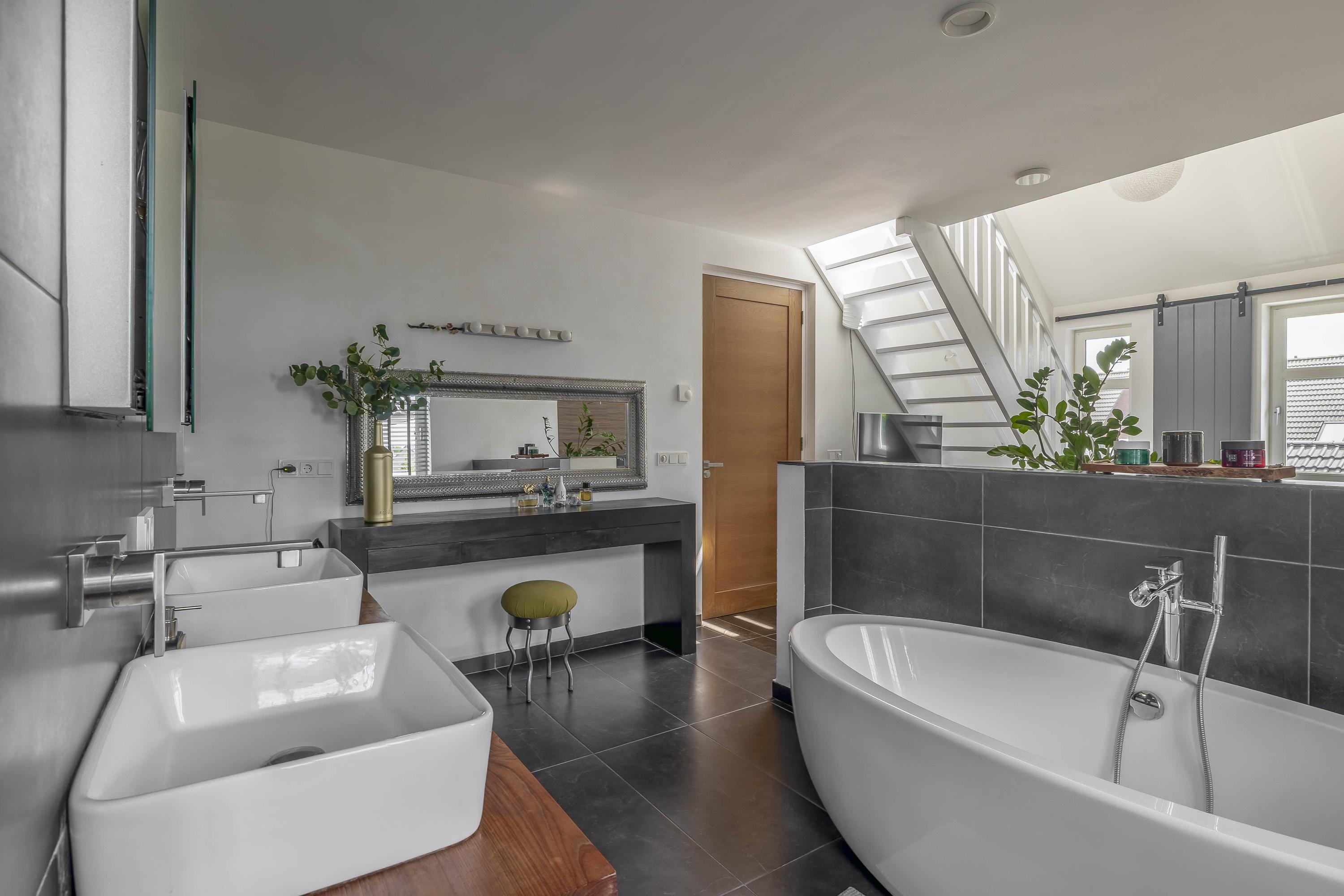 Verder beschikt de verdieping over een volledig betegelde 2e badkamer. Deze is voorzien van een ligbad met inbouwkranen, een wastafelplateau met twee waskommen en een designradiator.