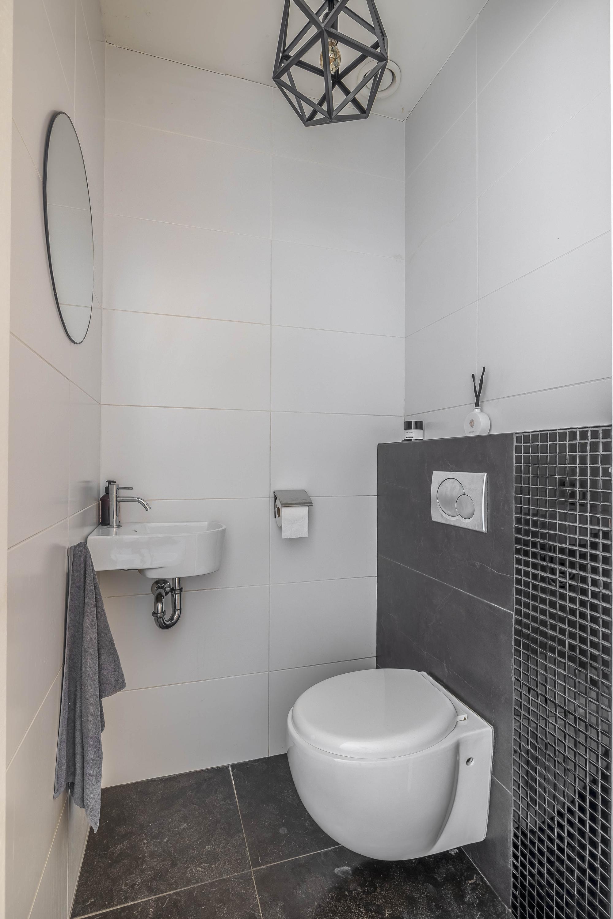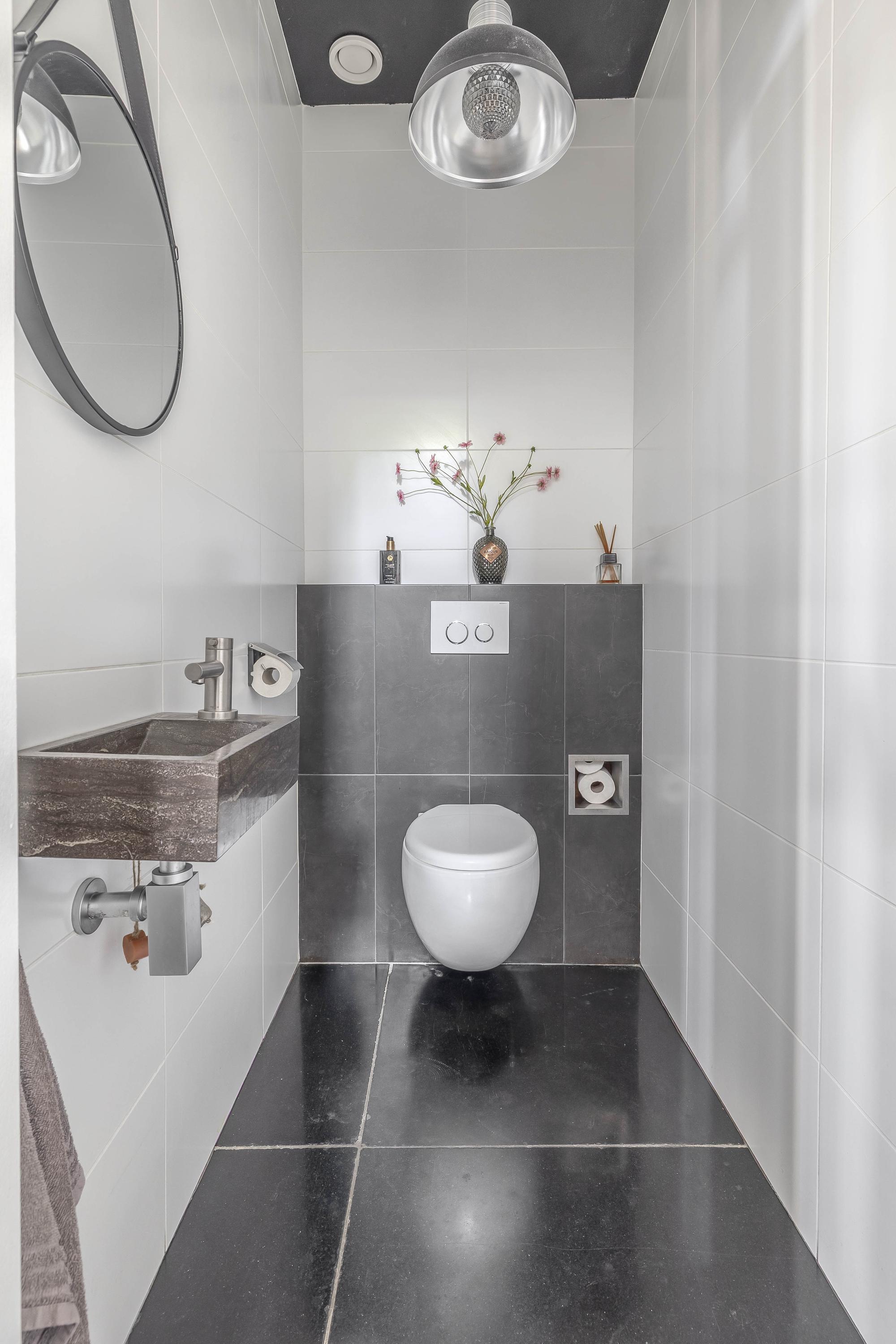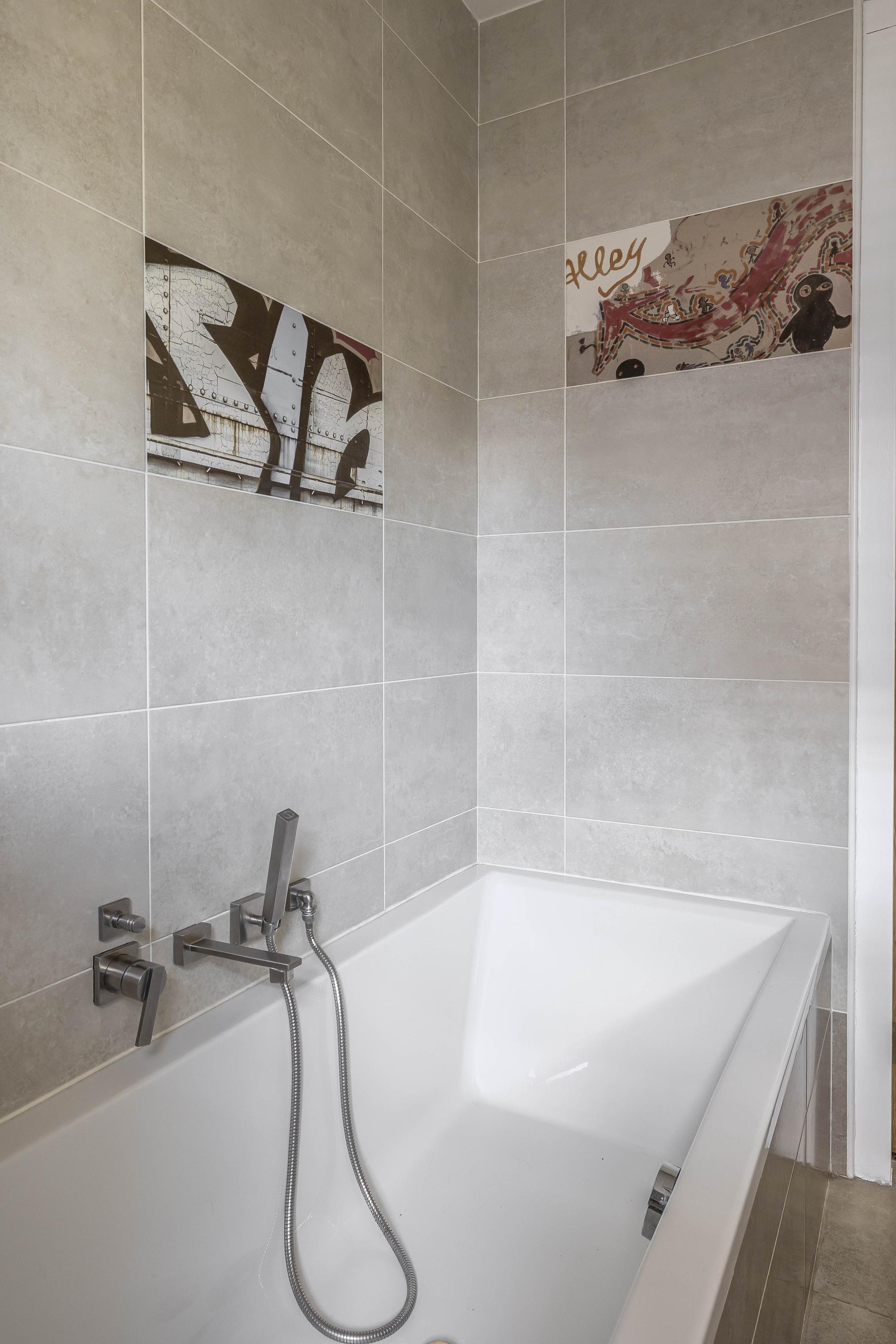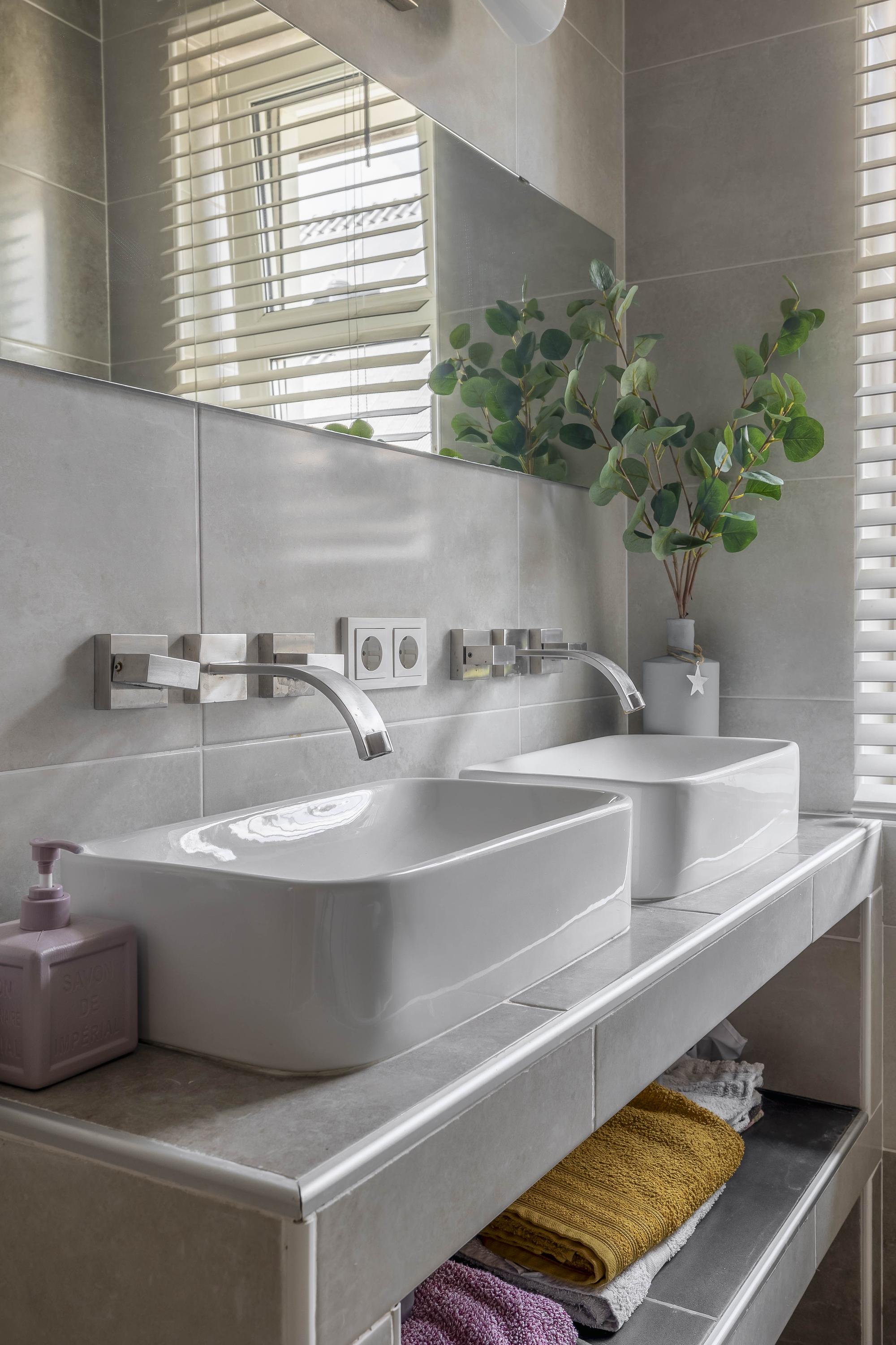Verder beschikt de verdieping over een volledig betegelde 2e badkamer. Deze is voorzien van een ligbad met inbouwkranen, een wastafelplateau met twee waskommen en een designradiator.