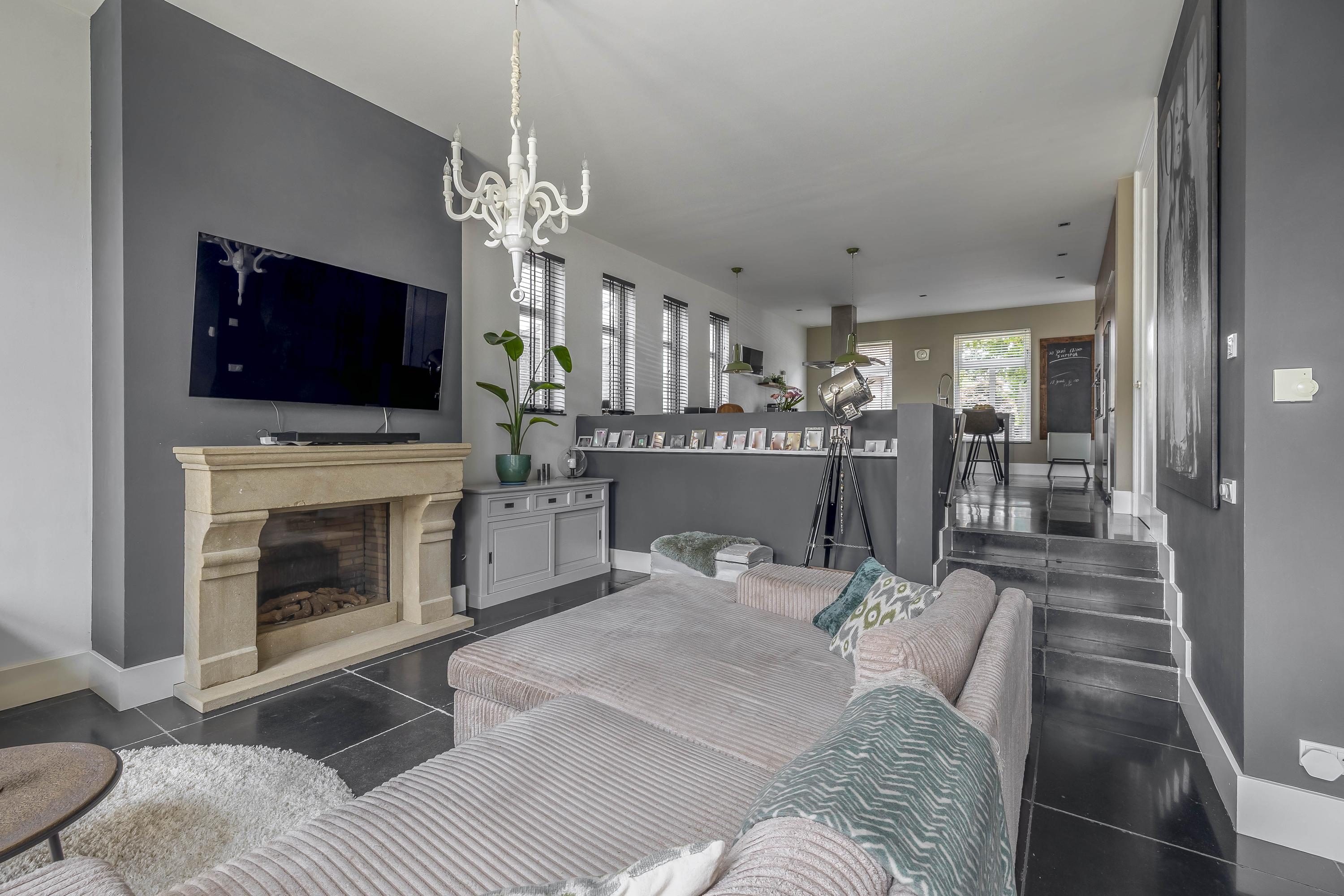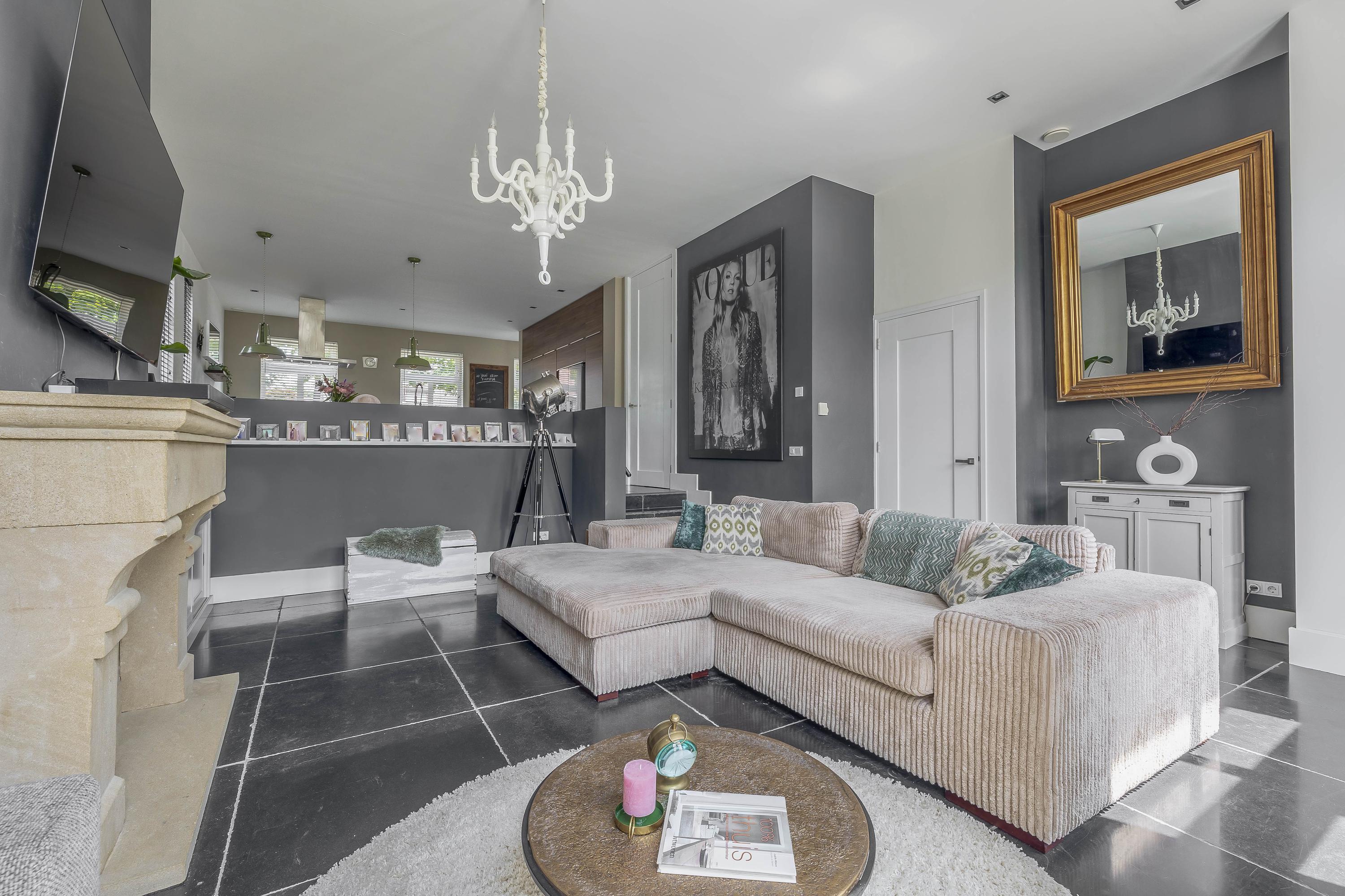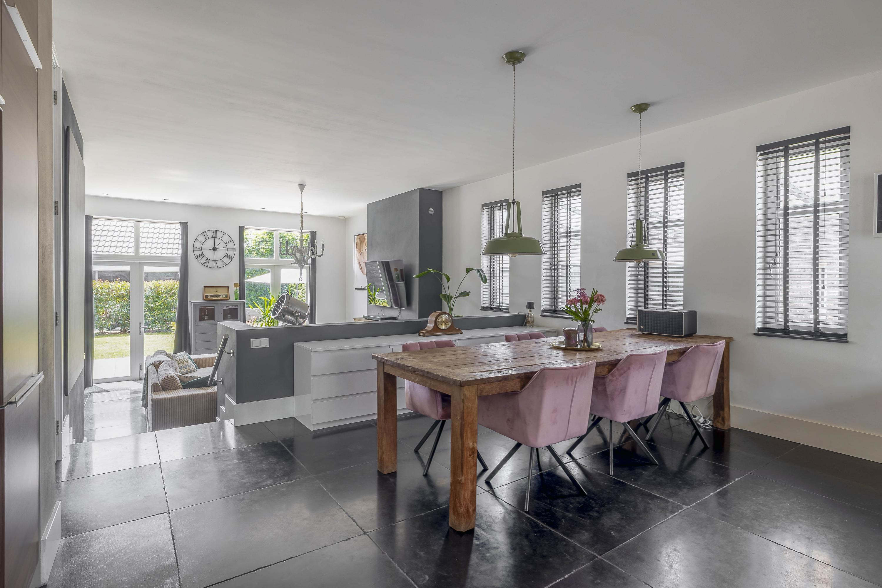 Een korte trap leidt naar de sfeervolle, royale woonkamer met indrukwekkende plafondhoogte van 3,5 meter. Grote ramen en dubbele tuindeuren zorgen hier voor een zee aan licht en directe verbinding met de tuin. Een zandstenen schouw met sierhaard maakt het plaatje compleet. Grenzend aan de woonkamer vind je een praktische speel- of werkkamer met ingebouwde kastenwand – ideaal voor kinderen of als thuiskantoor.