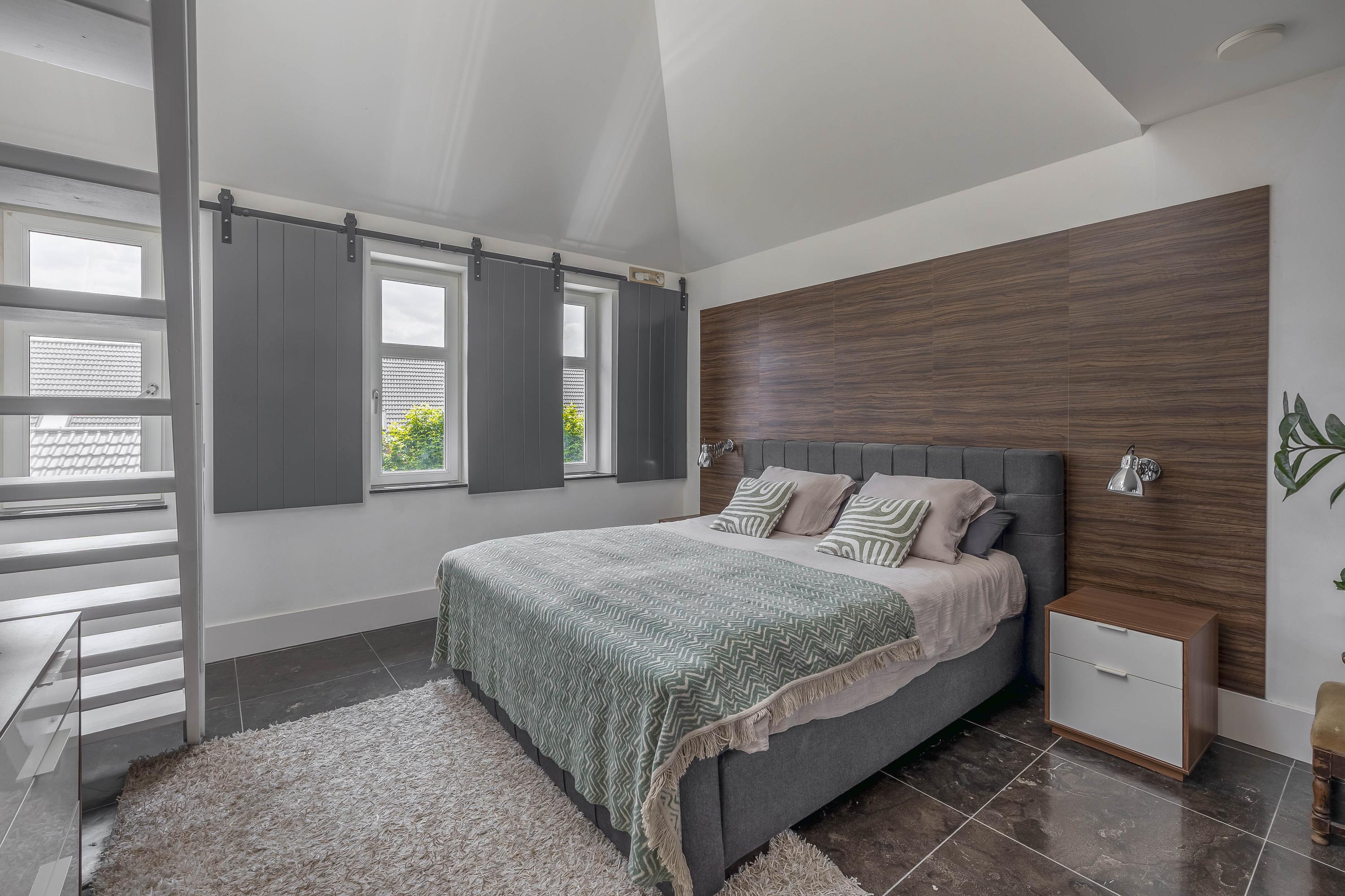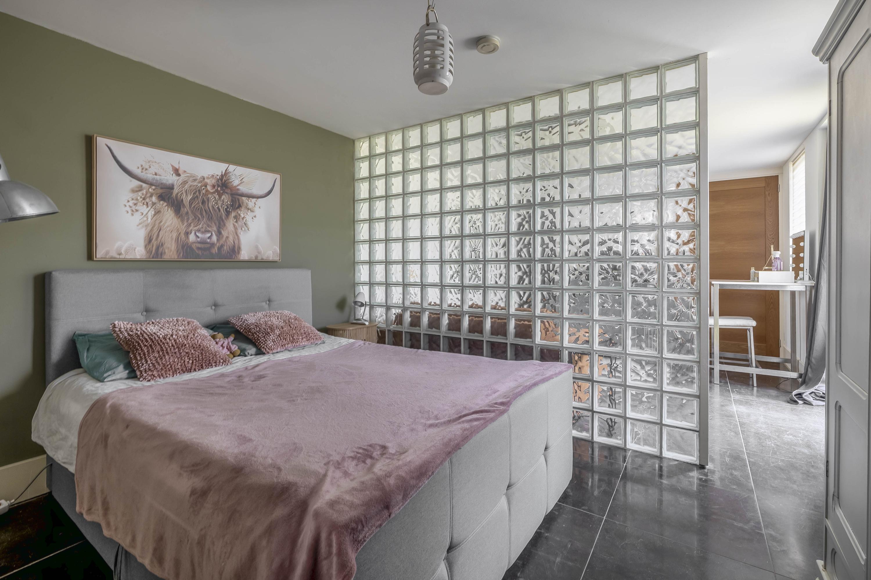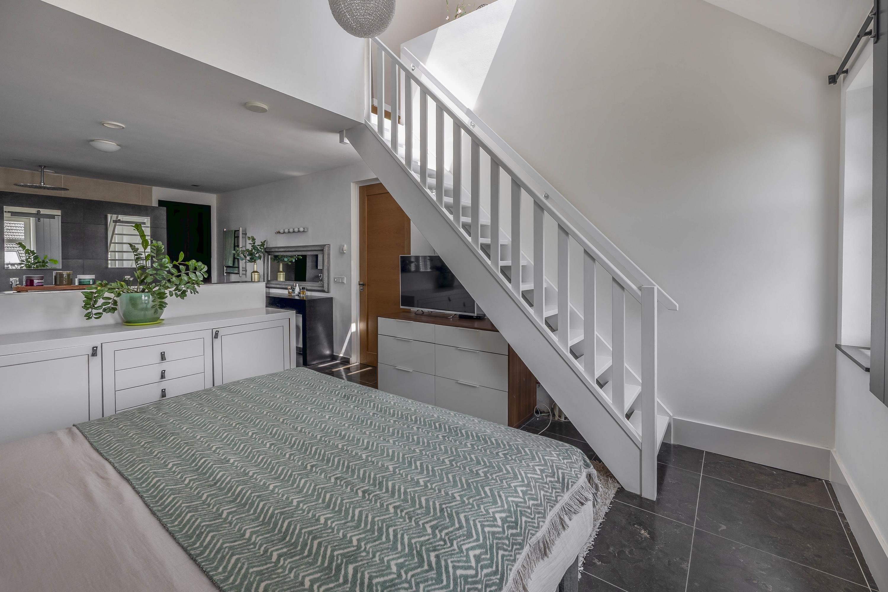Slaapkamer 1 betreft eenprachtige masterbedroom met badkamer-en-suite en een vaste trapopgang naar de tweede verdieping. Hier ervaar je een gevoel van luxe en ruimte, mede dankzij de hoge nok en smaakvolle afwerking.