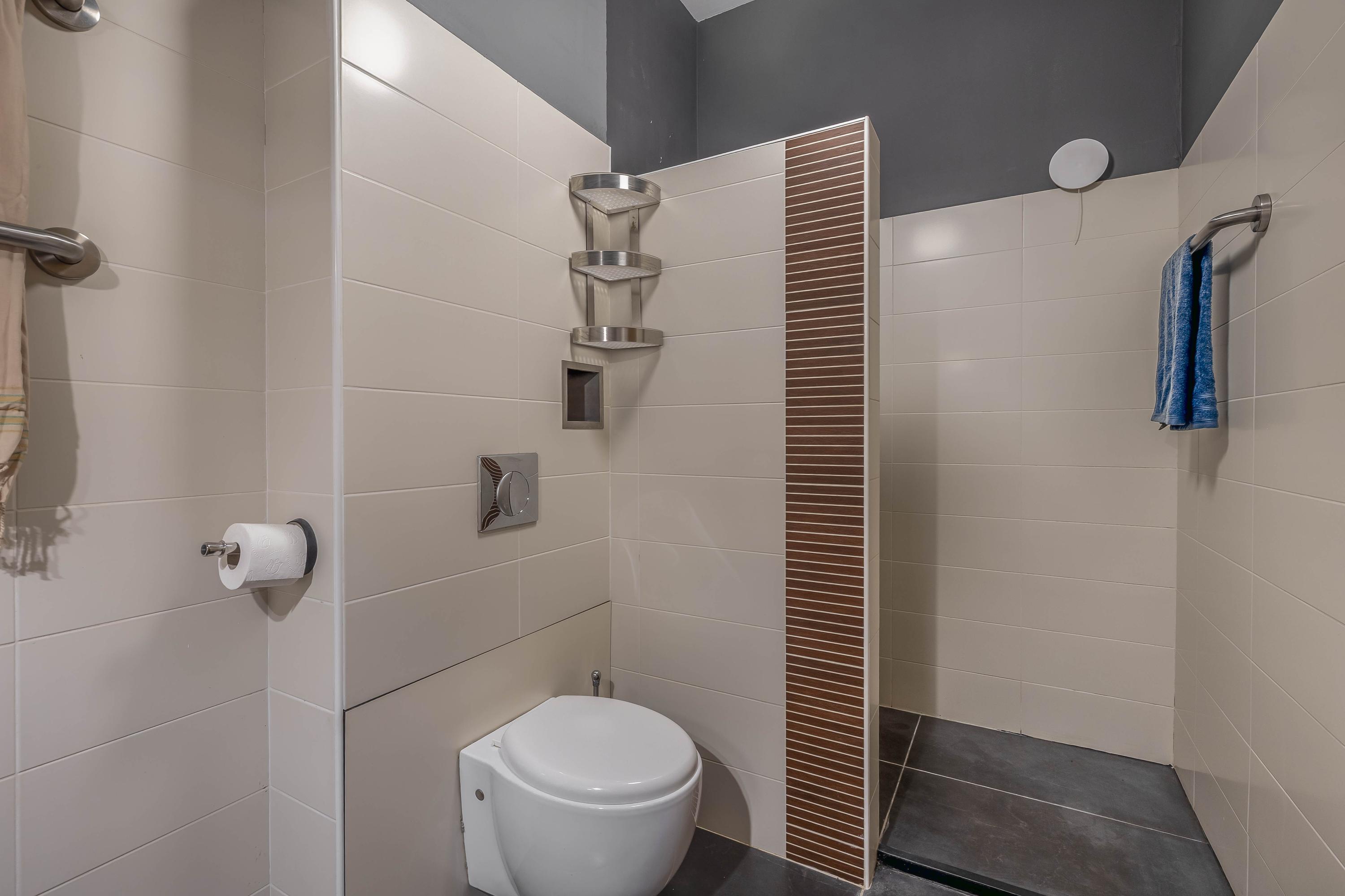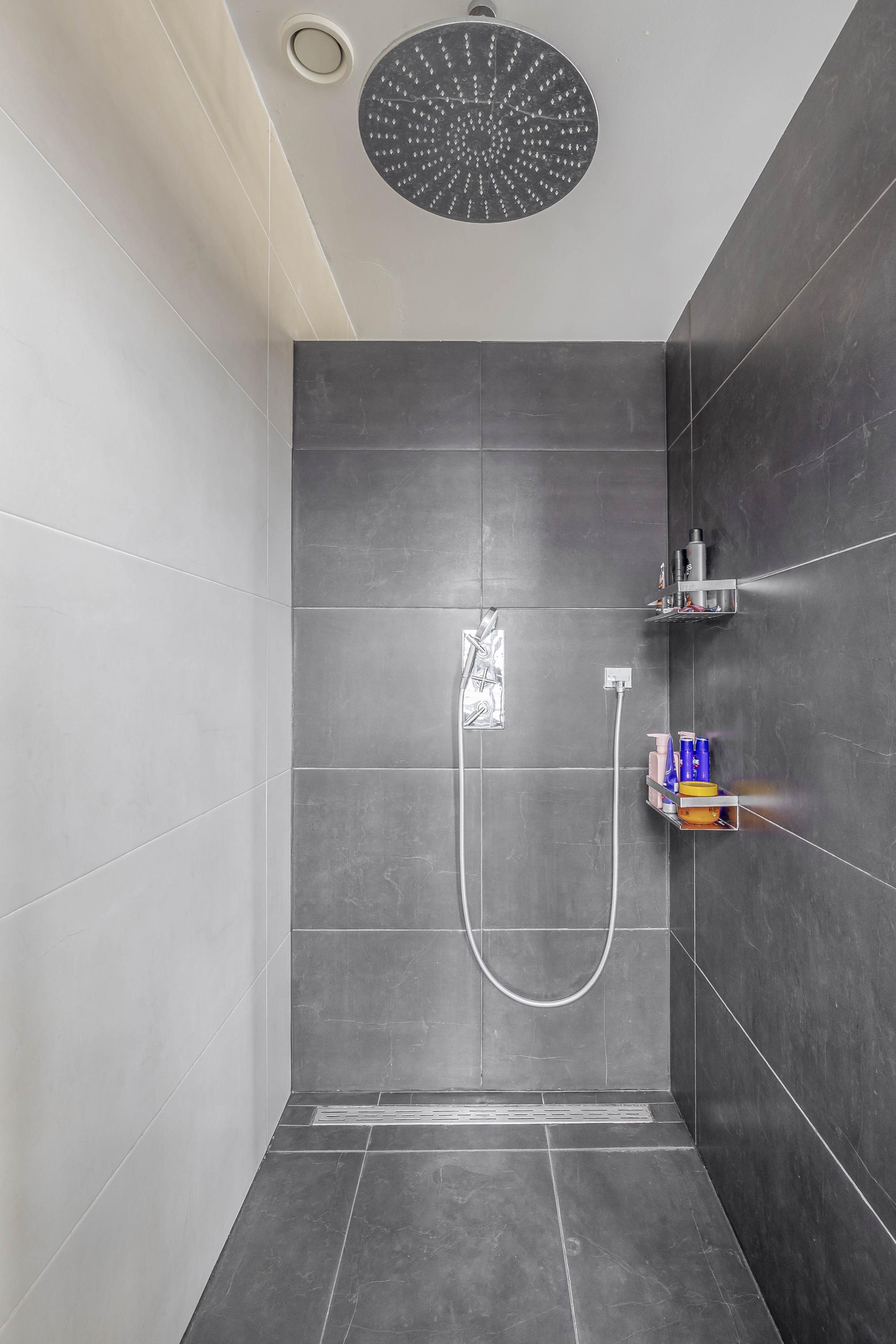 De gedeeltelijk betegelde badkamer is voorzien van een inloopdouche, wandcloset en een wastafelplateau met waskom.